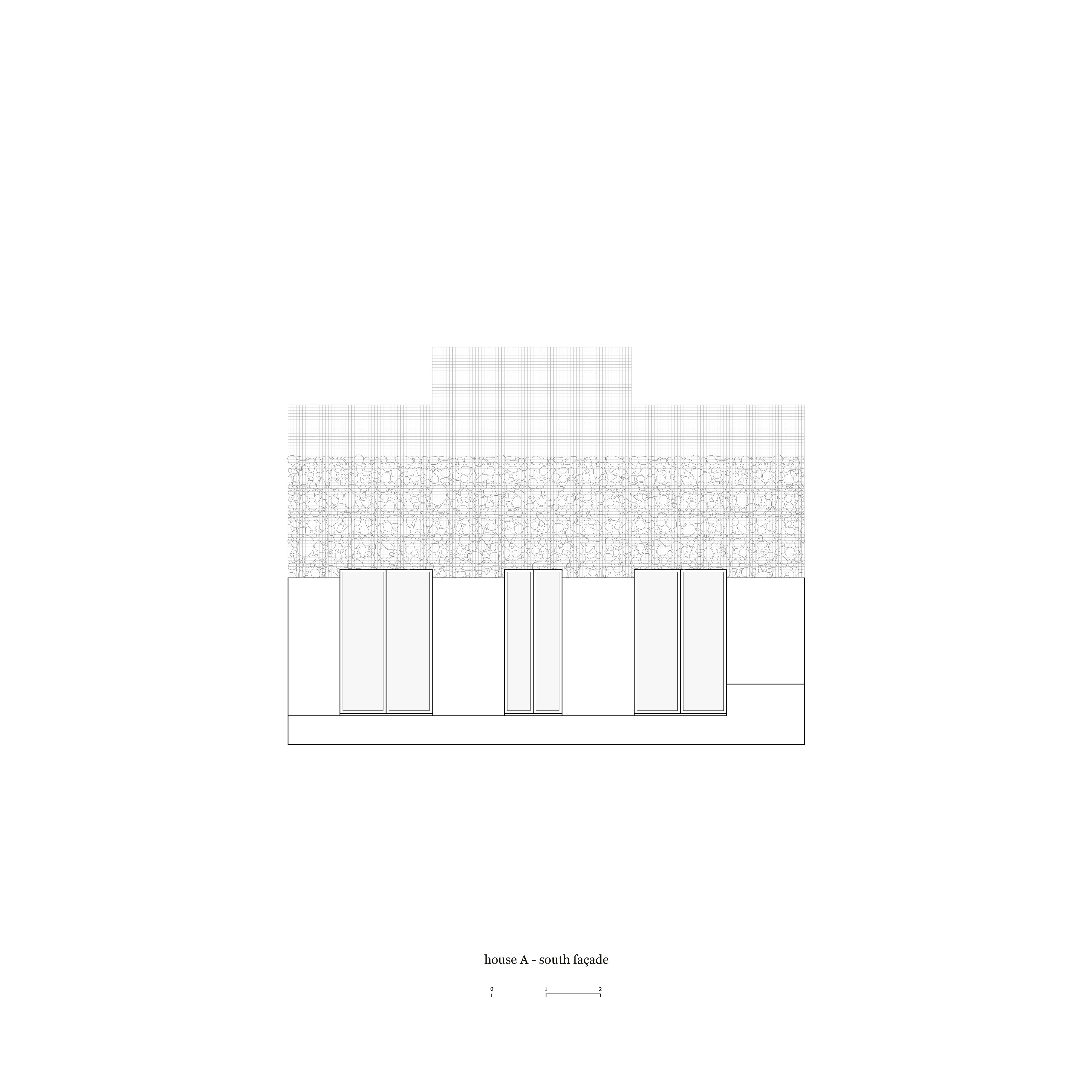 Three concrete façades of three houses are set around a courtyard. Each façade displays a different arrangement of the same constructive principle: a wall of exposed concrete rises from the ground, then, at a certain moment, a metal grid emerges from the concrete to contain a variety of local stones stacked on top of each other, until finally, the grid contains nothing but air.