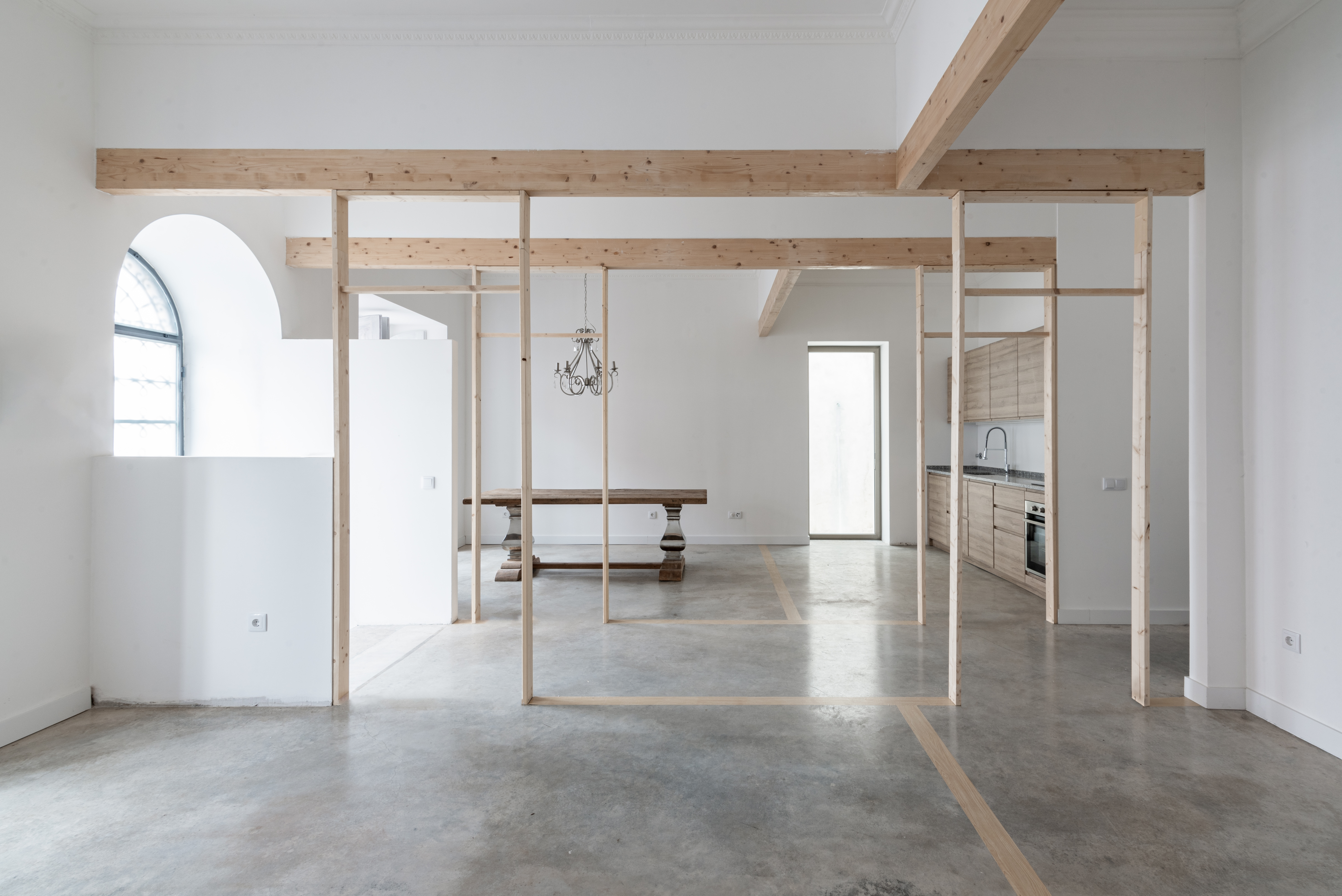 Inside, in the main house, no major changes occurred, with the exception of the removal of four walls. For each demolished wall, a line of pine wood was set on the concrete floor and four replicas of the original doorframes were placed in their exact position, emphasizing the physical absence of the walls that were once there.