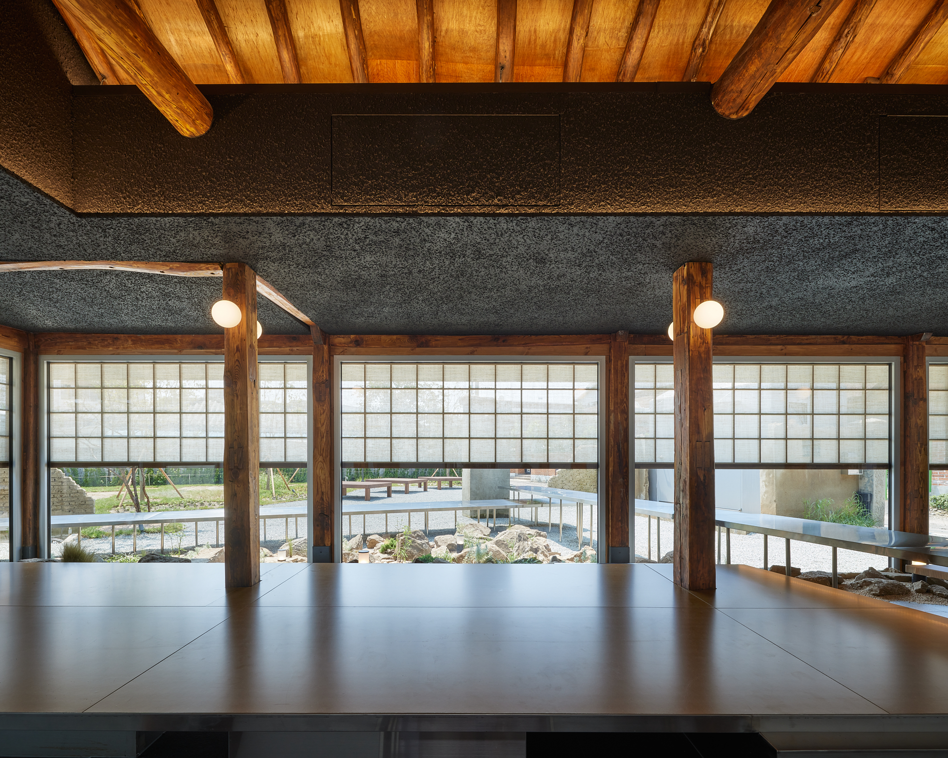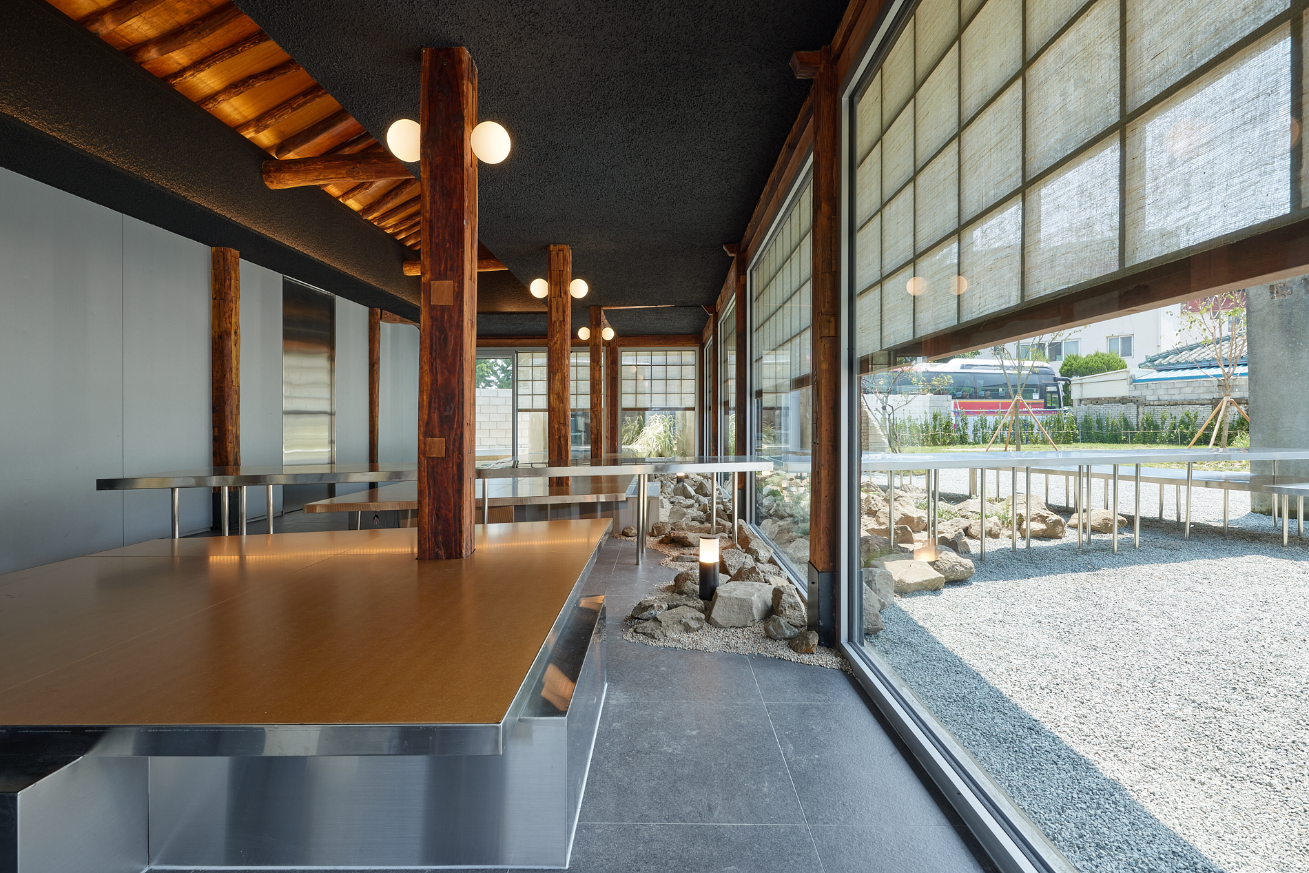 Since the exterior walls were metal, the wall between the kitchen and the hall was also metal, and the roof material was connected to the interior ceiling, implying that the internal hall was symbolically an external space, just like a traditional joomak.