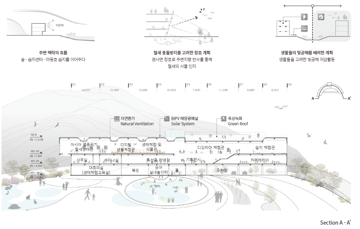 풍부한 생명력을 갖고 있으며 자연에너지가 넘치는 마동호 습지에 사람들이 모여드는 관계성과 고성의 역사적 흔적으로 현재의 문화를 담아 “자연과 문화”를 완성한다. 마동호 습지 보호구역 고유의 낭만과 옛 정취를 담은 친수 여가 공간 또는 생태교육의 장인 습지센터는 구릉지에 둘러싸인 주변 자연을 받아들여 자연과 공존하는 상징성을 강조한 입면을 디자인하였다. 건물 외부의 체험 마당이나 놀이마당과 자연스러운 연결, 조망 브리지의 연결을 통해 마동호의 습지를 조망할 수 있는 공간 등 내외부의 유기적인 연계가 가능한 공간을 구성한다. 또한, 깃대종과 같은 주변 자연 요소를 모티브로 한 친환경 파사드를 통해 주변 지역과의 일체감을 극대화한 디자인을 통해서 마동호 하구 습지가 지니는 생태적, 사회경제적 중요성의 활성화 플랫폼을 제안한다.