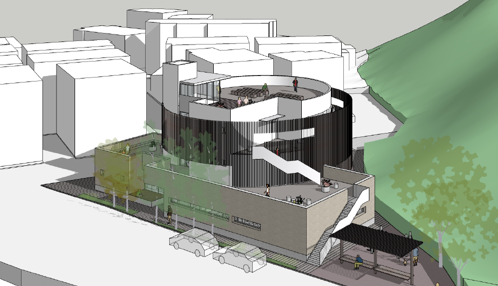 가로변에서 조금 물러난 원형 매스는 부담스럽지 않게, 마을의 상징적 요소로 자리한다. 외부에서 바라보는 이 곳은 주민들이 바라보는 어느 곳에서나 전면성을 띄며, 집중된다. 안에서 바라보는 마을은 다방향적이다. 샘내마을의 모습과 주변의 풍부한 자연환경을 다양한 시각으로 관찰하고 머물 수 있는 장소를 제공한다.