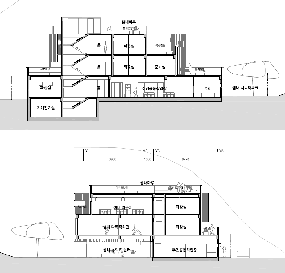1층에 주민공동작업장은 가로변 측에 대응 배치하여, 지나가는 주민들의 관심을 유도한다. 2층, 3층의 샘내다목적회관과 샘내라운지는 남측에 배치하여 루버 사이로 채광이 용이하다. 층별로 외부공간을 내부와 연계하여 조성하였다.