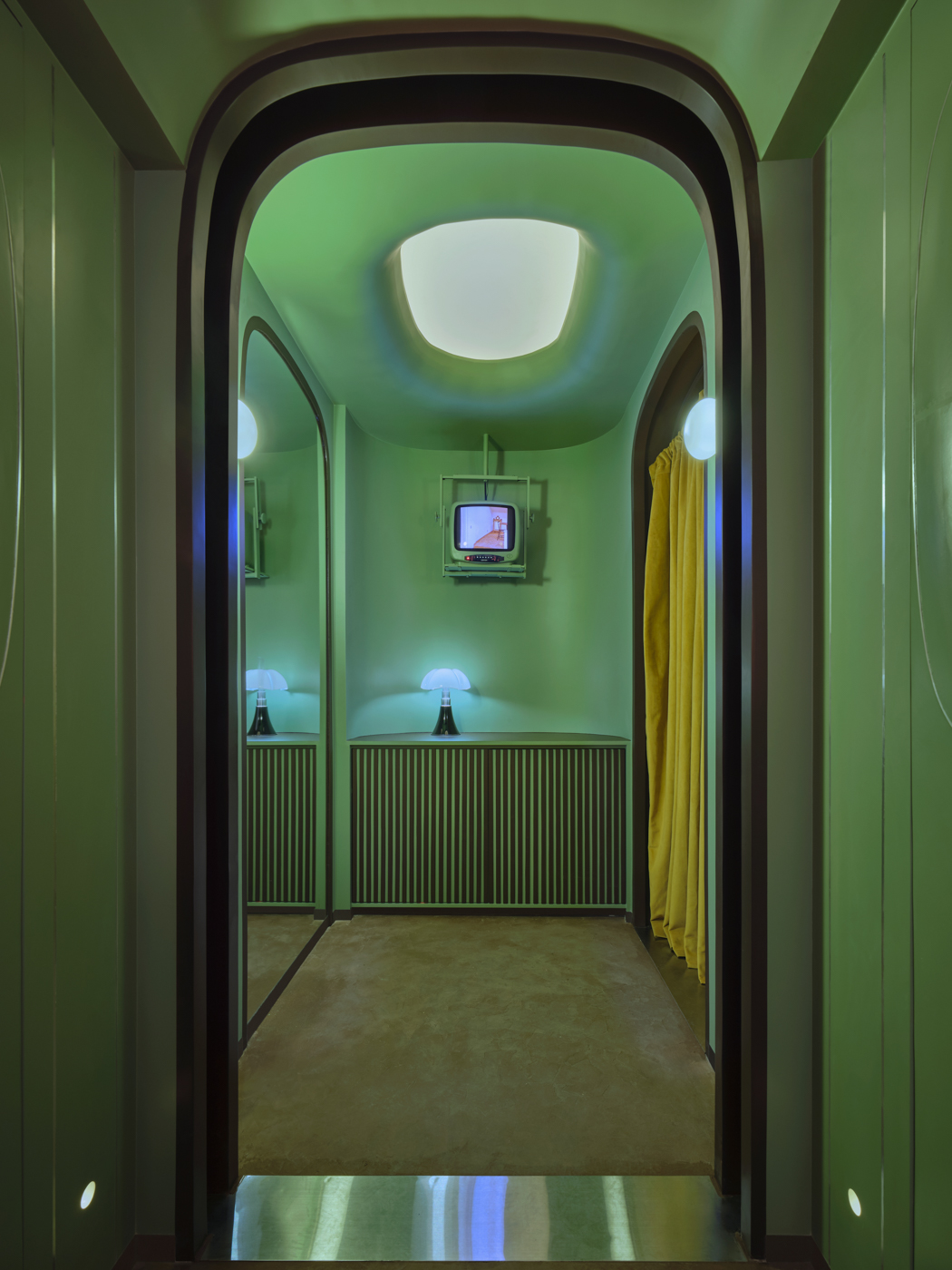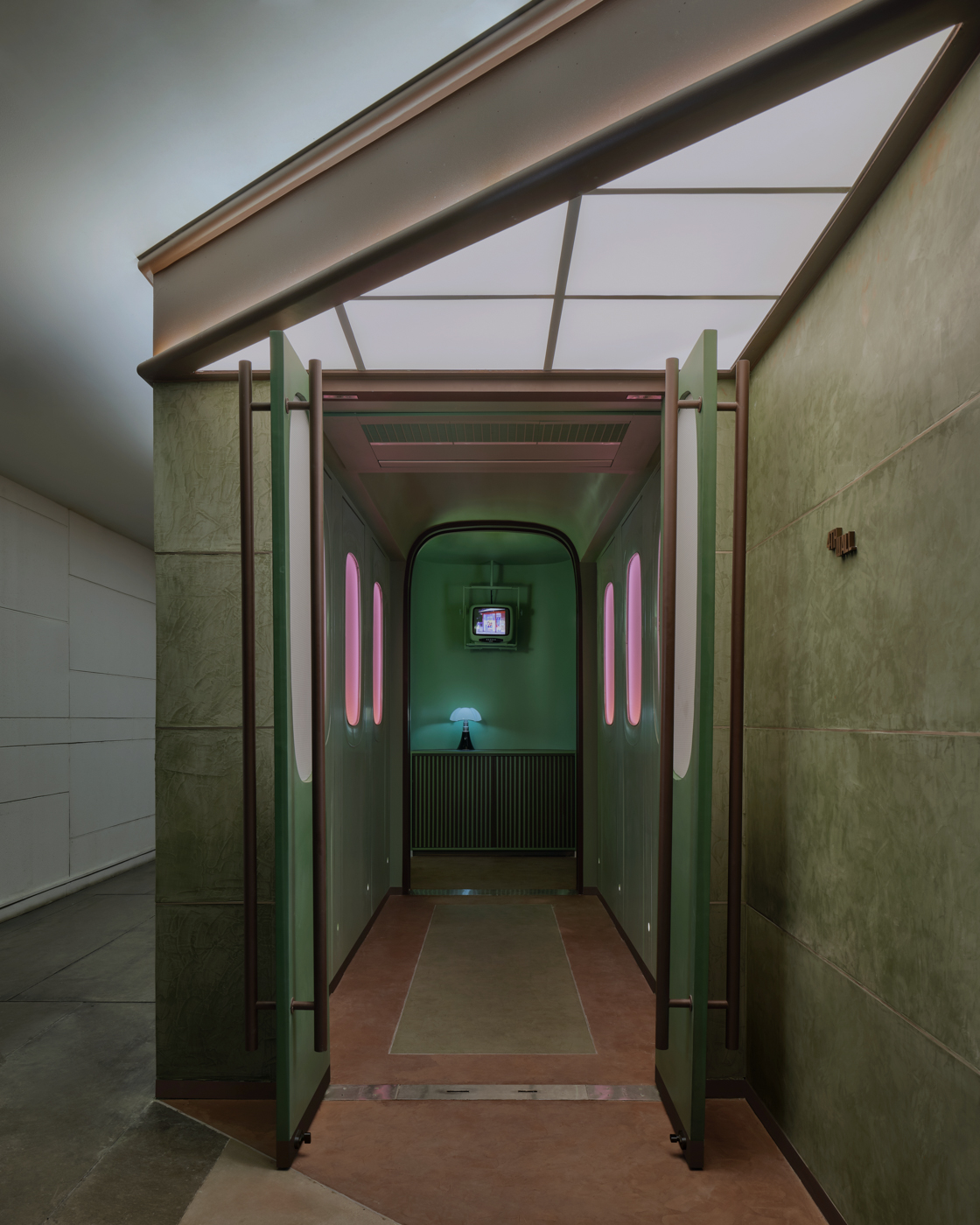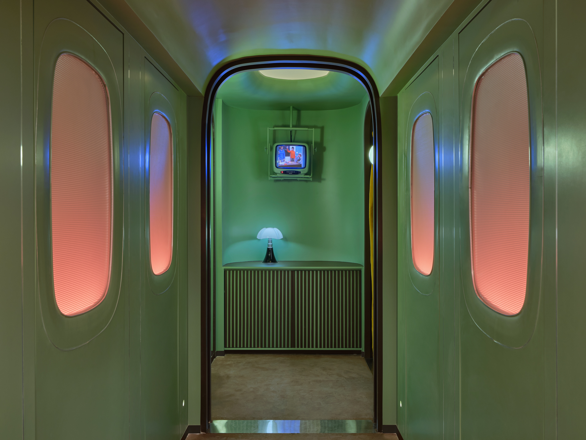 내부는 60년대 영화관을 연상시키는 입구로 시작해 고객을 다른 시대로 이동시키는 복도로 이끈다. 내부에는 중앙 바가 바텐더와의 대화를 유도해 구심점이 된다. 바우하우스-모던-브루탈리즘-포스트모던 디자인의 영향은 레트로퓨쳐리즘의 개념을 형성한다. 브루탈리즘과 포스트모더니즘에 영향을 받은 오렌지 그린 색상과 콘크리트 질감의 소재는 장난스럽고 날 것 같은 분위기를 만든다. 디자이너는 60년대에 플라스틱이 널리 사용되었음을 상징하는 고광택의 복고풍 TV를 복도를 따라 사용한다. 아크릴과 틴티드 글라스가 공간을 장식하여 활기차고 산광 조명을 제공한다. 바 안의 조명은 크롬으로 코팅된 전구를 사용하여 분위기를 조절함으로써 60년대 조명을 모방한다. 커브드 글라스 프레임, TV 세트, 폴, 바 등 60년대 TV에서 파생된 형상은 곡률과 기하학적 형상이 조화를 이뤄 60년대 미학에 대한 새로운 시각을 제시한다.
