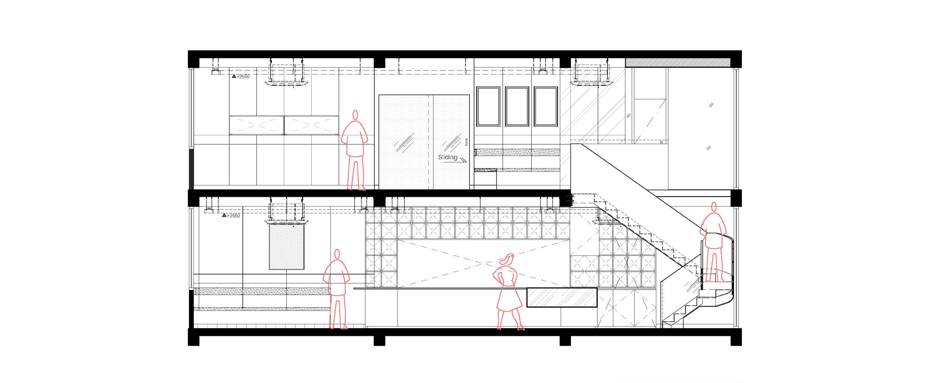 Throughout the day, the space functions as a café and transitions into a bar at night. Open light spaces are designed to foster an inviting atmosphere during both daytime and nighttime. The consistent gray color scheme maintains a connection to the original shop, while the use of brick flooring adds vibrancy. The incorporation of windows and curved glass provides extra seating and captures the vibrant atmosphere of Ari Lane during the evening. In essence, the concept revolves around adaptability and growth, offering a dynamic space that caters to varying needs throughout the day and night. It fosters an engaging ambiance and allows for ongoing development to accommodate the changing environment.