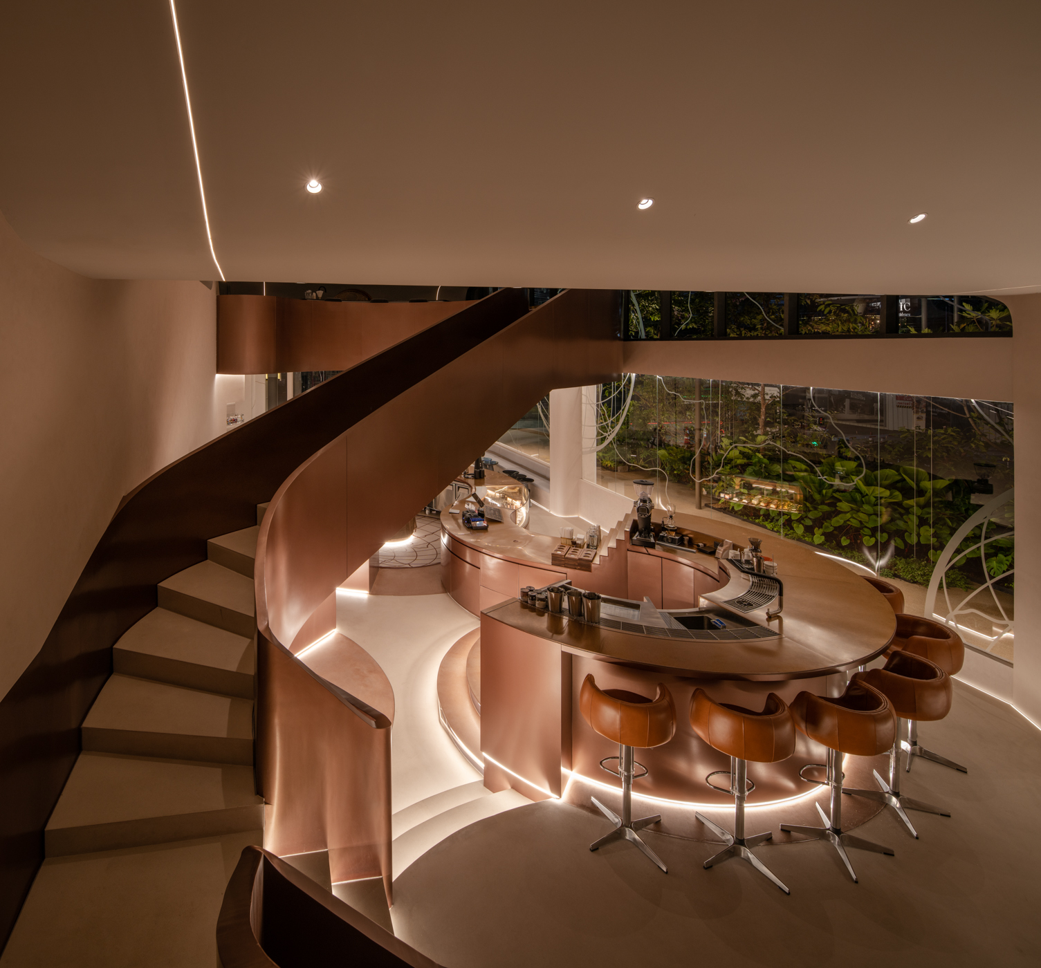 This concept replaces the three-leaf world (Past/Present/Future) with a world of Coffee/Customer/Cocktail, emphasizing products and functionality. Three counter designs are introduced: Coffee Counter, Welcome Counter, and Cocktail Counter, all united by a circular function design. The central location of these counters serves staff, bartenders, and baristas, creating a focal point resembling a stage visible from any part of the shop.