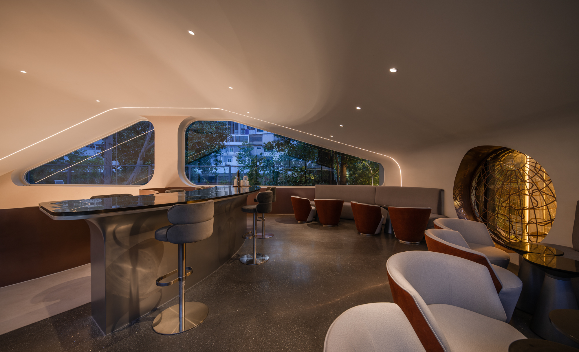 프로젝트의 도전적인 부분은 시각적으로 매력적인 디자인을 유지하면서 직원들에게 편리한 기능을 제공하는 것이다. 카운터는 태양 고리처럼 작용하여 카운터의 시야를 태양계처럼 확장한다. 매장 내부의 분위기와 톤은 밝은 색상에 초점을 맞추고 있으며 카운터와 계단을 돋보이게 하기 위해 갈색 메탈 느낌을 강조했다.