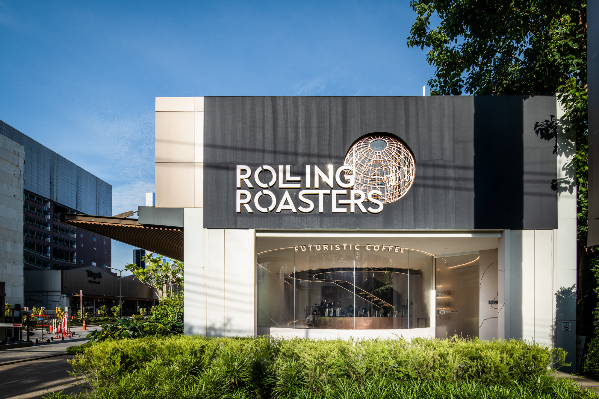 Rolling Roaster, a coffee shop from Phran Nok, is planning to expand with its third branch located in The Earth Ekamai project. The project allocates surrounding spaces, and all architects, but the shop's interior and certain external areas are designed by TasteSpace. The owner's challenge is to expand the shop into the city, providing a new dining experience from daytime to nighttime, combining coffee and cocktails. The main theme is "Future Comfort and New Experience." Building on the concept of Third Wave Coffee, Taste Space proposes a new idea called "Parallel World," a world that runs parallel to ours but in the opposite direction, yet still within the same timeframe.
