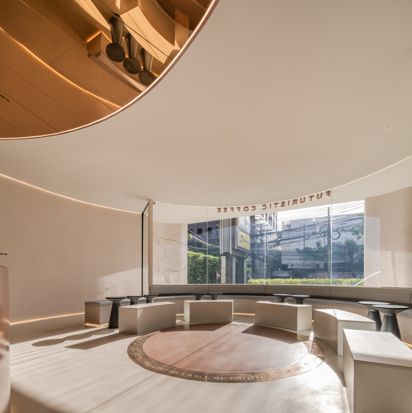 This concept replaces the three-leaf world (Past/Present/Future) with a world of Coffee/Customer/Cocktail, emphasizing products and functionality. Three counter designs are introduced: Coffee Counter, Welcome Counter, and Cocktail Counter, all united by a circular function design. The central location of these counters serves staff, bartenders, and baristas, creating a focal point resembling a stage visible from any part of the shop.