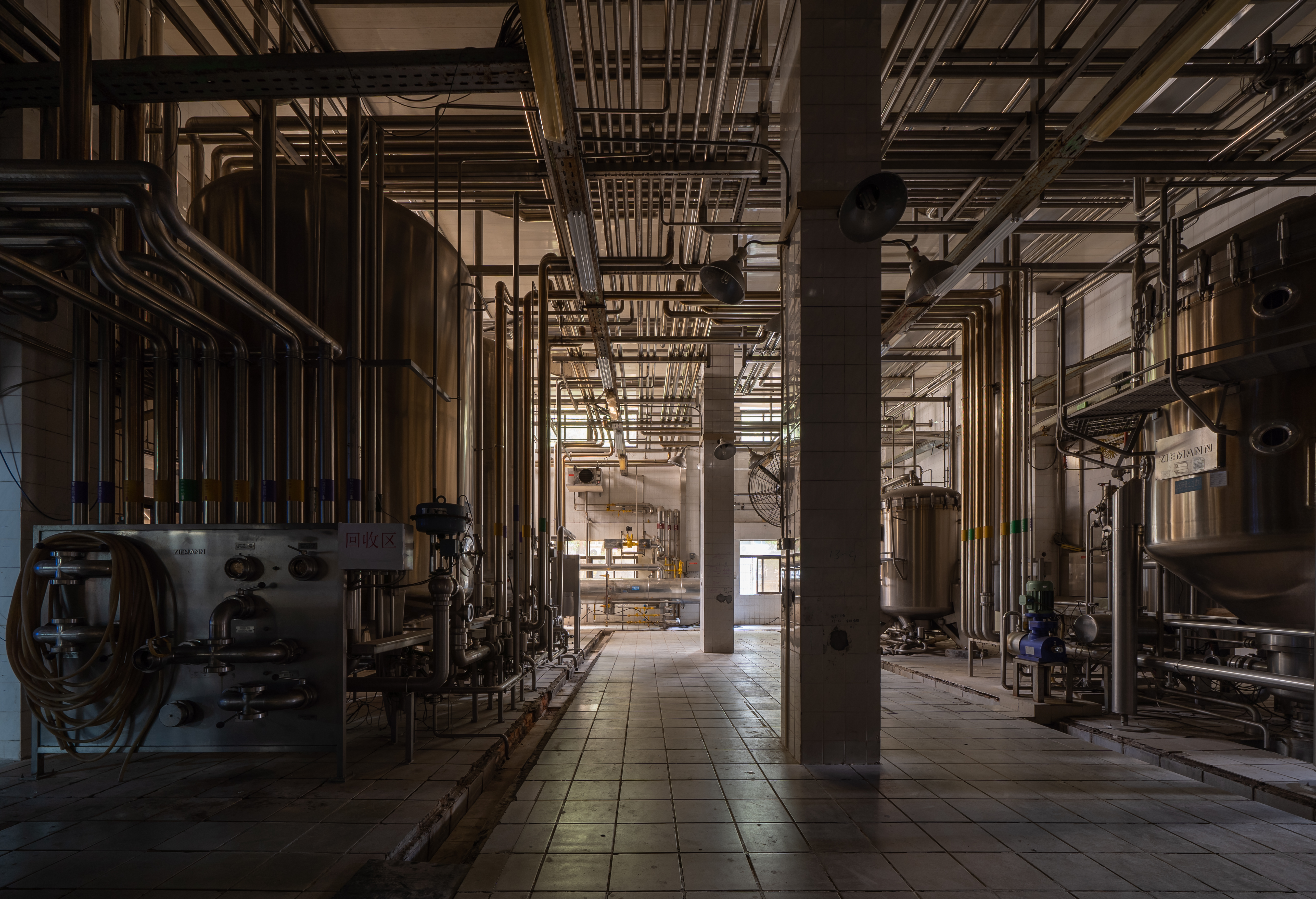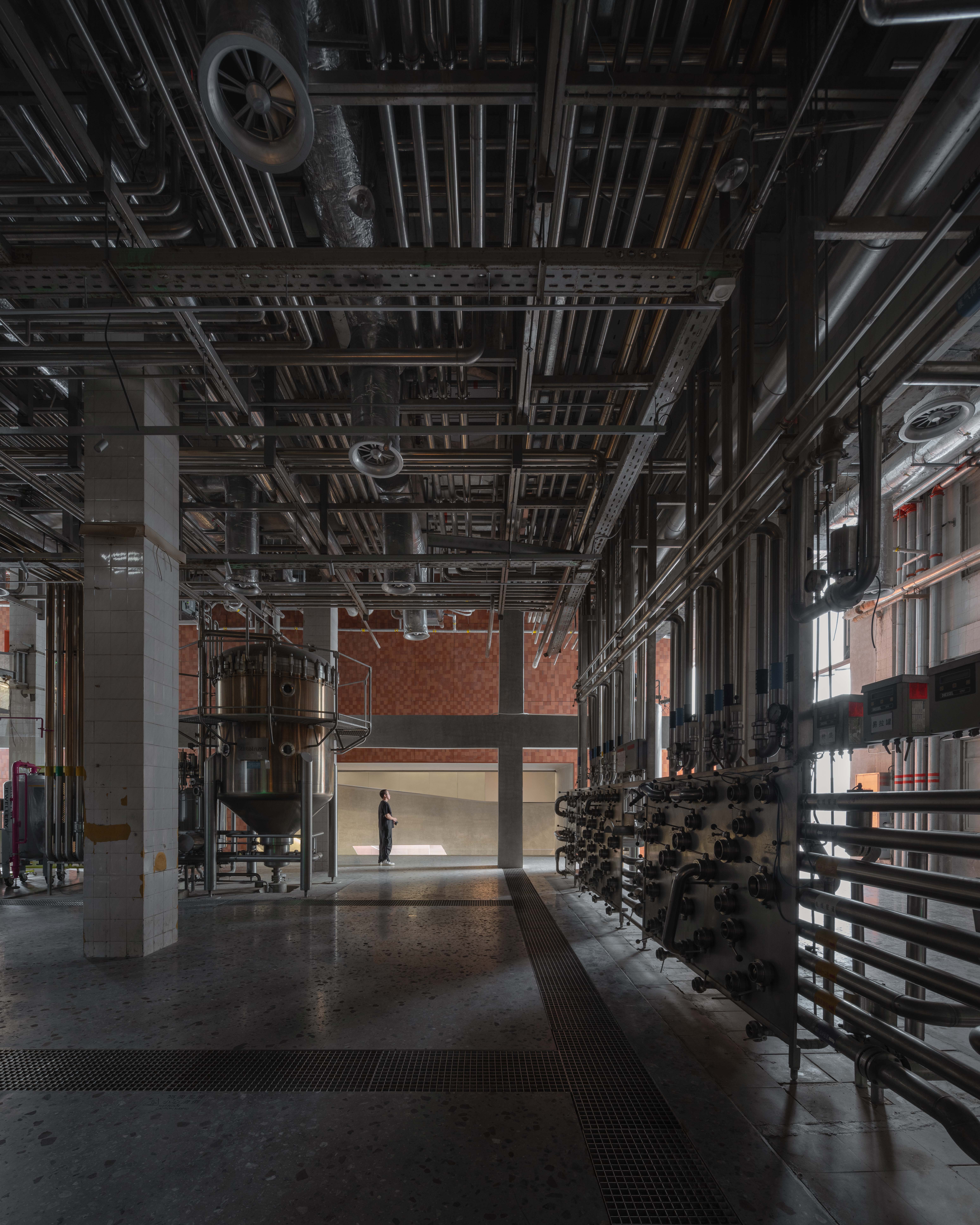 The project’s approach was characterized by minimal intervention, striving to retain the brewery's authentic elements while integrating contemporary features. The D2 exhibition space, formerly a fermentation tank workshop, has been meticulously preserved, maintaining its intricate network of pipelines and tanks. This space now serves as a living museum, embodying the brewery's extensive history and its role in the early stages of Shenzhen's development. Restoration efforts were conducted with archaeological precision, emphasizing the conservation of original features such as stainless-steel brewing equipment and vintage wall and floor tiles. Damaged areas on these tiled surfaces underwent a restoration process inspired by Kintsugi, utilizing golden mortar to accentuate repairs, symbolizing the brewery's golden era.