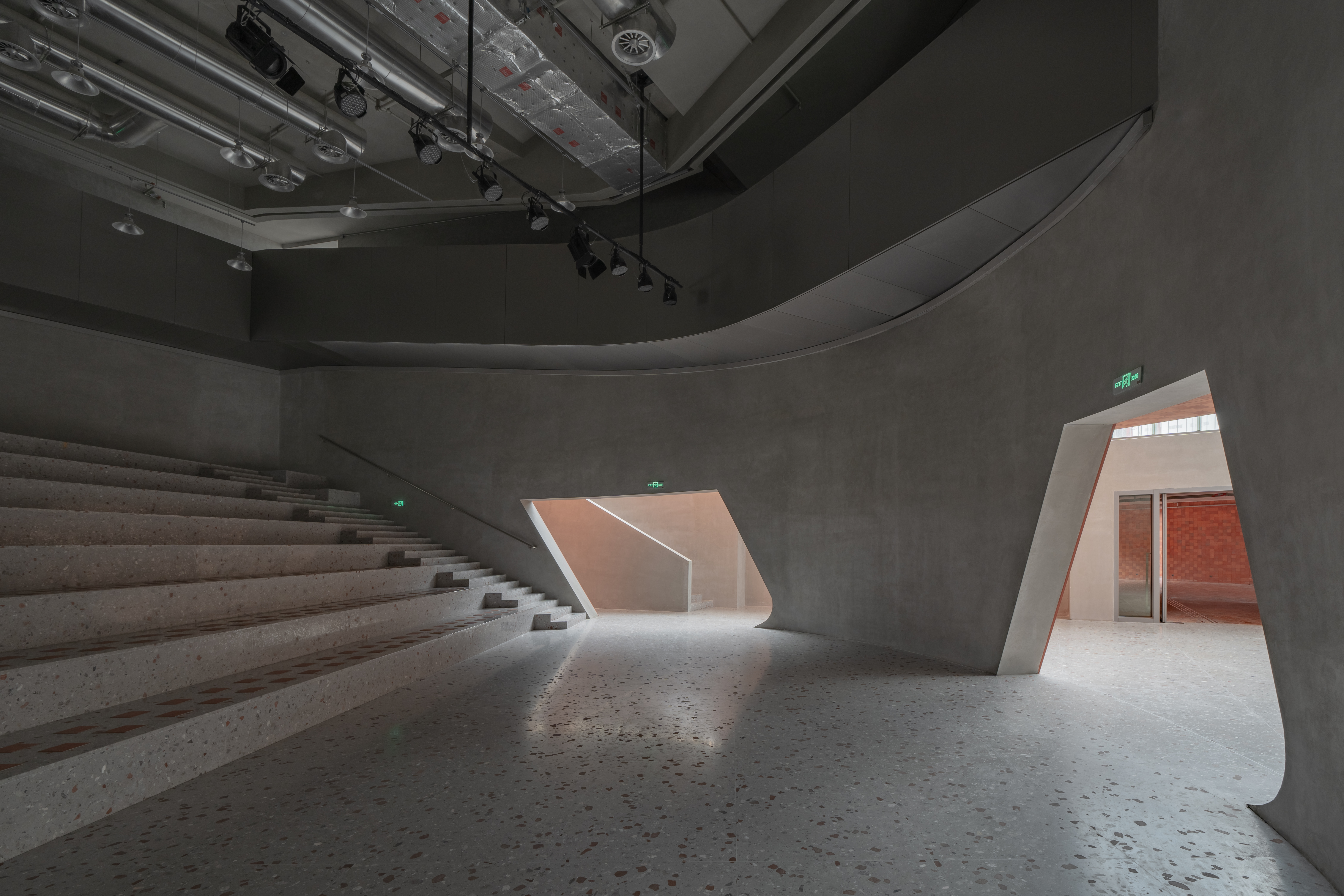 The project innovatively repurposed existing materials to highlight the contrast between the old and the new. For example, old metal windows were transformed into fiberglass-reinforced concrete "windows, " preserving historical traces through creative means. The addition of new spaces, such as an auditorium, incorporates industrial architectural elements such as the factory lights, exposed ceiling with HVAC pipe and ducts, raw concrete, and materials that reflect the site's original purpose, such as stainless steel, white tiles and warm red ceramic panels, bridging the past and present.