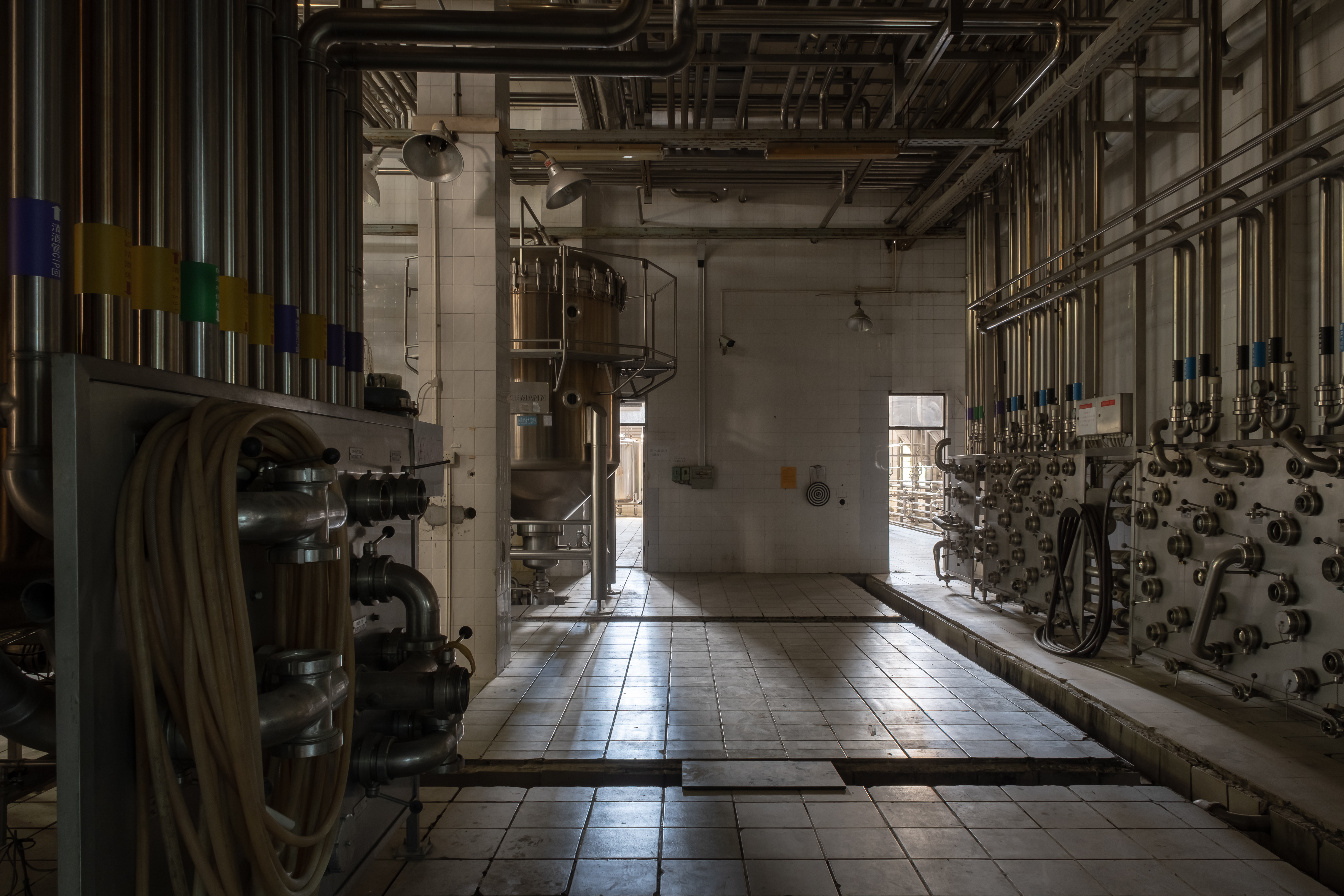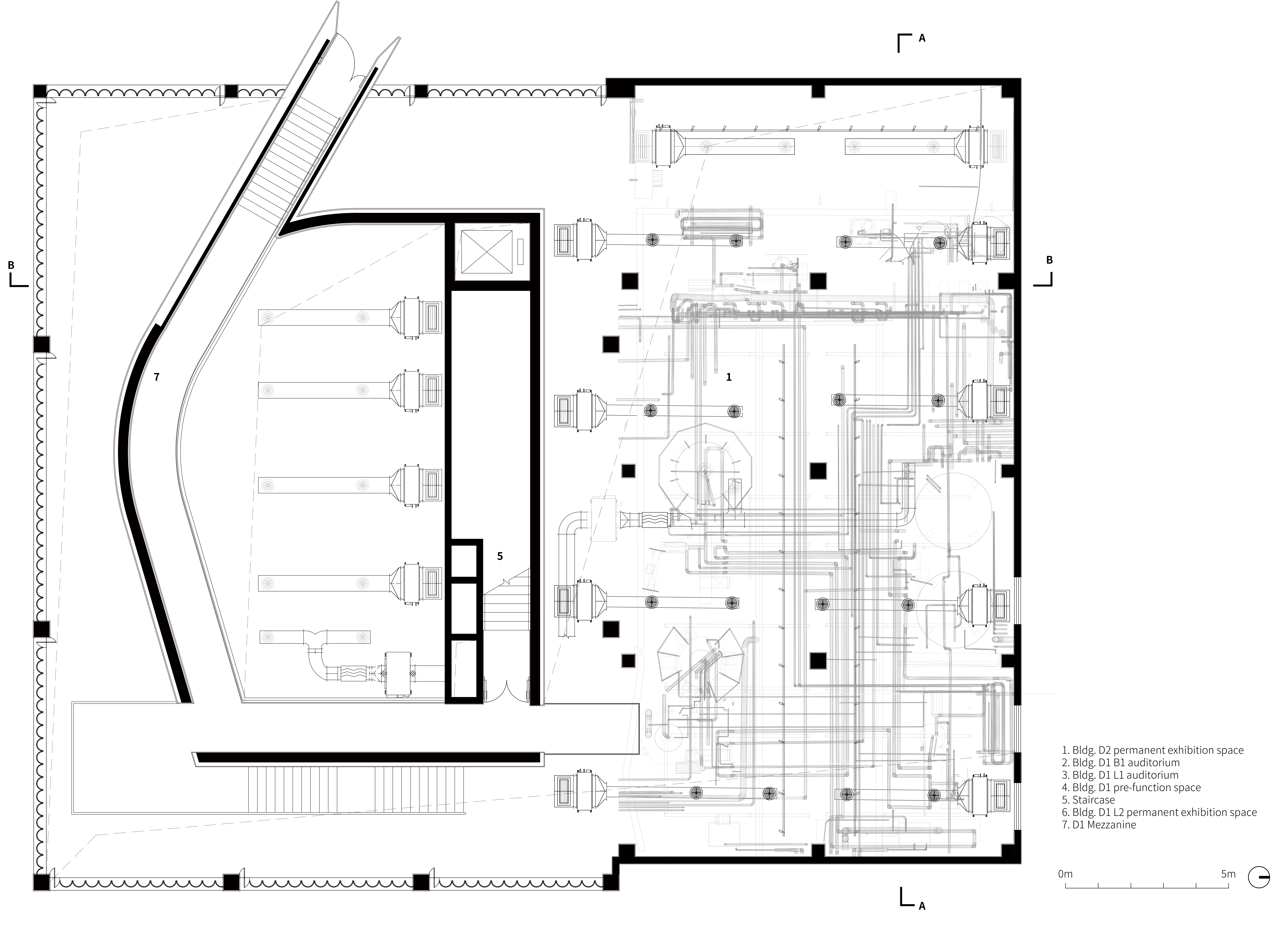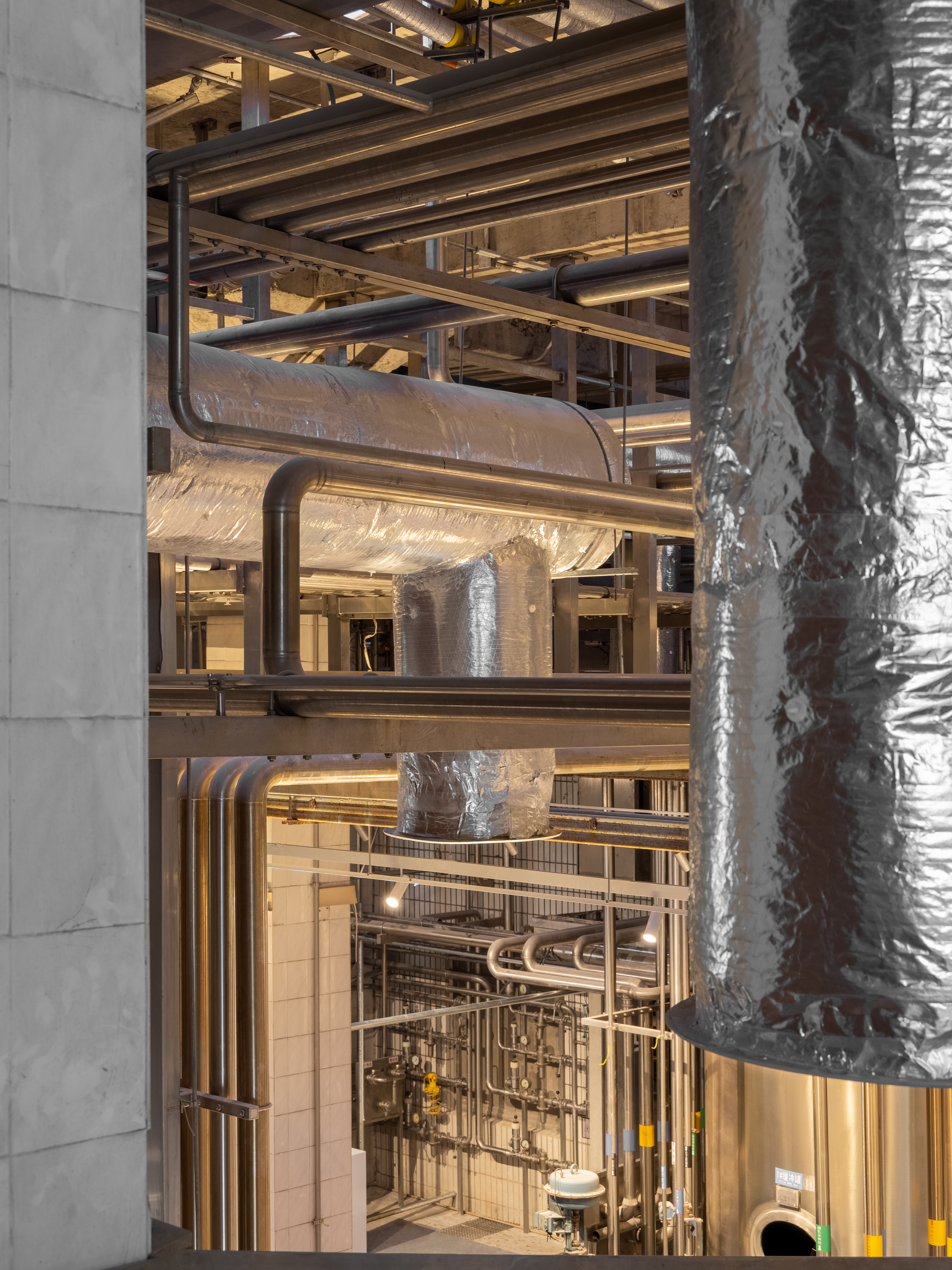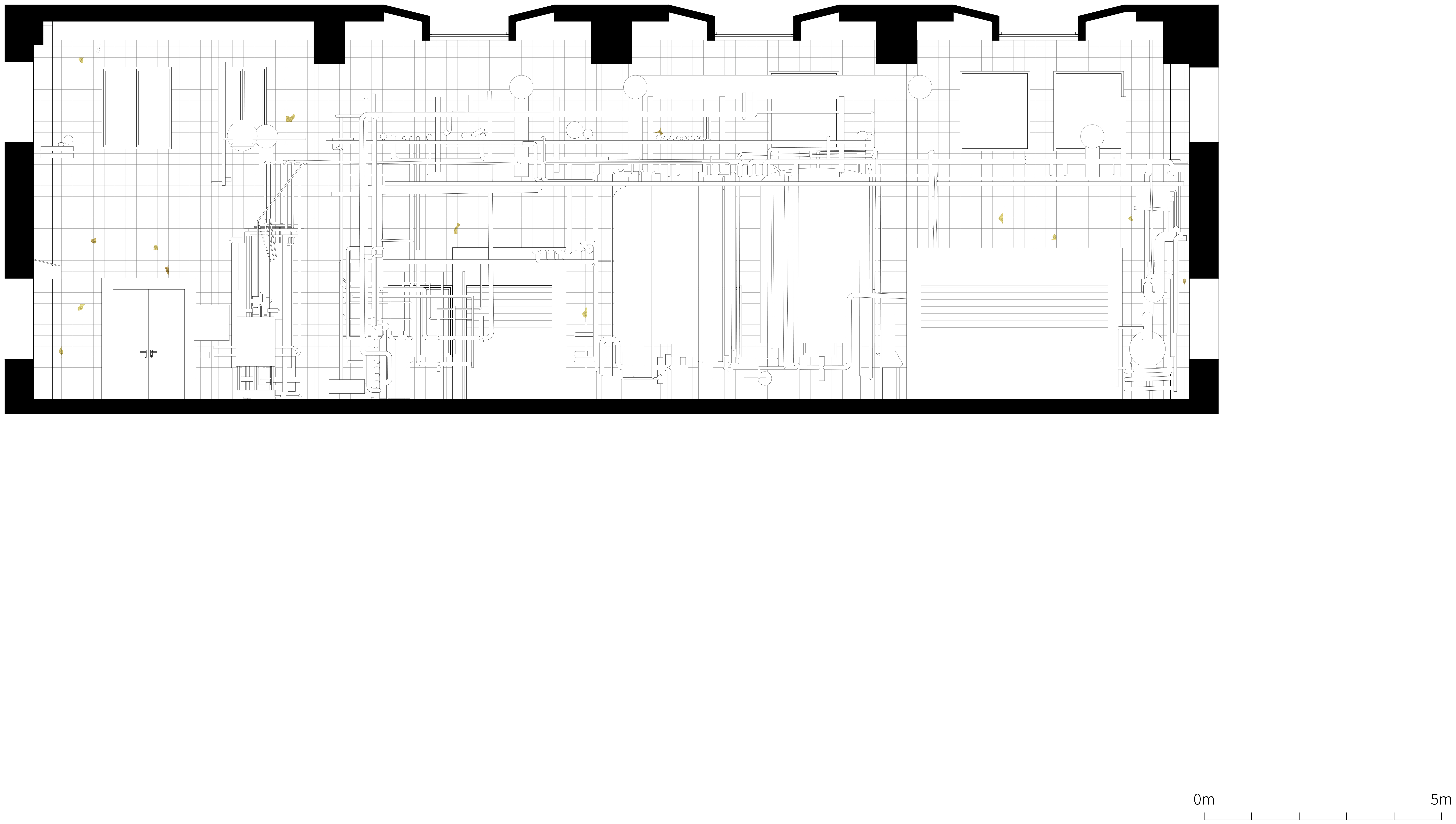 The project’s approach was characterized by minimal intervention, striving to retain the brewery's authentic elements while integrating contemporary features. The D2 exhibition space, formerly a fermentation tank workshop, has been meticulously preserved, maintaining its intricate network of pipelines and tanks. This space now serves as a living museum, embodying the brewery's extensive history and its role in the early stages of Shenzhen's development. Restoration efforts were conducted with archaeological precision, emphasizing the conservation of original features such as stainless-steel brewing equipment and vintage wall and floor tiles. Damaged areas on these tiled surfaces underwent a restoration process inspired by Kintsugi, utilizing golden mortar to accentuate repairs, symbolizing the brewery's golden era.