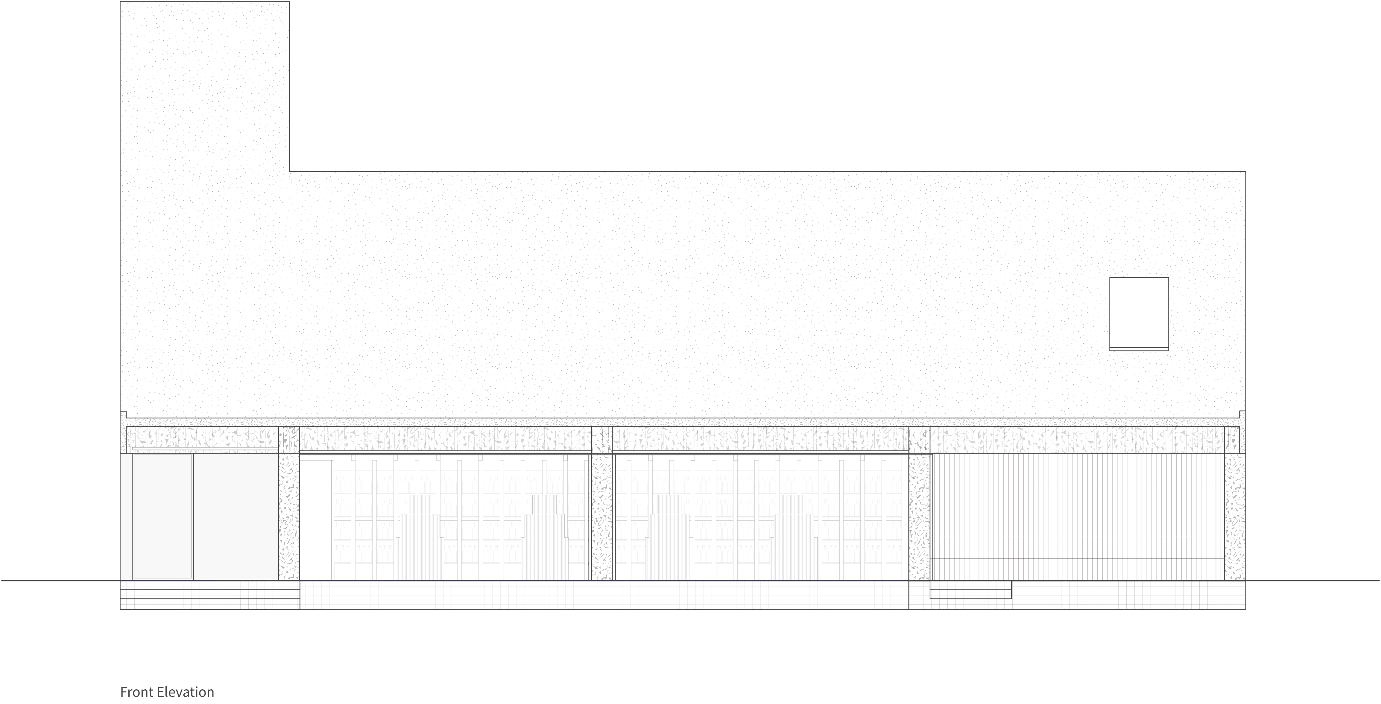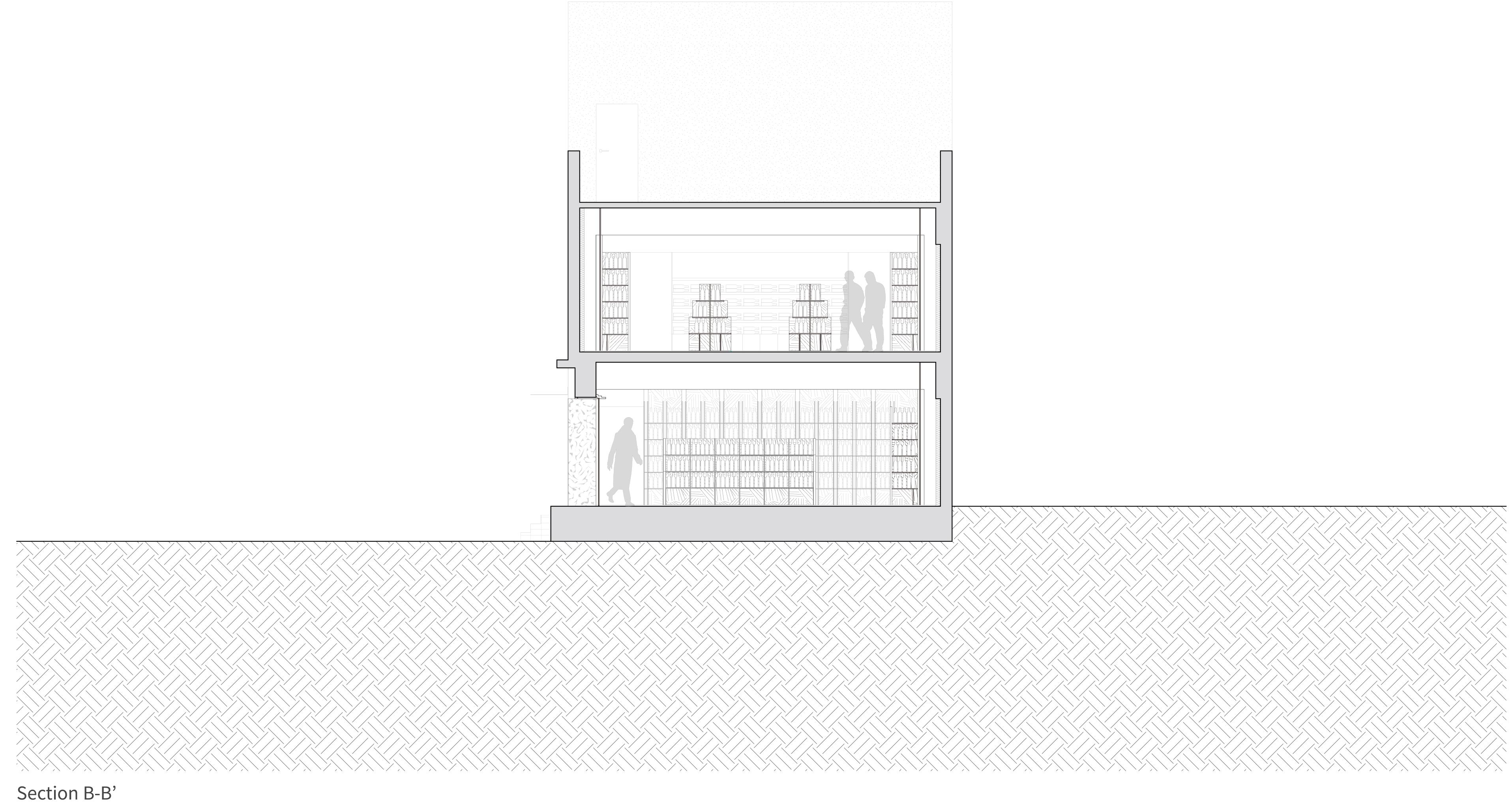 Due to budget and scheduling, the project had to be reimagined from a renovation to a repair. The wall assembly and the shelving units were integrated into a single assembly with added insulation, and used osb panels and studs as the two materials to be used for building up the interior. The exterior of the building was designed through a series of delamination and demolition, revealing many of the bizarre details that were hidden under the canopy.
