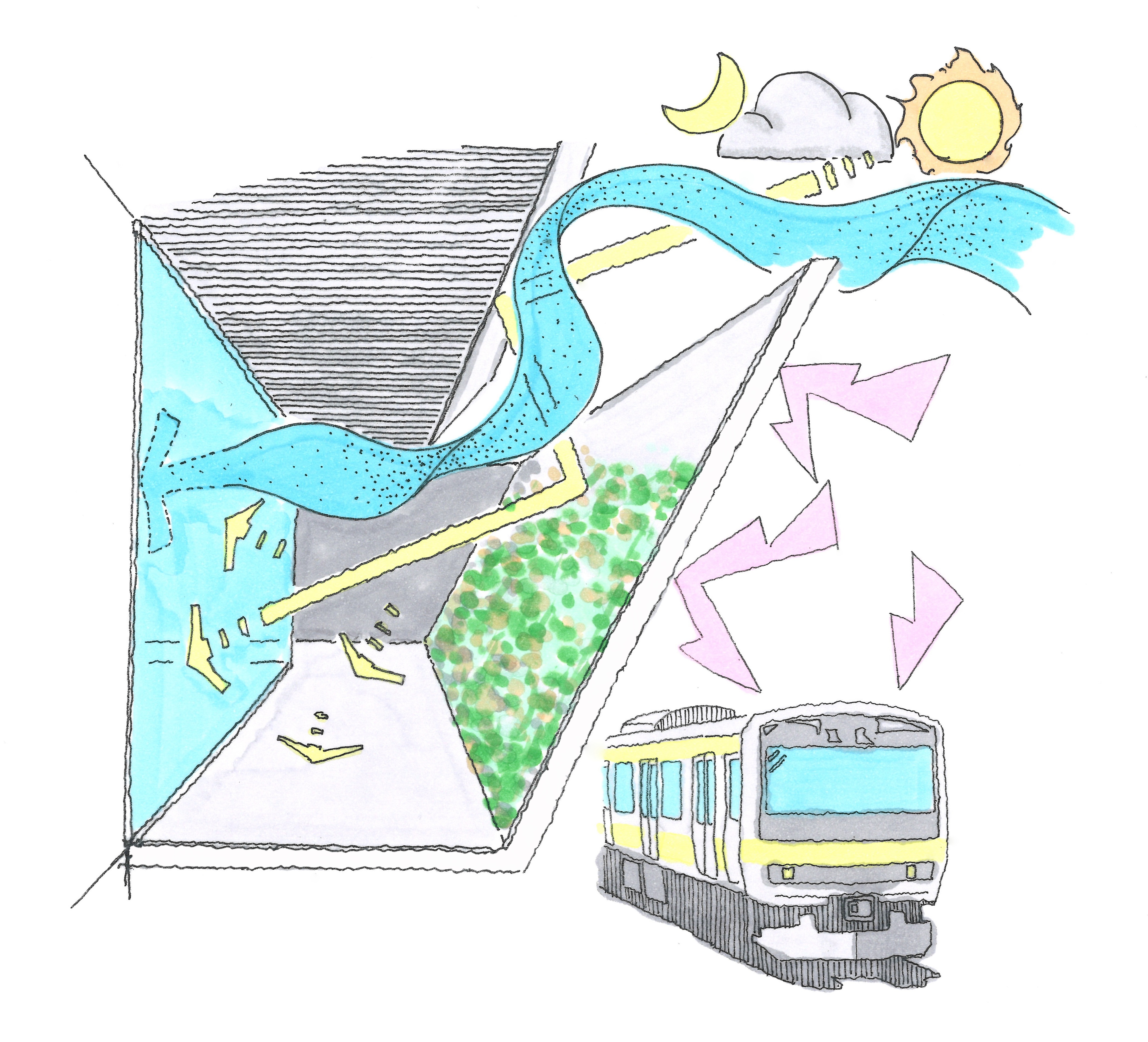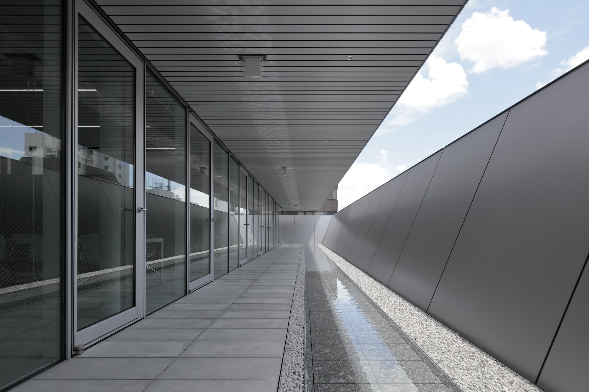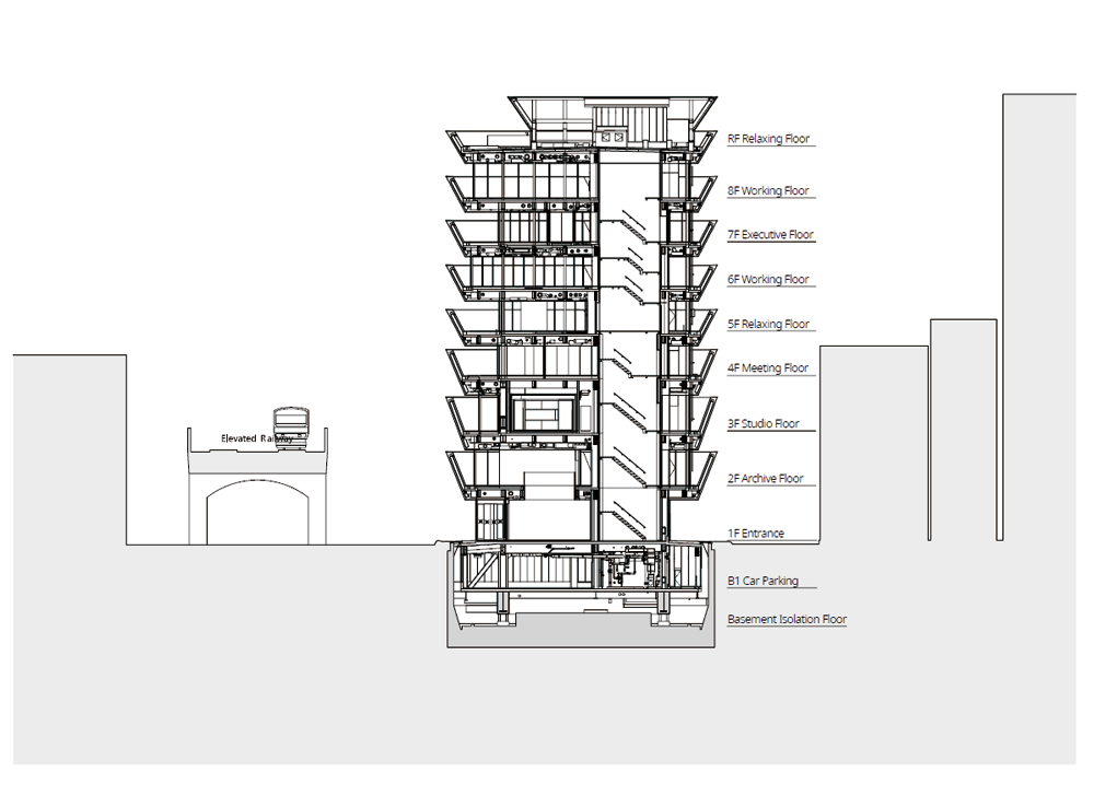 대지의 양방향으로는 기차가 지나다니는 고가 철도가 있고, 주변으로는 소규모 건물들이 있다. 대지의 경사는 기존 건물로 둘러싸인 저층부가 더 높은 반면, 상층부는 더 낮은 개방감을 제공한다. 기울어진 벽들은 빛, 바람 그리고 소리의 환경적인 요소들을 강화하면서도 각 층의 목적에 따라 최적화되어 있다. 예를 들어, 게임 캐릭터의 녹음을 위한 스튜디오는 철도의 소음을 줄이기 위해 가능한 높이가 높아져 3층의 벽 뒤에 위치한다. 관람객이 주로 이용하는 공간은 저층부에 배치하고, 직원들의 프라이버시를 위한 공간은 높은 층에 배치했다. 2층과 3층에는 극장과 스튜디오 등 외부와 격리가 필요한 프로그램을 배치했다. 5층의 다이닝 룸, 라운지, 체육관은 직원들이 긴장을 풀고 재충전할 수 있는 공간을 제공하고, 7층은 직원들이 창의적인 작업에 참여하거나 중요한 손님을 위한 응접용 공간이다. 옥상에는 직원들을 위한 바비큐 카운터와 수영장 등의 편의시설을 마련했다. 고가 철도와 수직적으로 더 먼 곳에 위치한 5층에서 낮아진 벽들은 어수선한 도시 경관과 하늘의 일부를 잘라서 전망을 제공한다.
