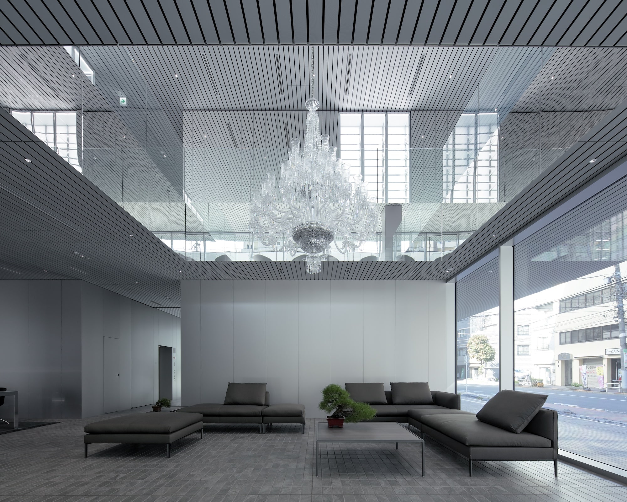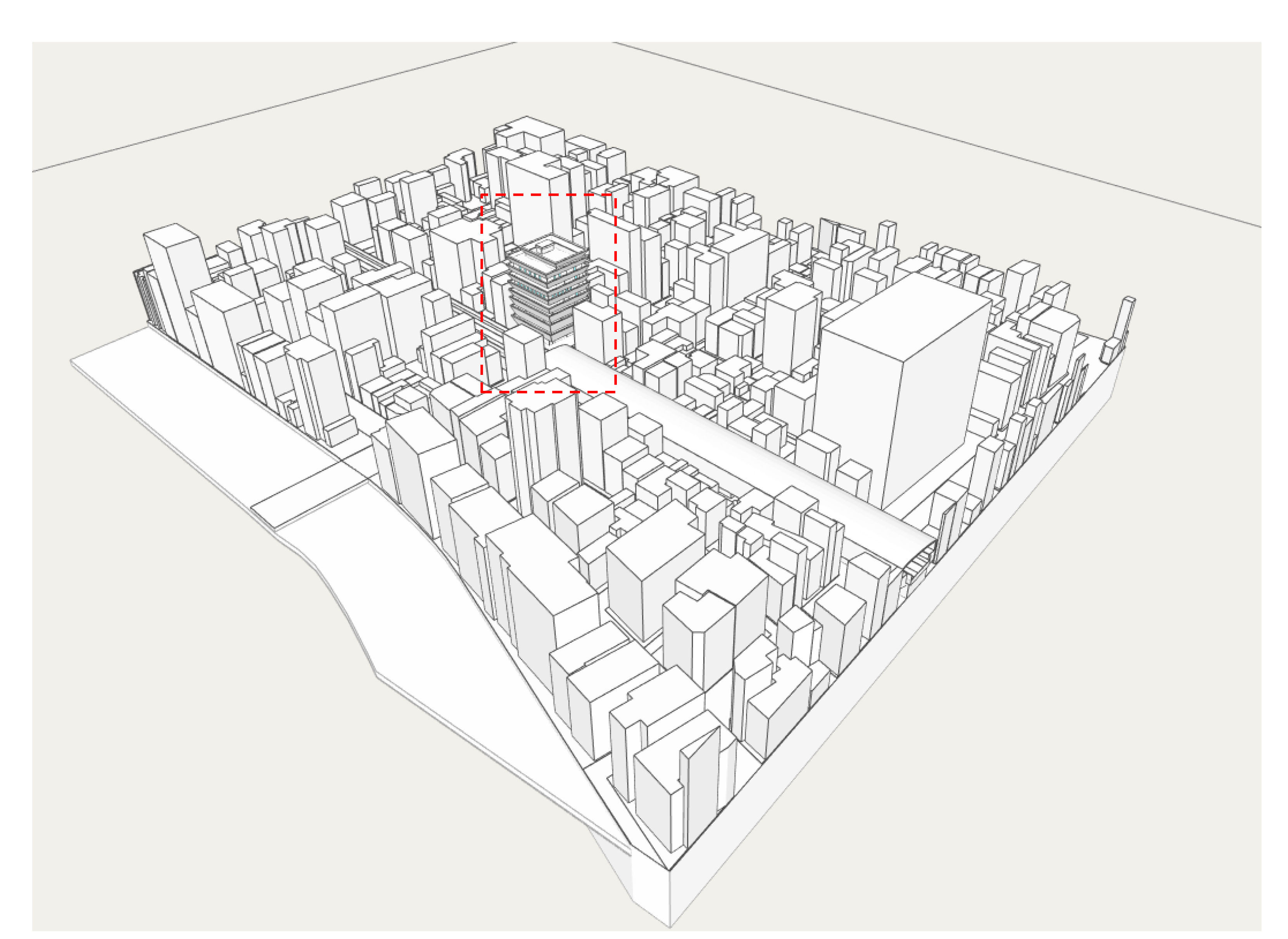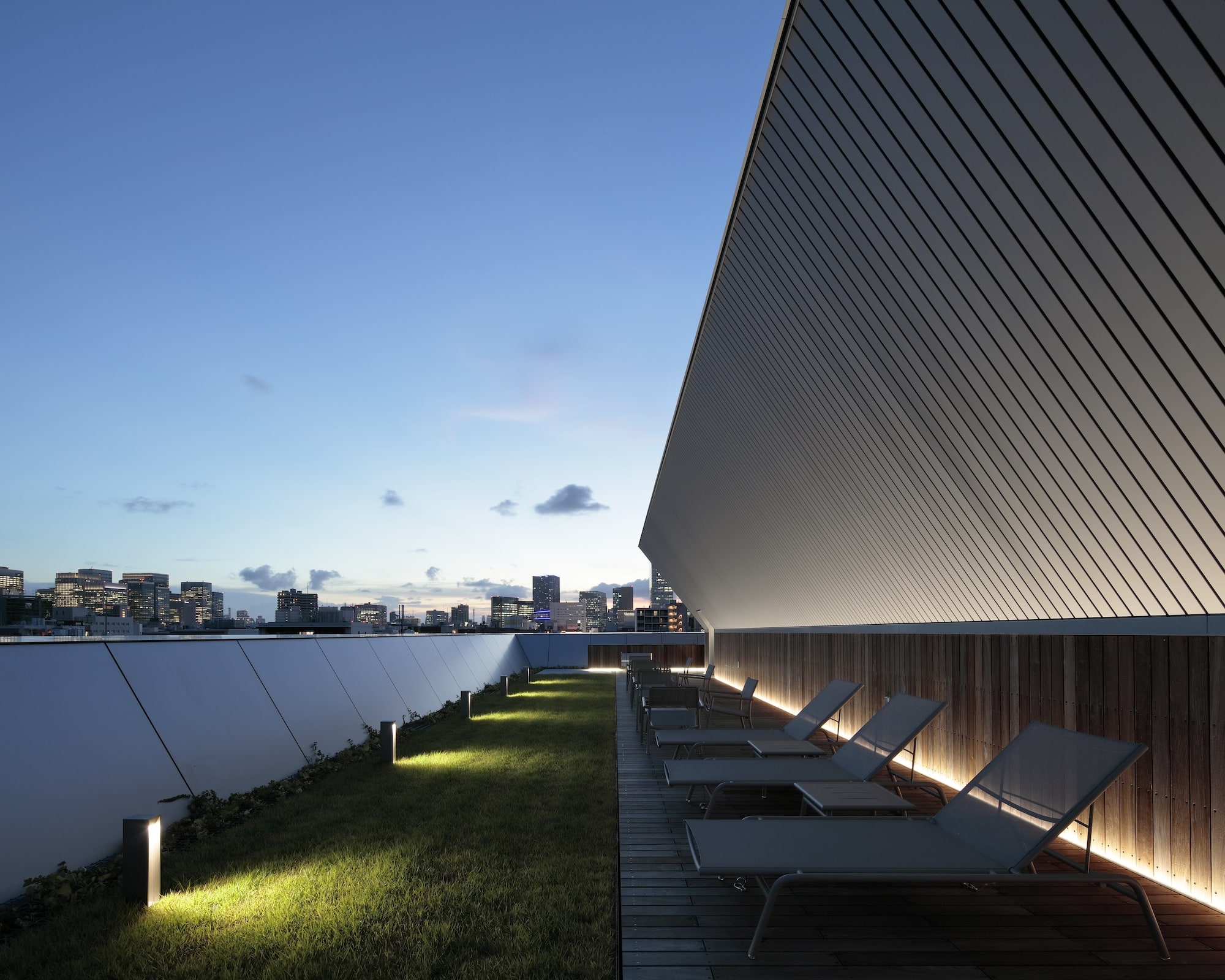 대지의 양방향으로는 기차가 지나다니는 고가 철도가 있고, 주변으로는 소규모 건물들이 있다. 대지의 경사는 기존 건물로 둘러싸인 저층부가 더 높은 반면, 상층부는 더 낮은 개방감을 제공한다. 기울어진 벽들은 빛, 바람 그리고 소리의 환경적인 요소들을 강화하면서도 각 층의 목적에 따라 최적화되어 있다. 예를 들어, 게임 캐릭터의 녹음을 위한 스튜디오는 철도의 소음을 줄이기 위해 가능한 높이가 높아져 3층의 벽 뒤에 위치한다. 관람객이 주로 이용하는 공간은 저층부에 배치하고, 직원들의 프라이버시를 위한 공간은 높은 층에 배치했다. 2층과 3층에는 극장과 스튜디오 등 외부와 격리가 필요한 프로그램을 배치했다. 5층의 다이닝 룸, 라운지, 체육관은 직원들이 긴장을 풀고 재충전할 수 있는 공간을 제공하고, 7층은 직원들이 창의적인 작업에 참여하거나 중요한 손님을 위한 응접용 공간이다. 옥상에는 직원들을 위한 바비큐 카운터와 수영장 등의 편의시설을 마련했다. 고가 철도와 수직적으로 더 먼 곳에 위치한 5층에서 낮아진 벽들은 어수선한 도시 경관과 하늘의 일부를 잘라서 전망을 제공한다.