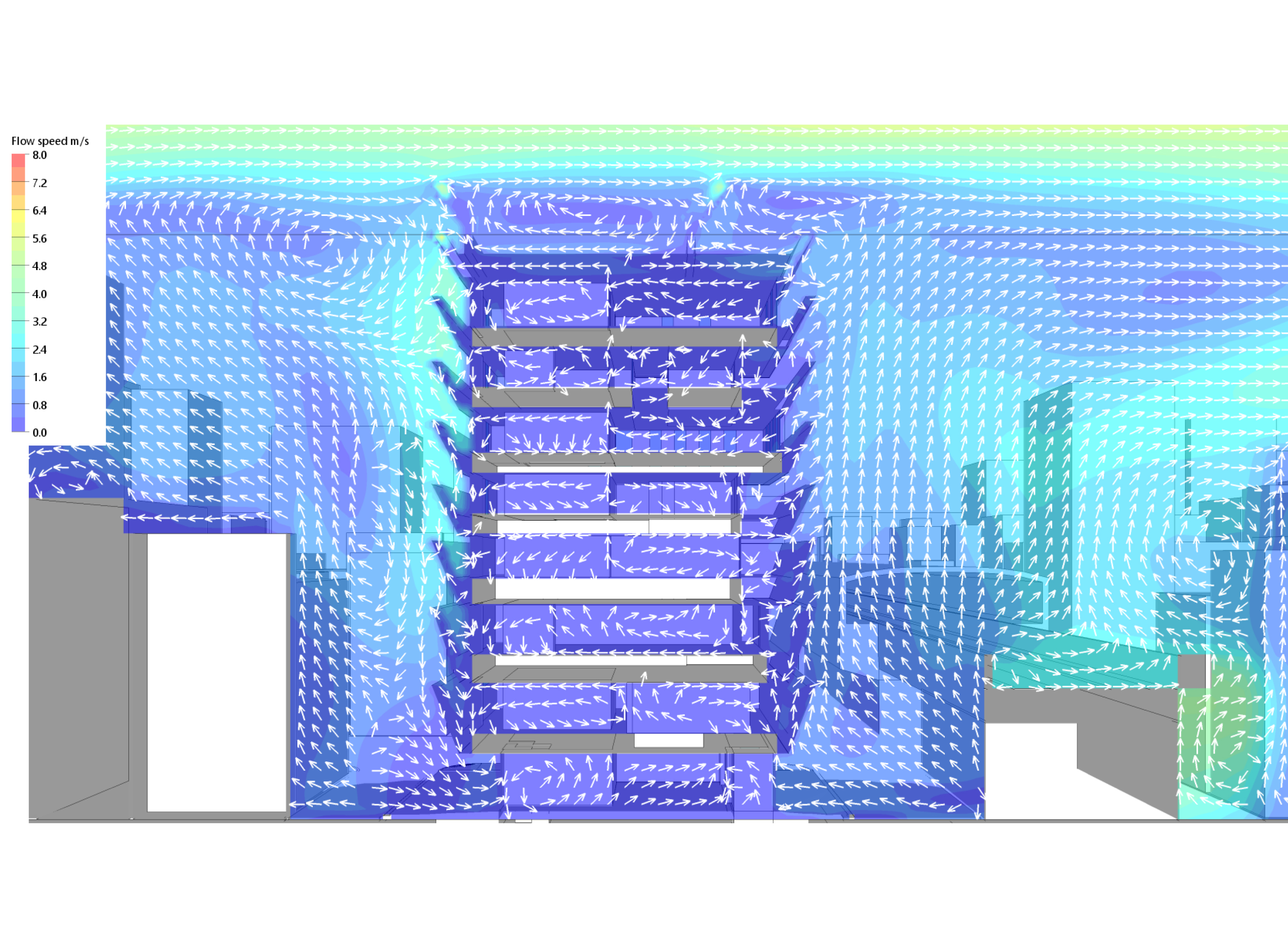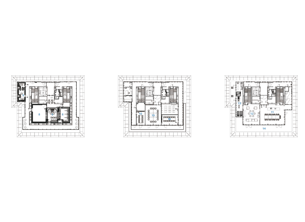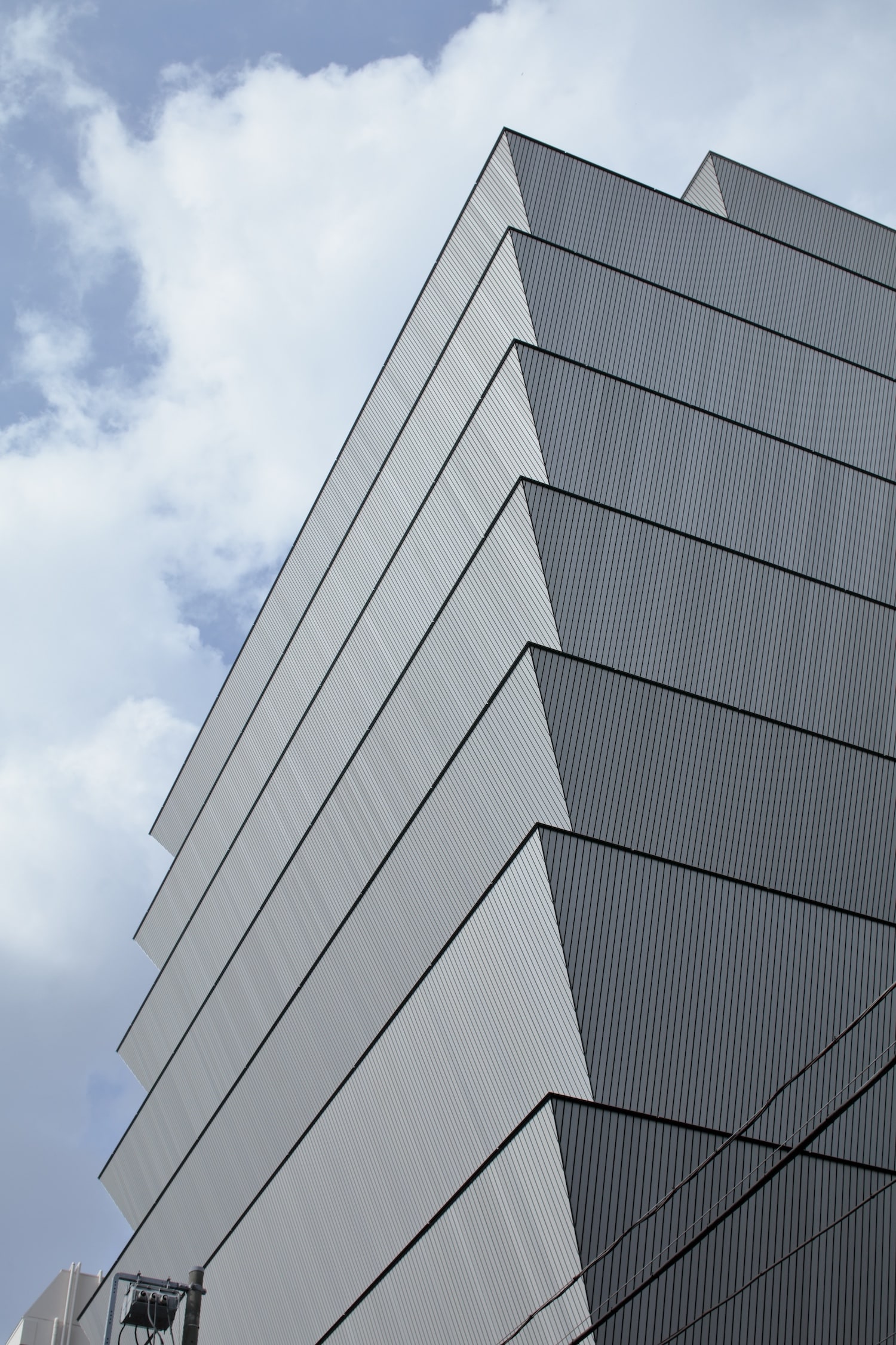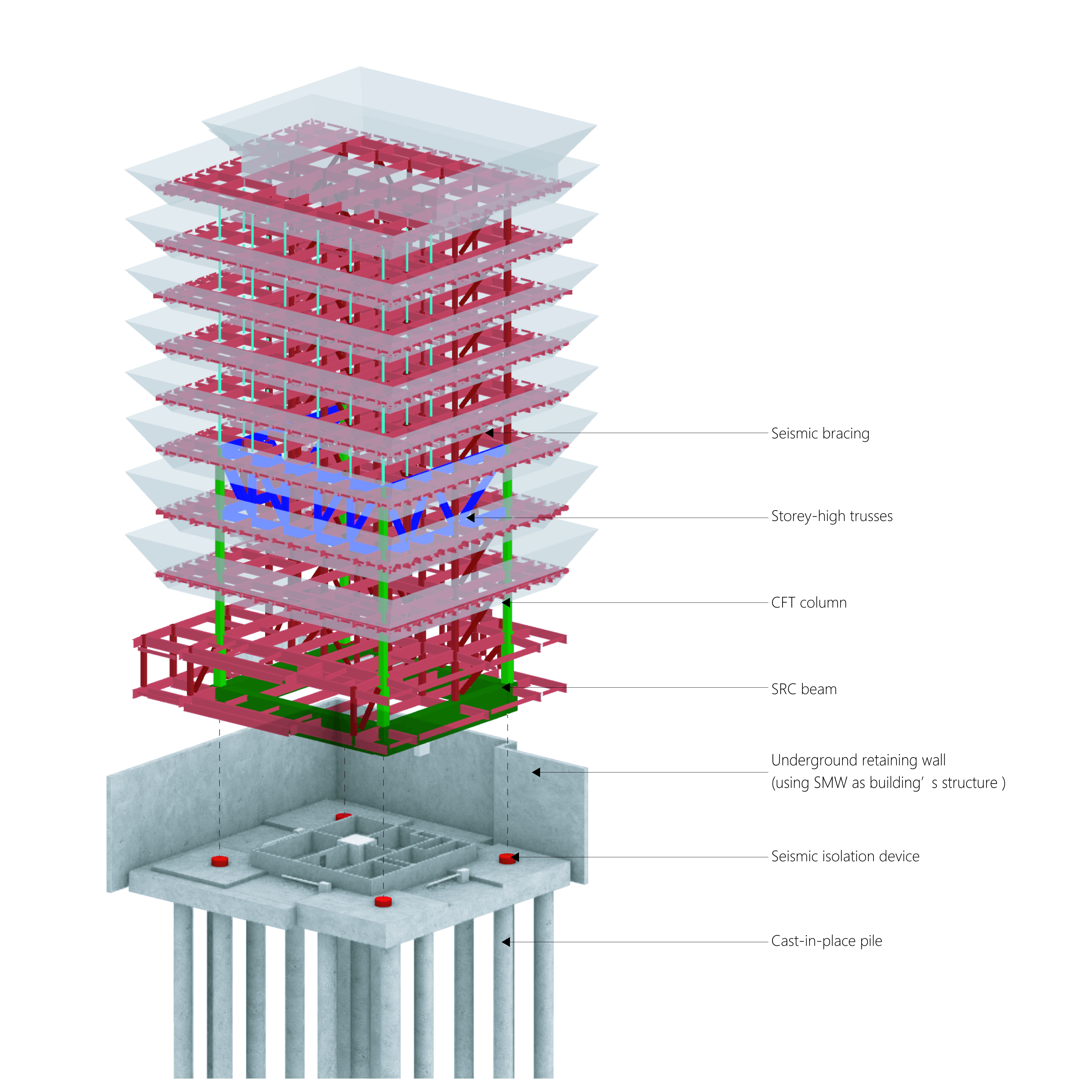 대지의 양방향으로는 기차가 지나다니는 고가 철도가 있고, 주변으로는 소규모 건물들이 있다. 대지의 경사는 기존 건물로 둘러싸인 저층부가 더 높은 반면, 상층부는 더 낮은 개방감을 제공한다. 기울어진 벽들은 빛, 바람 그리고 소리의 환경적인 요소들을 강화하면서도 각 층의 목적에 따라 최적화되어 있다. 예를 들어, 게임 캐릭터의 녹음을 위한 스튜디오는 철도의 소음을 줄이기 위해 가능한 높이가 높아져 3층의 벽 뒤에 위치한다. 관람객이 주로 이용하는 공간은 저층부에 배치하고, 직원들의 프라이버시를 위한 공간은 높은 층에 배치했다. 2층과 3층에는 극장과 스튜디오 등 외부와 격리가 필요한 프로그램을 배치했다. 5층의 다이닝 룸, 라운지, 체육관은 직원들이 긴장을 풀고 재충전할 수 있는 공간을 제공하고, 7층은 직원들이 창의적인 작업에 참여하거나 중요한 손님을 위한 응접용 공간이다. 옥상에는 직원들을 위한 바비큐 카운터와 수영장 등의 편의시설을 마련했다. 고가 철도와 수직적으로 더 먼 곳에 위치한 5층에서 낮아진 벽들은 어수선한 도시 경관과 하늘의 일부를 잘라서 전망을 제공한다.