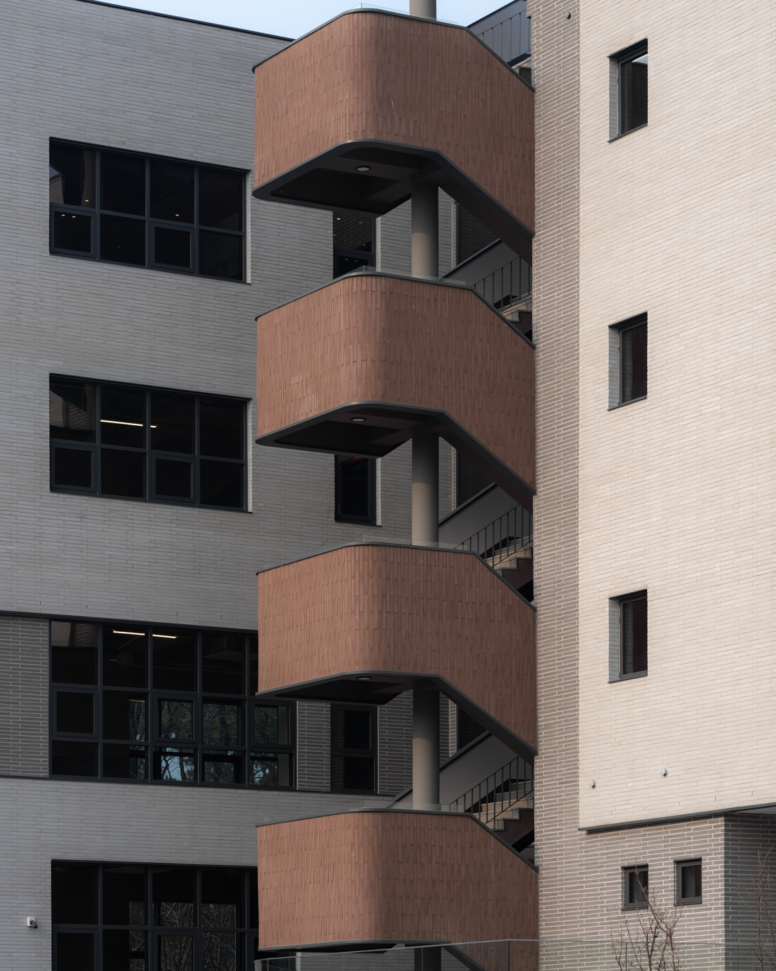 간결한 두 매스 사이에 부드러운 선형과 과감한 색을 가진 계단을 전면으로 노출시켰다. 이로써 공용 공간이 기능적 역할을 하고 휴게공간의 역할도 한다. 외부로 노출된 계단은 각 층을 연결하는 수직 동선이며, 양쪽의 매스를 곡선의 형태로 연결한다. 강렬함이 담긴 곡선의 형태는 디자인 아이덴티티가 되며, 아름다운 곡률을 구현하기 위해 세워서 쌓은 와인색 롱브릭에는 시공자의 노력도 함께 담겨있다. ‘아름’이라는 브랜드가 가진 부드러움 속의 강렬한 이미지를 투영하고, 형태를 외부 계단을 통해 보여준다고 할 수 있다. 분리된 두 동을 잇는 연결 통로에는 프레임이 없는 전면 창호가 있어 양쪽의 풍경을 그대로 담아내어 전면에서는 도심을, 배면에서는 자연을 즐길 수 있는 휴게공간이 된다.