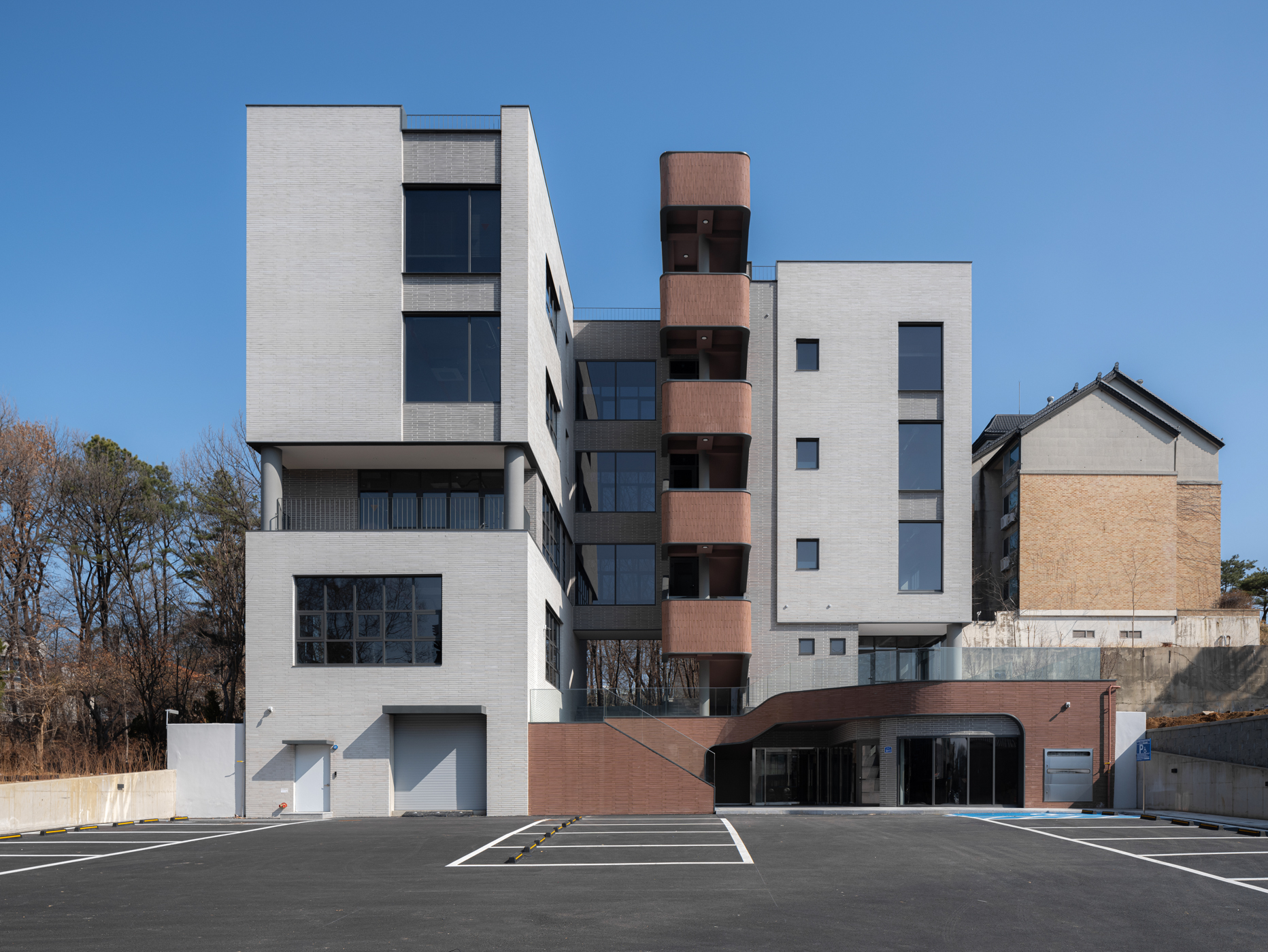 배치의 근간이 된 기본 요소는 대지의 형상, 즉 ‘자연’이다. 대지는 자연에 둘러 싸여 아늑한 분위기였고 남서에서 북동으로 경사져 가로 방향으로 자연의 축을 이루고 있다. 도로에서 봤을 때, 건축의 정면을 강조한 것이 아닌, 가로 방향의 자연의 축을 그대로 담아내어 두 개의 직육면체 매스를 분절하고 자연스러운 틈을 만들었다. 대지 초입에서 틈을 통해 보이는 뒤쪽 나무들의 작은 흔들림은 건물 깊은 곳까지 관심 가지도록 유도한다. 모노톤의 롱브릭은 심플한 매스에 무게감을 실어주며, 와인색의 외부 계단과 강렬한 대비를 이뤄 아름다움을 더해준다.