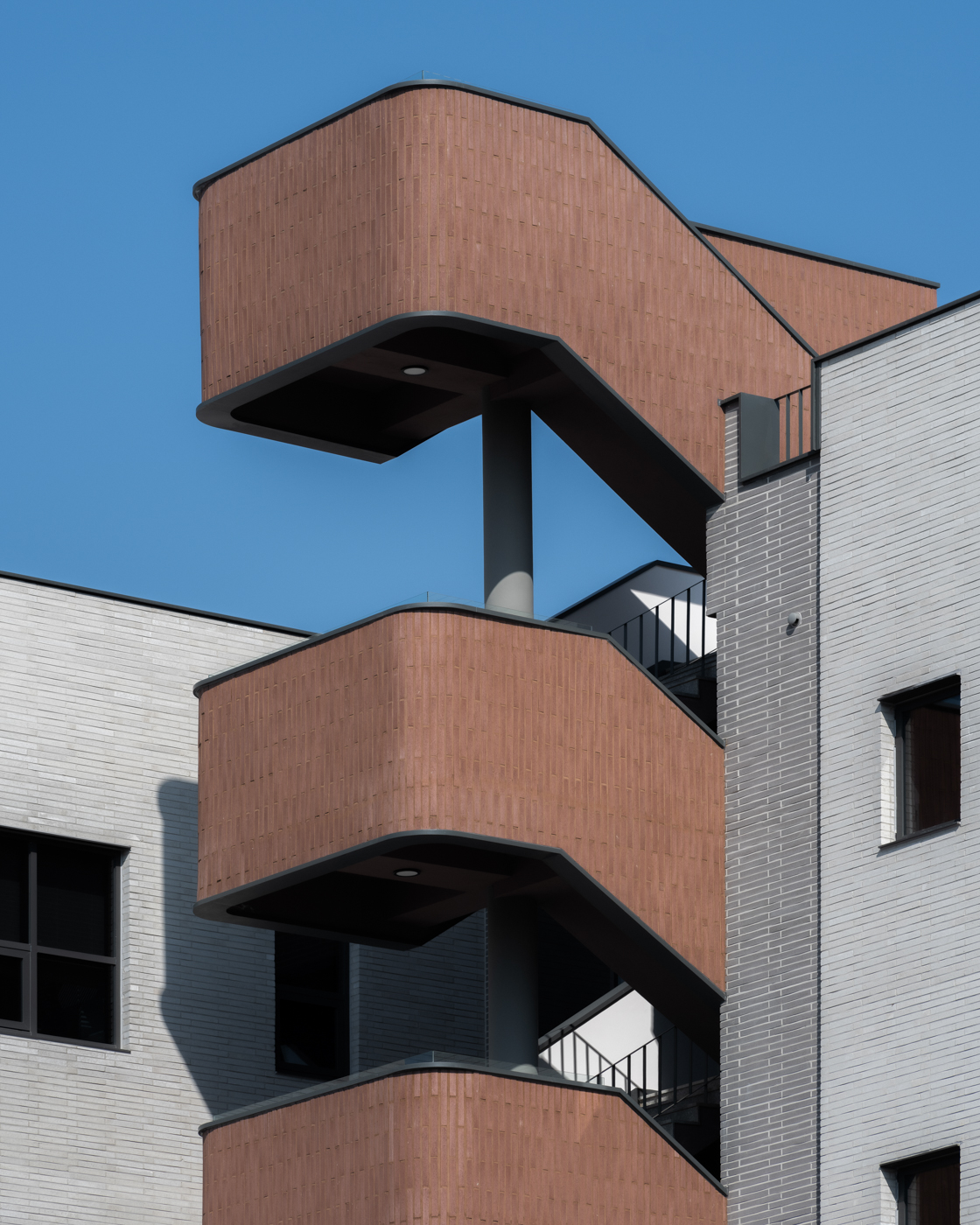 간결한 두 매스 사이에 부드러운 선형과 과감한 색을 가진 계단을 전면으로 노출시켰다. 이로써 공용 공간이 기능적 역할을 하고 휴게공간의 역할도 한다. 외부로 노출된 계단은 각 층을 연결하는 수직 동선이며, 양쪽의 매스를 곡선의 형태로 연결한다. 강렬함이 담긴 곡선의 형태는 디자인 아이덴티티가 되며, 아름다운 곡률을 구현하기 위해 세워서 쌓은 와인색 롱브릭에는 시공자의 노력도 함께 담겨있다. ‘아름’이라는 브랜드가 가진 부드러움 속의 강렬한 이미지를 투영하고, 형태를 외부 계단을 통해 보여준다고 할 수 있다. 분리된 두 동을 잇는 연결 통로에는 프레임이 없는 전면 창호가 있어 양쪽의 풍경을 그대로 담아내어 전면에서는 도심을, 배면에서는 자연을 즐길 수 있는 휴게공간이 된다.