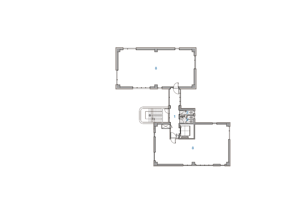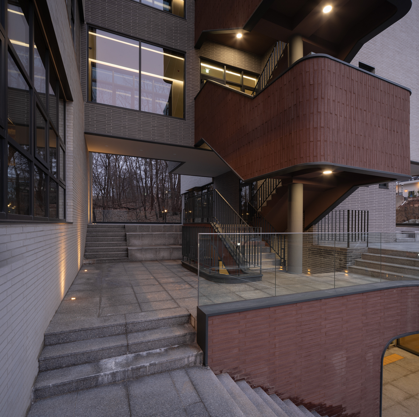 배치의 근간이 된 기본 요소는 대지의 형상, 즉 ‘자연’이다. 대지는 자연에 둘러 싸여 아늑한 분위기였고 남서에서 북동으로 경사져 가로 방향으로 자연의 축을 이루고 있다. 도로에서 봤을 때, 건축의 정면을 강조한 것이 아닌, 가로 방향의 자연의 축을 그대로 담아내어 두 개의 직육면체 매스를 분절하고 자연스러운 틈을 만들었다. 대지 초입에서 틈을 통해 보이는 뒤쪽 나무들의 작은 흔들림은 건물 깊은 곳까지 관심 가지도록 유도한다. 모노톤의 롱브릭은 심플한 매스에 무게감을 실어주며, 와인색의 외부 계단과 강렬한 대비를 이뤄 아름다움을 더해준다.