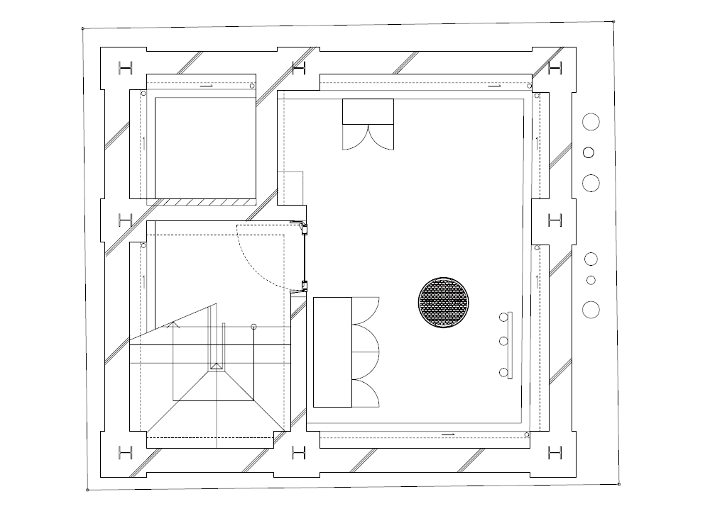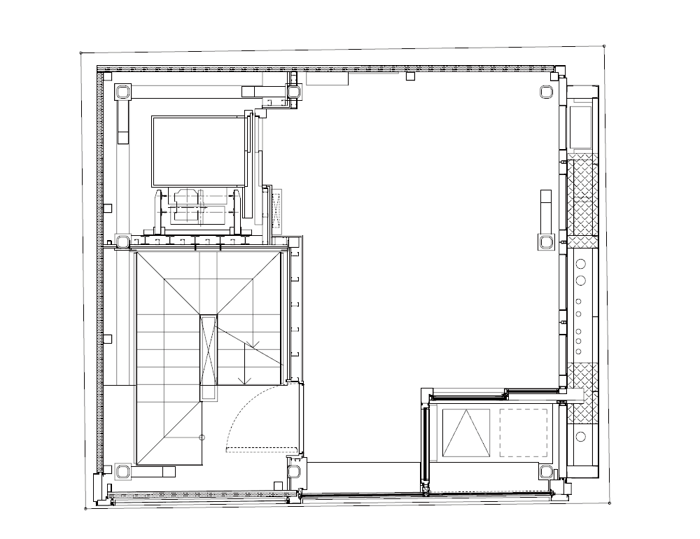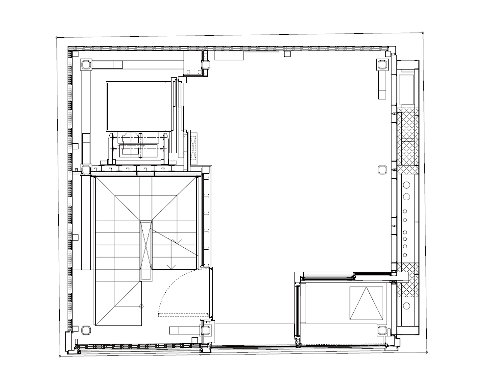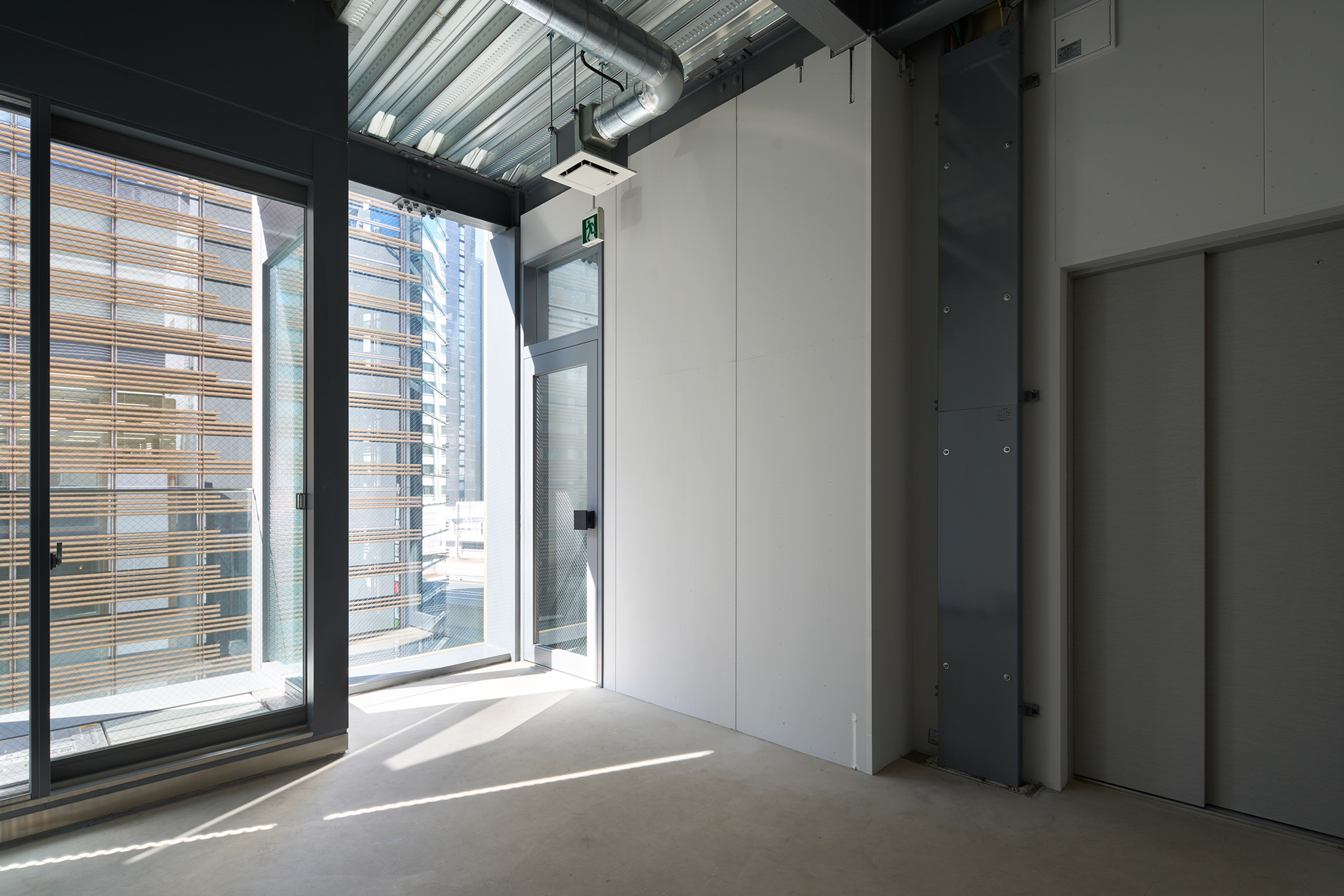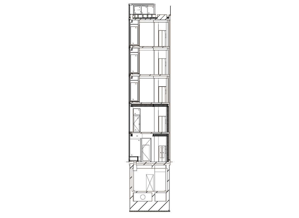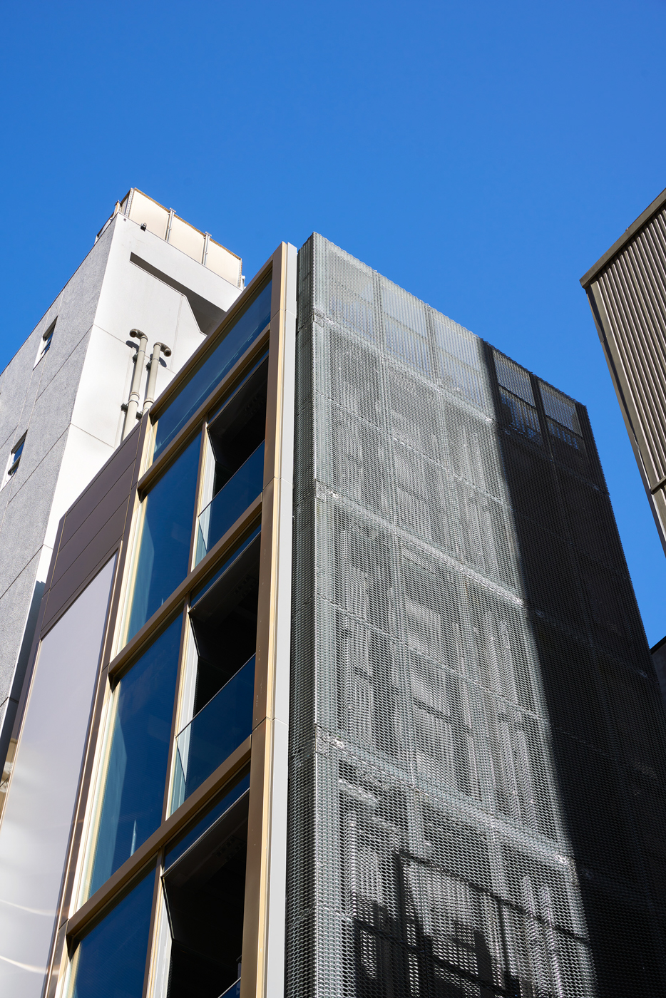 기본적인 평면은 부지 깊숙한 곳에 계단과 엘리베이터를 정렬하고 각 층을 개별적인 임대 공간인 구성이다. 1층은 각 층의 임대인들이 오고가는 곳이므로, 공용의 복도이자 로비인 공간이다. 빌딩의 정면에서 가려진 부분은 수직 동선이 배치된 부분이다. 옆 건물과 200mm의 이격거리가 있어야 했는데, 이로 인해 일반적인 옹벽을 건설할 수 없었고, ‘개방형 케이슨 건설 공법’이 사용되었다. 콘크리트 기초는 공법에 따라 미리 타설되었으며, 이후 지하에 대한 굴착 작업이 진행되어 케이슨이 자중을 받고 지하에 자리잡을 수 있었다. 이는 일반적으로 토목 공학에서만 사용되는 공법이었고, 시공 전문가의 도움을 받았어야 했다. 지하 기초는 6m 깊이로 설계되었고, 하중을 받는 지층 위에 직접 얹혀 있다. 골드 색상으로 마감된 입면은 매력적이고 고급스러운 느낌을 준다. 계단 입면 부분 앞에는 후면 조명이 설치되었으며, 플라스틱 패널이 수직으로 설치되어 있다. 발코니에는 주로 외부 냉방 장치와 배기 팬 장치가 설치되어 있는데, 야외 공간에도 간단한 식사와 휴식을 취할 수 있다. 큰 창문은 거리와 주변 건물의 전망을 제공한다.
