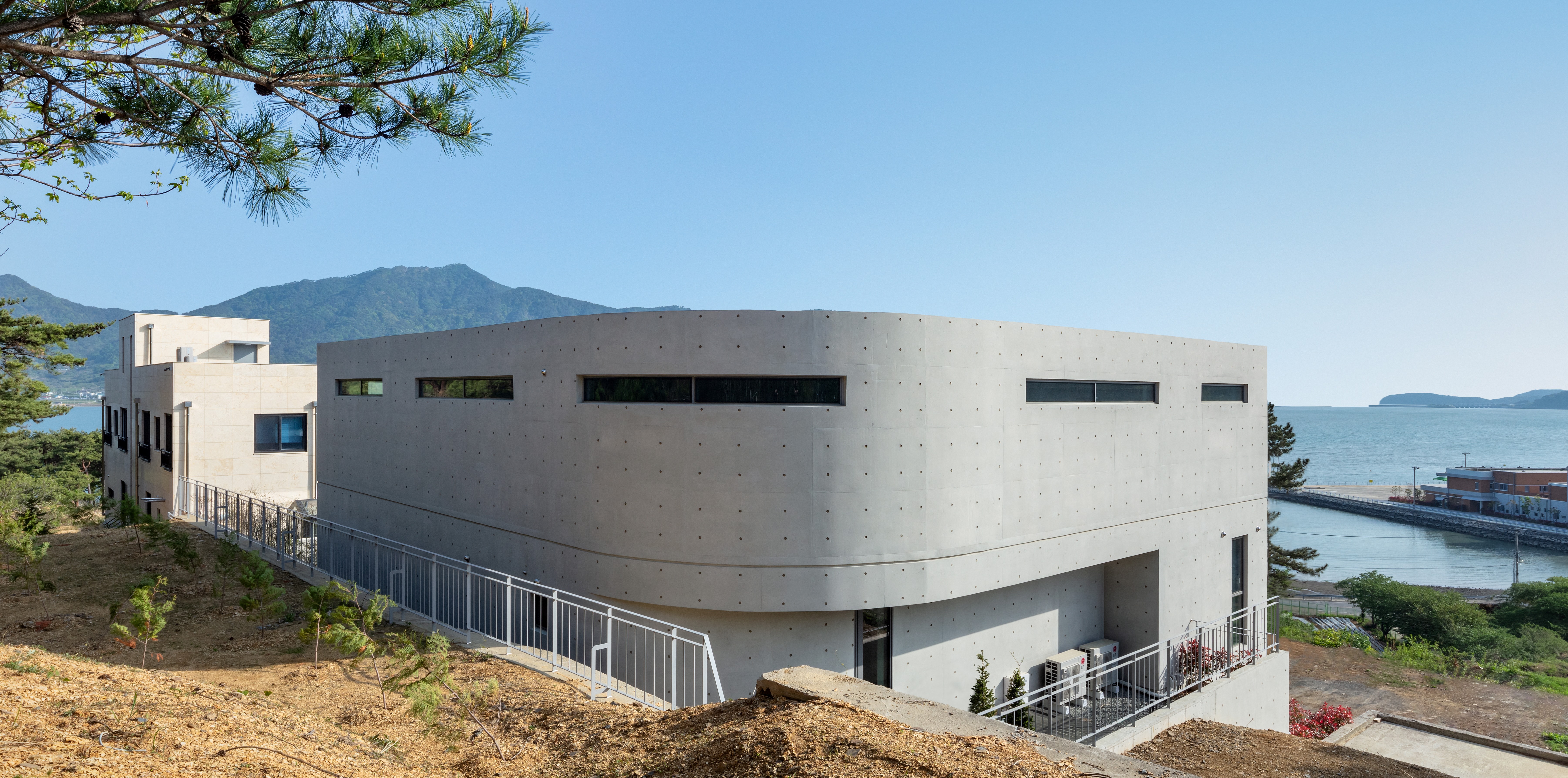 외장재는 메리모나크 마리나 클럽의 재료와 같은 노출 콘크리트를 선택하여 같은 단지 내 건축물로서의 통일성을 고려하였다. 테라스와 함께 처마를 설치하여 아름다운 당항포 앞바다의 풍경들이 곡선의 처마속으로 들어올 수 있게 한다. 여름에는 처마가 직사광선을 차단하고 그늘을 만들어 시원하게 하며, 겨울에는 낮은 고도의 햇볕이 넓은 창을 통해서 실내 깊이 유입된다.