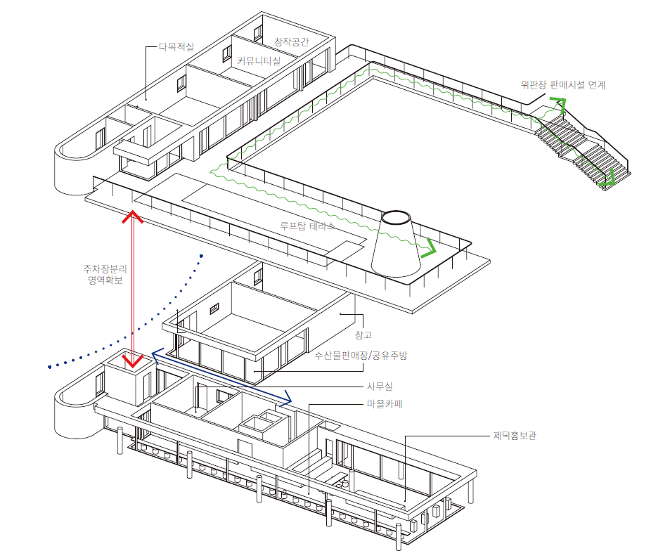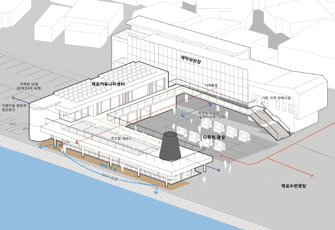 - 기존 위판장과 연계가능한 동선과 외부 공간 계획