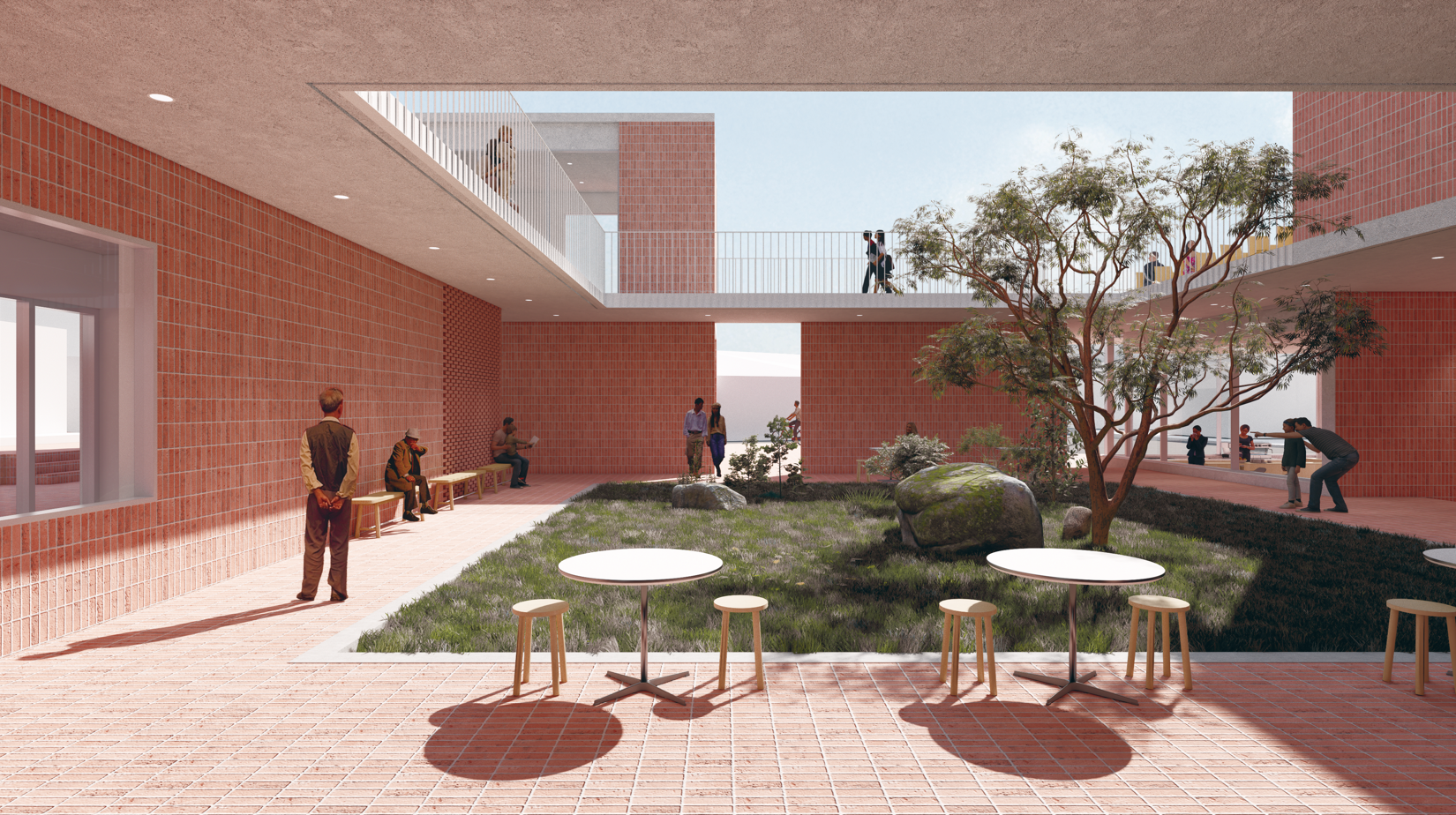 대상지의 성격에 따라 용도가 다른 건물 동과 담을 계획하여, 적정 규모의 외부공간과 길을 구성하였다. 부지의 양 끝으로 차량 동선과 보행 동선을 분리하여 주민들이 자주 사용하는 지름길이 차량의 간섭 없이 편안히 쓰일 수 있다. 기존 보행로는 대지 안으로 더 확장되며, 그 동선에 대응하여 카페와 마을기록관이 위치한다. 대상지 모퉁이에 위치한 카페 옆길은 자연스럽게 건물의 중정과 계단실로 향할 수 있게 한다. 카페 안에서는 마을길을 오고 가는 사람들의 풍경과 중정에 조성된 조경을 바라볼 수 있다.