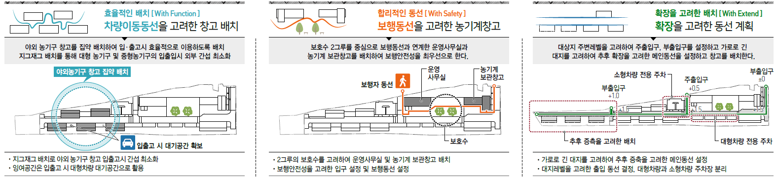 현재 농업기계 보급이 확대 및 대형화가 되면서 새로운 농업기계 보관창고가 필요한 실정입니다. 저희는 새롭게 보급되는 농업기계 보관창고에 맞게 새로운 프로그램들이 필요하다고 생각했습니다. 그렇기에 저희는 효율적인 농기계 관리 및 운영을 중점으로 선진화된 스마트 입출고 시스템 도입, 기능에 따른 공간의 연계 및 분리를 하였습니다. 또한 고령 농업인의 이용에 불편함이 없도록 계획하였고 시설물의 용도와 규모등을 종합적으로 판단하여 유지관리 및 경제적인 건축물이 되도록 설계했습니다.