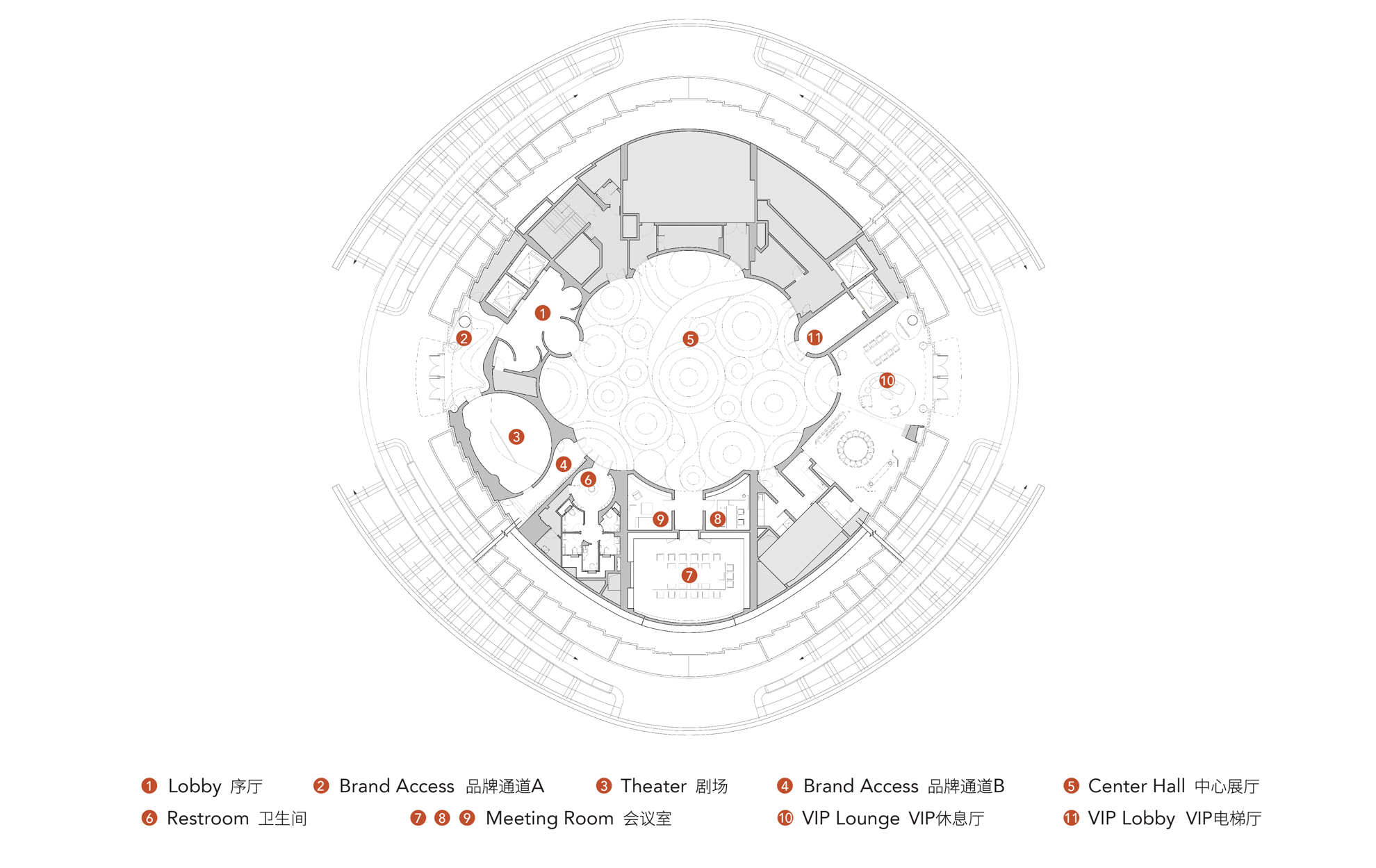 소용돌이라는 주제로 설계된 서안선심은 전시회, 패션쇼, 컨퍼런스 등으로 사용되는 깨끗하고 다기능적인 그랜드 이벤트 홀이다. 서안선심의 소용돌이 패턴은 원형 복도 바닥의 분할에 반영됨과 동시에 다층적인 층계를 만들었다. 정면과 전시장 외벽 사이의 구조와 장비 파이프 라인은 소용돌이 외벽 사이에서 눈에 띄지 않으며, 소용돌이라는 강력한 시각적 지배 요소가 공간의 의미와 긴장감을 극대화한다.