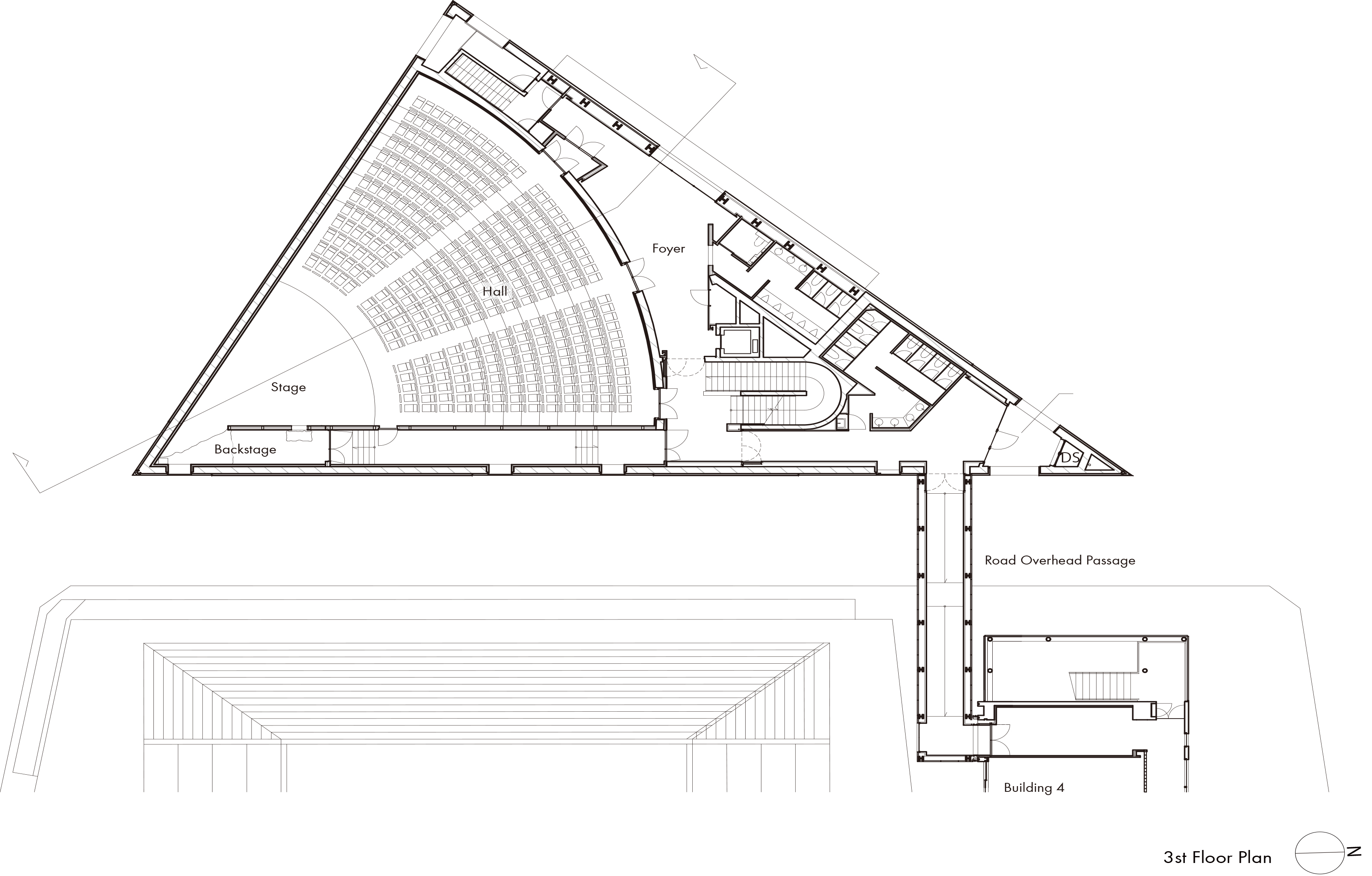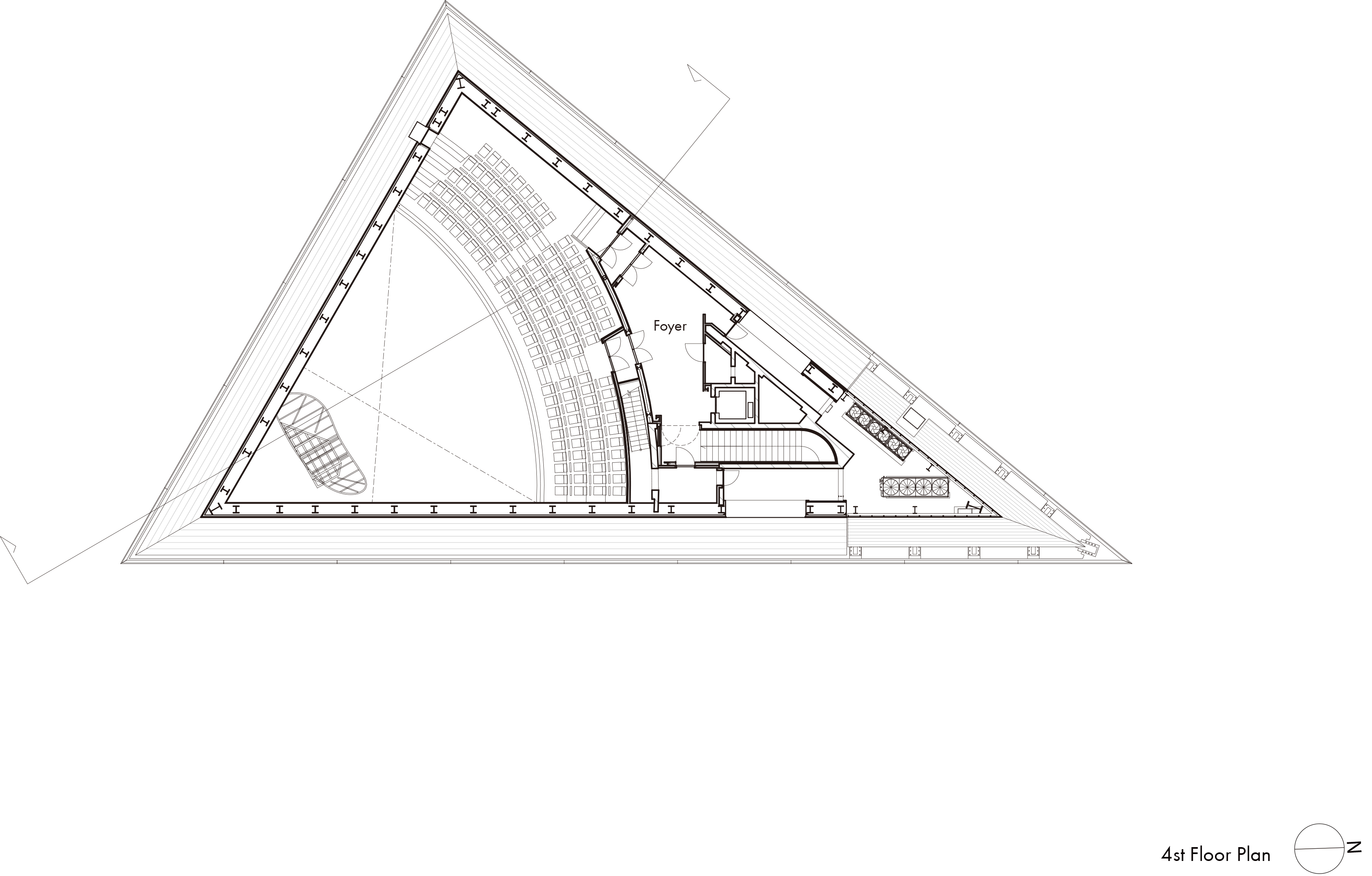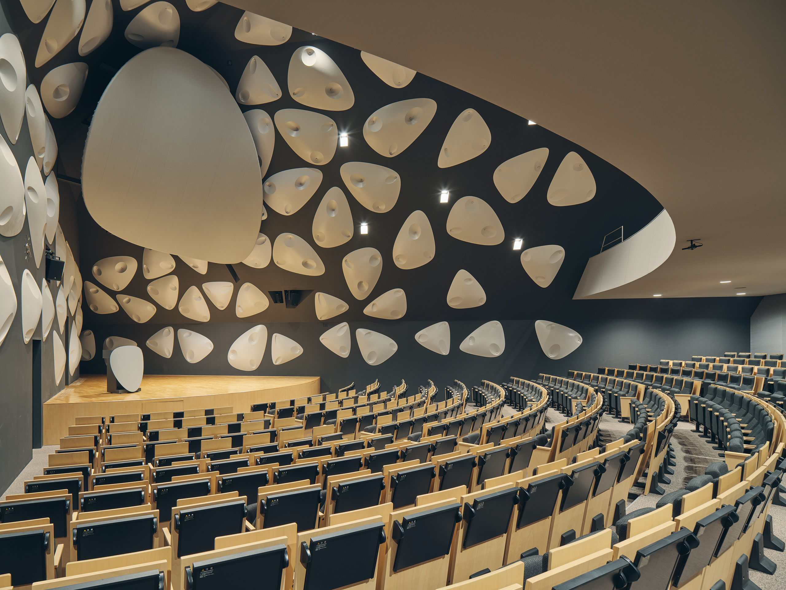 The lecture hall is designed under an expansive mansard roof defined by the diagonal lines of the street. Its outer shell mirrors the shape of the roof, resulting in an asymmetrical and distorted pyramidal shape. To balance out the complex form, dark walls are selected using acoustic panels cast from custom-made FRP molding. These acoustic panels are carefully laid out to diffuse sound and achieve an optimal sound environment.