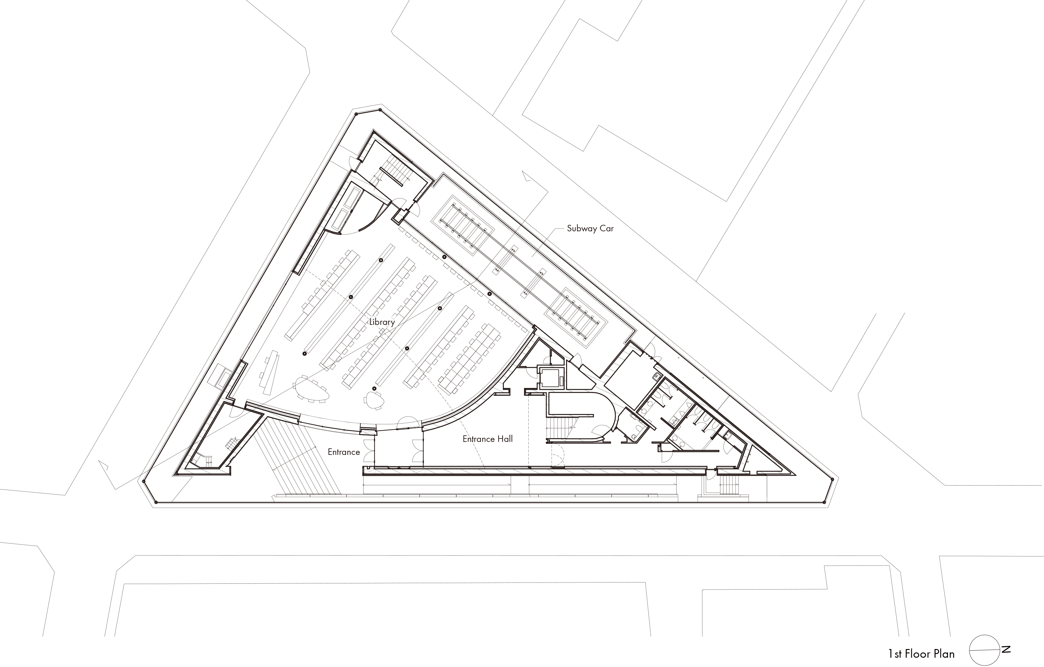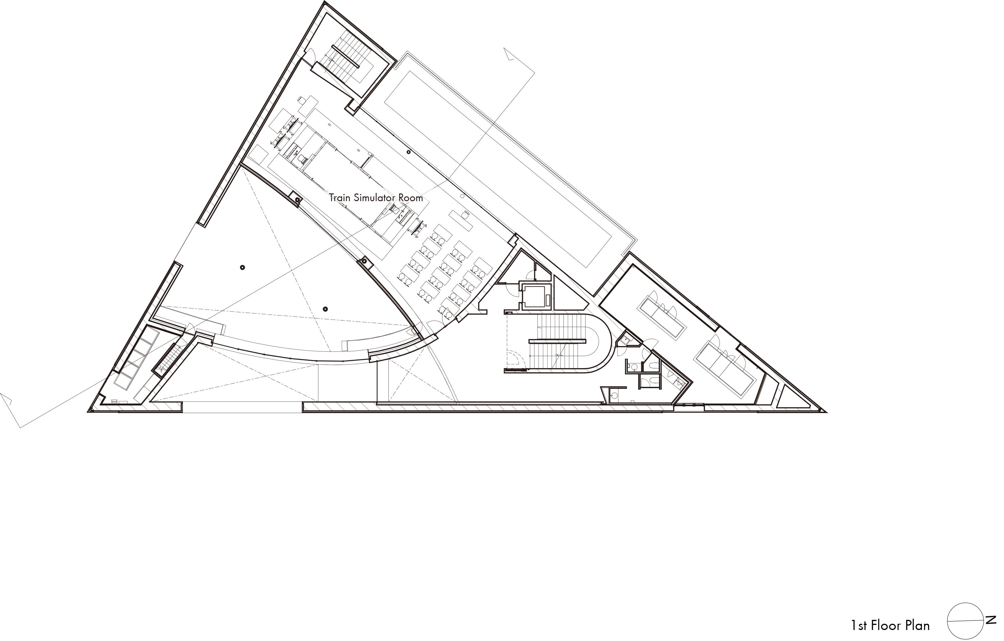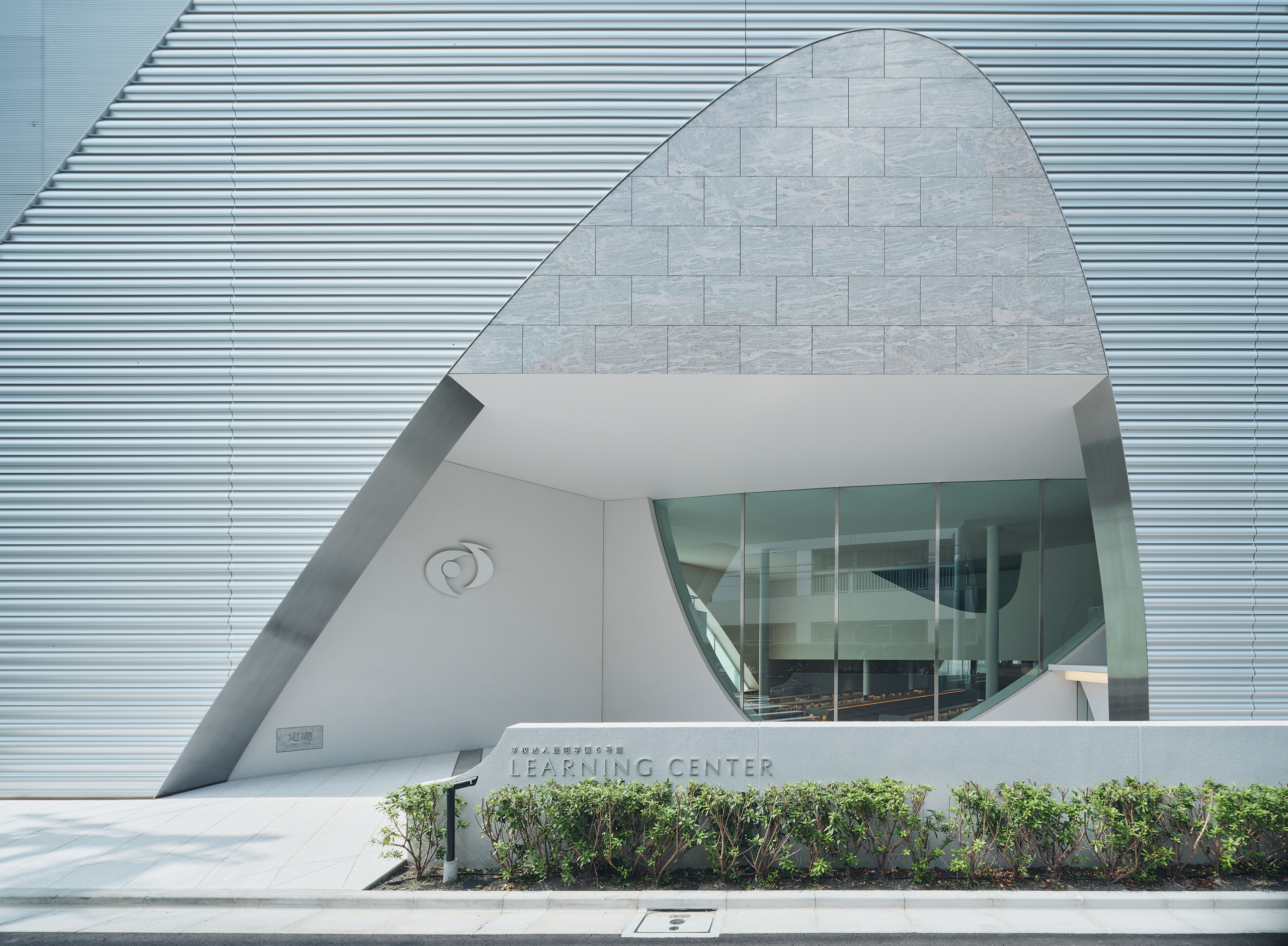 Building 6 Learning Center sits on a triangular site. The core facilities, namely a 500-capacity lecture hall, a library, and a railway simulator room, are functionally arranged to be shared among the three schools. The parabolic shape (=infinitely expanding curve) employed inside and outside of the building signifies an interconnection between all schools and the city beyond the site boundary, and the school’s continuous growth in the future. The parabolic opening at the lively ground-floor library visually ties together the students’ living space and the adjacent streetscapes.