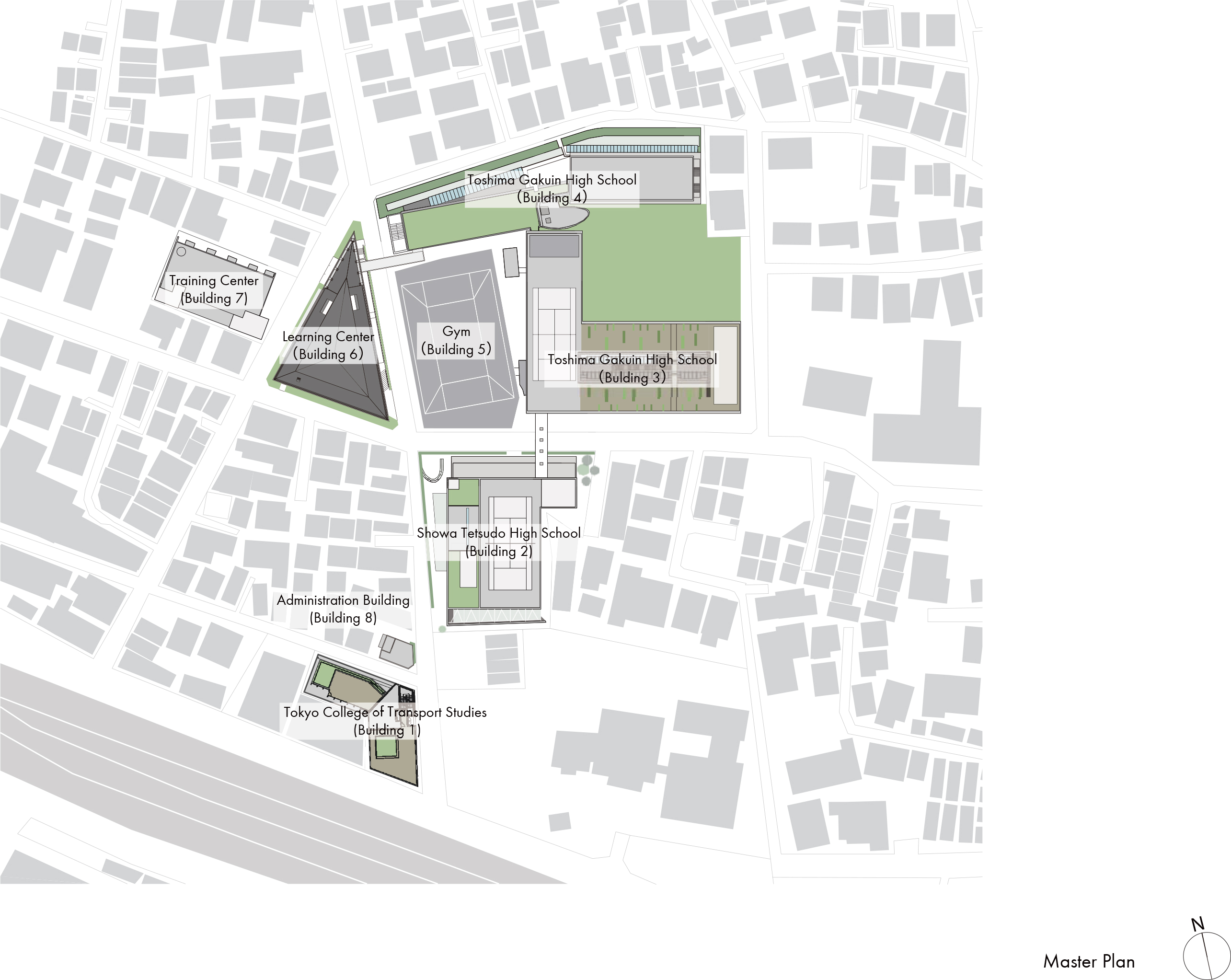 Hosho Gakuen consists of three schools: Toshima Gakuin High School, Showa Tetsudo High School, and Tokyo College of Transport Studies. For nearly three decades, Atsushi Kitagawara Architects has been involved in this extensive campus development project. This is the fifth phase of the project.
