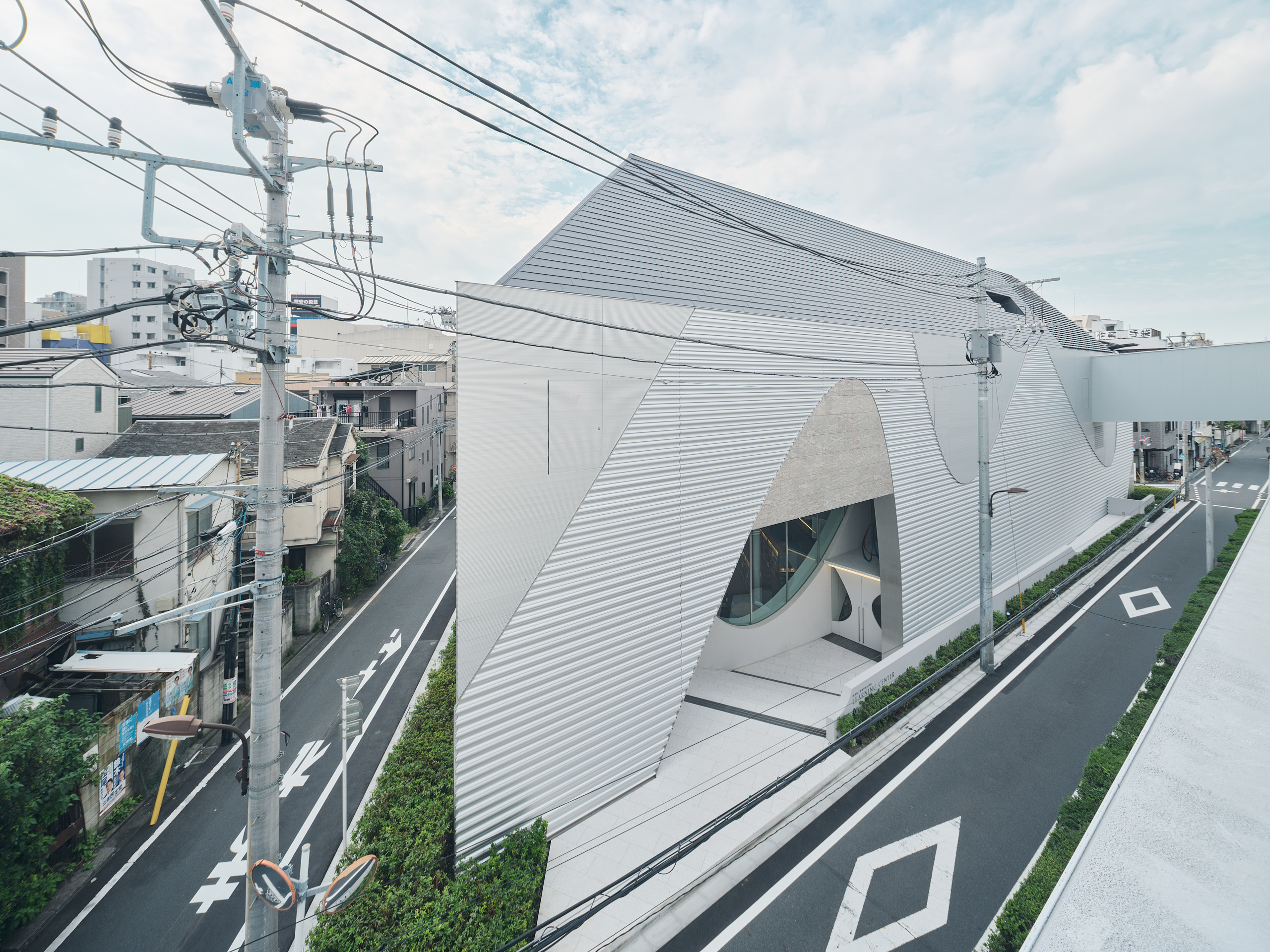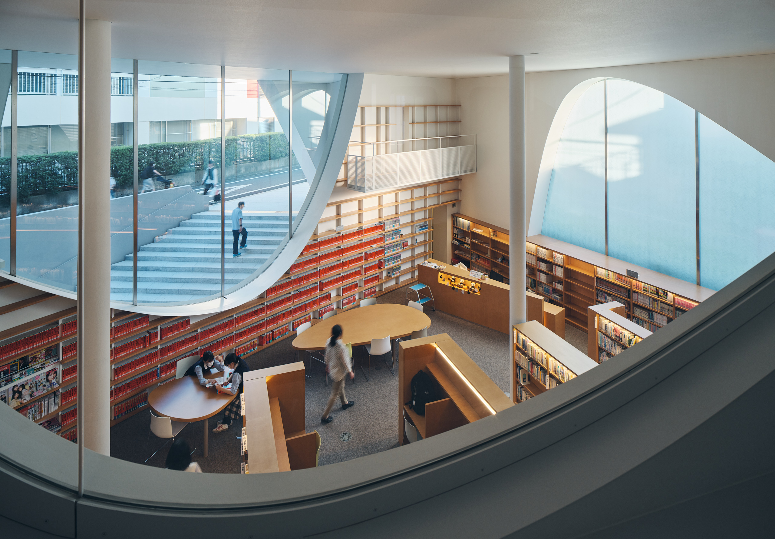 Building 6 Learning Center sits on a triangular site. The core facilities, namely a 500-capacity lecture hall, a library, and a railway simulator room, are functionally arranged to be shared among the three schools. The parabolic shape (=infinitely expanding curve) employed inside and outside of the building signifies an interconnection between all schools and the city beyond the site boundary, and the school’s continuous growth in the future. The parabolic opening at the lively ground-floor library visually ties together the students’ living space and the adjacent streetscapes.