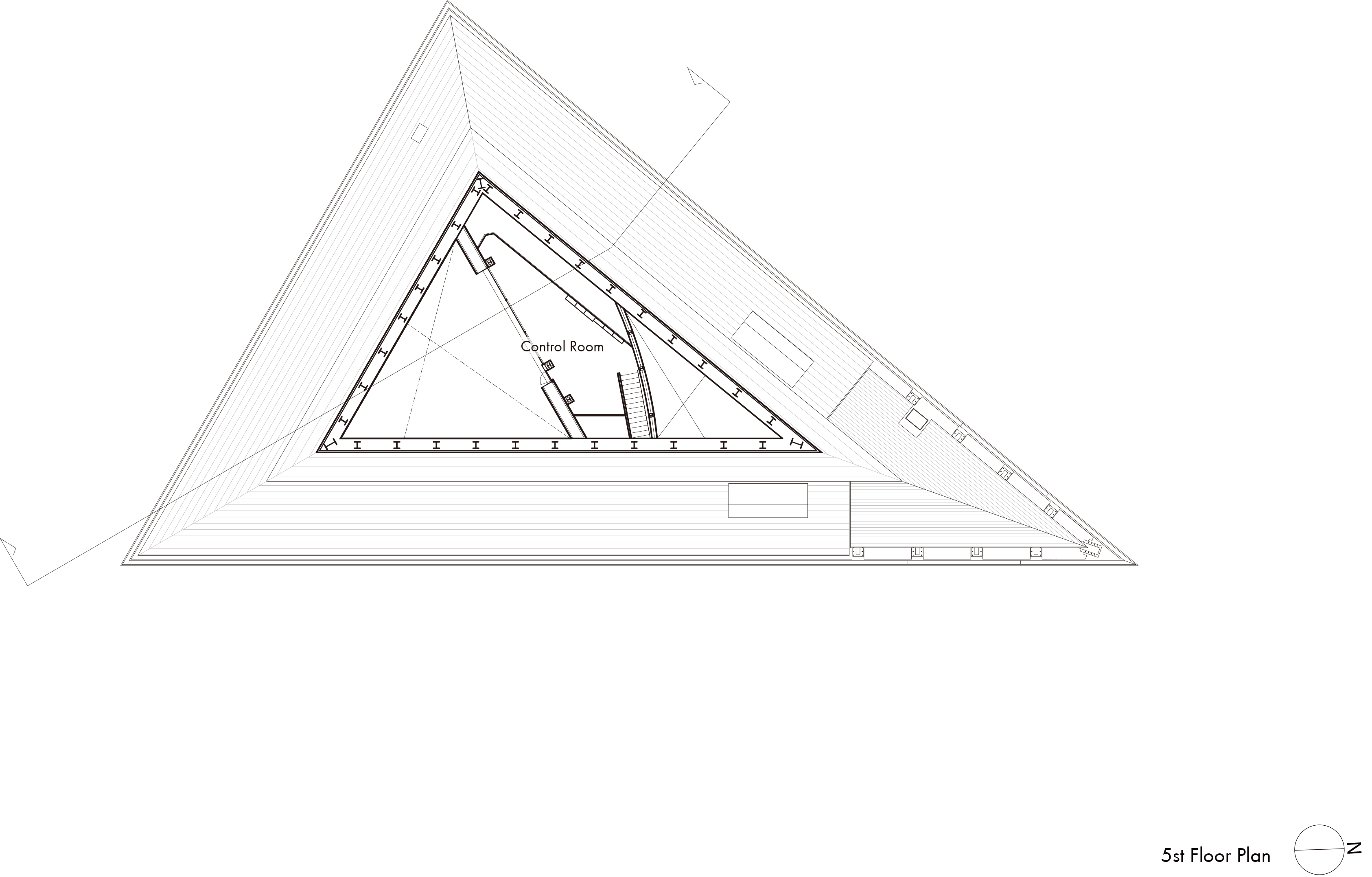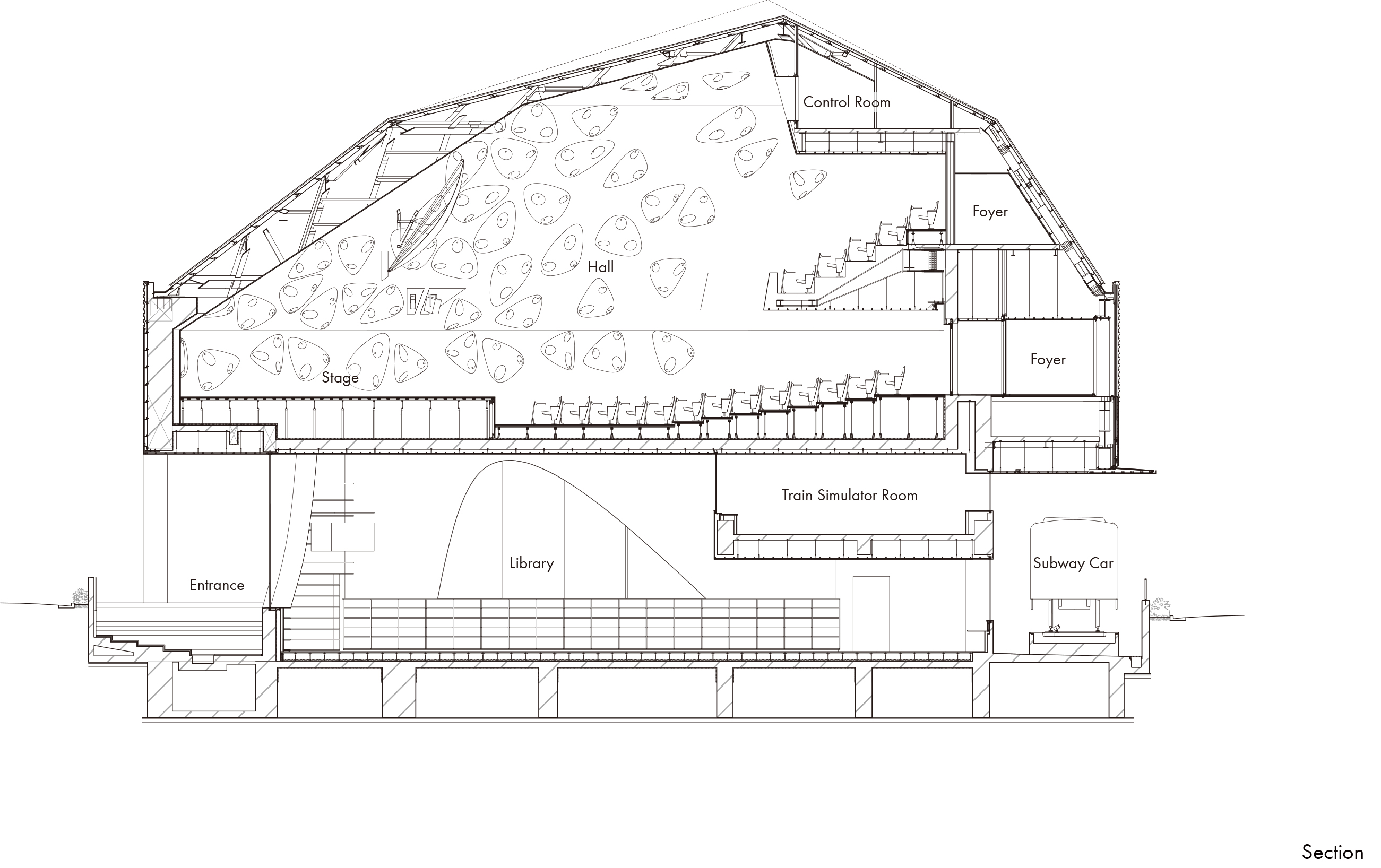 The lecture hall is designed under an expansive mansard roof defined by the diagonal lines of the street. Its outer shell mirrors the shape of the roof, resulting in an asymmetrical and distorted pyramidal shape. To balance out the complex form, dark walls are selected using acoustic panels cast from custom-made FRP molding. These acoustic panels are carefully laid out to diffuse sound and achieve an optimal sound environment.
