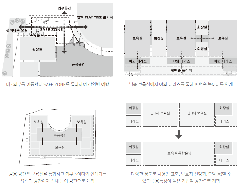 어린이집이란 어린이가 처음 만나는 사회적 공간이다. 그곳에서 경험하는 자유 참여와 스스로 놀기는 어린이의 신체 발달과 창의성 그리고 상상력을 발달시키며, 자라나는 ‘움직이는 공간’이 된다. 단순히 어떤 어린이가 되어야 하는 것을 가르치는 장소가 아니라, 각각의 어린이가 어떤 존재인지 어른들이 이해하고 함께 성장하는 공간이어야 할 것이다. 어린이집의 놀이 공간은 성장을 위해 아주 효과적인 장소로서 제공되어야 한다. 어린이는 등원하는 순간부터 어린이집이라는 공간을 하나의 ‘놀이 공간’으로 인식한다. 따라서 어린이집의 건축 디자인은 어린이 스스로가 놀이 방법을 찾고 그 경험을 통해 상상력과 창의력을 재미있게 기를 수 있는 공간 즉, 건축과 놀이가 통합된 디자인을 지향해야 한다. 이를 위해 ‘놀이와 안전’의 맥락에서 네가지 기본 계획의 아이디어를 설정하였다.