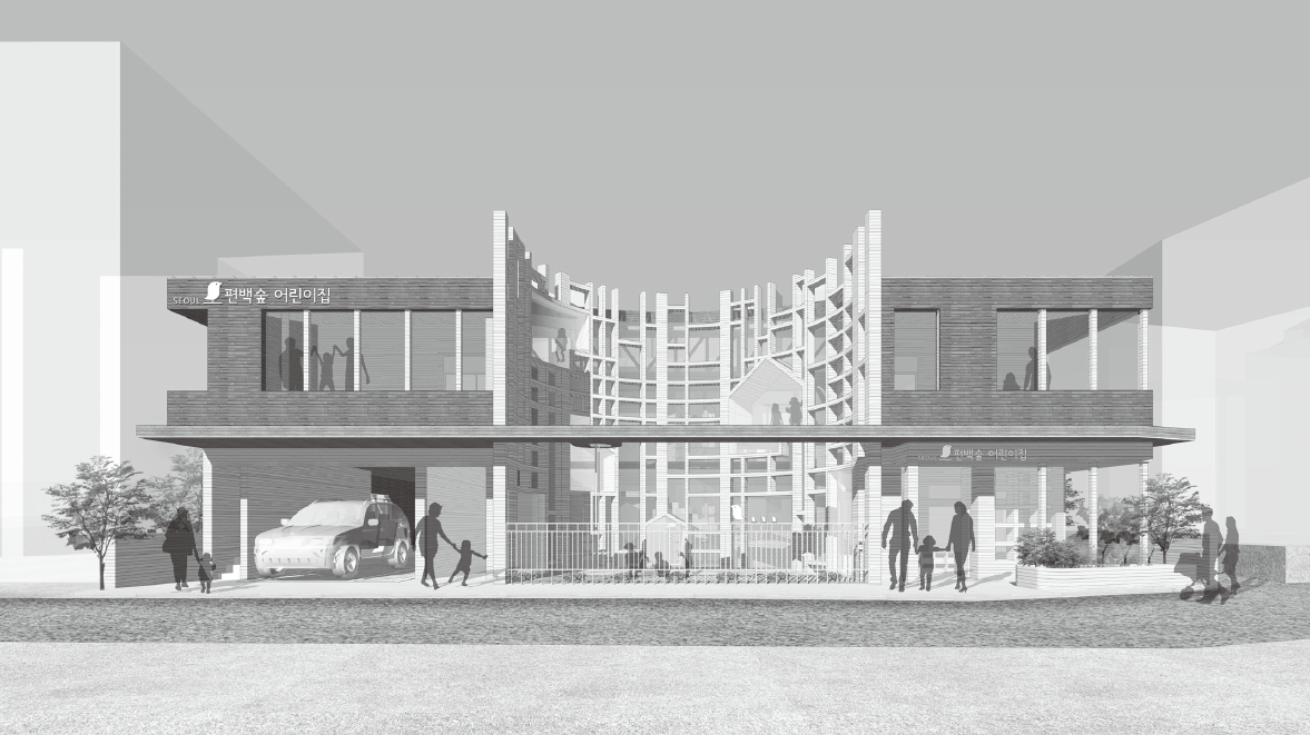 어린이집이란 어린이가 처음 만나는 사회적 공간이다. 그곳에서 경험하는 자유 참여와 스스로 놀기는 어린이의 신체 발달과 창의성 그리고 상상력을 발달시키며, 자라나는 ‘움직이는 공간’이 된다. 단순히 어떤 어린이가 되어야 하는 것을 가르치는 장소가 아니라, 각각의 어린이가 어떤 존재인지 어른들이 이해하고 함께 성장하는 공간이어야 할 것이다. 어린이집의 놀이 공간은 성장을 위해 아주 효과적인 장소로서 제공되어야 한다. 어린이는 등원하는 순간부터 어린이집이라는 공간을 하나의 ‘놀이 공간’으로 인식한다. 따라서 어린이집의 건축 디자인은 어린이 스스로가 놀이 방법을 찾고 그 경험을 통해 상상력과 창의력을 재미있게 기를 수 있는 공간 즉, 건축과 놀이가 통합된 디자인을 지향해야 한다. 이를 위해 ‘놀이와 안전’의 맥락에서 네가지 기본 계획의 아이디어를 설정하였다.