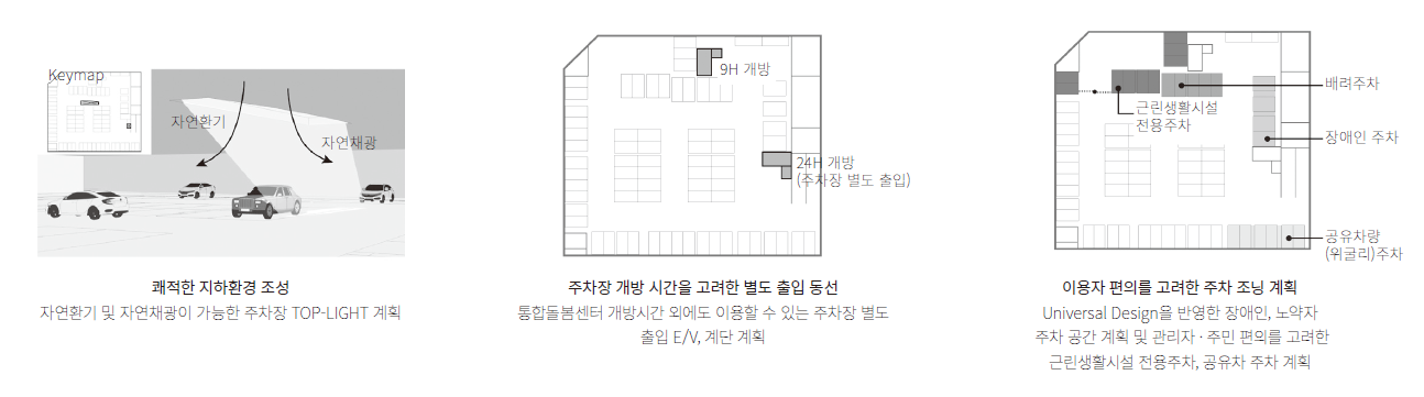 대상지는 1980년대 후반에 추진된 1기 신도시에 위치하여 오래된 주거지 사이에서 최소한의 복지시설의 역할을 담당했다. 이번 공모를 통해 주변에 부족한 주차, 복지시설, 공원녹지 공간을 제공하고자 한다. 대상지 주변의 학교와 저층주거지, 한라마을, 덕유마을을 이어주는 마을 마실길을 통하여 1, 2층에 위치한 각각의 마당들과 정원을 통해 주민들끼리 소통할 수 있는 공간을 제공하고, 내부 프로그램 시설과 연계하여 각각의 공간에서 휴식하고 즐길 수 있는 휴게 공간을 제공하였다. 또, 복합시설임을 고려하여 각각의 이용자들이 사용할 수 있는 별도의 동선을 제공하여 어디에서나 쉽고 편하도록 계획하였다.