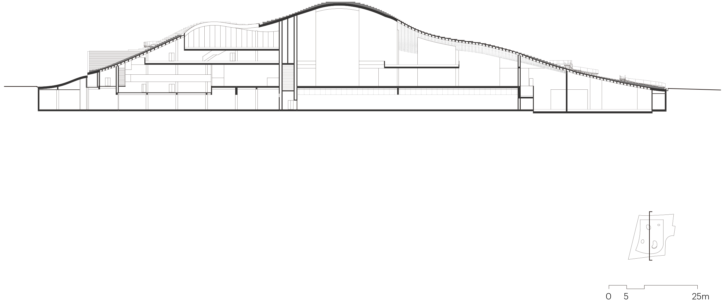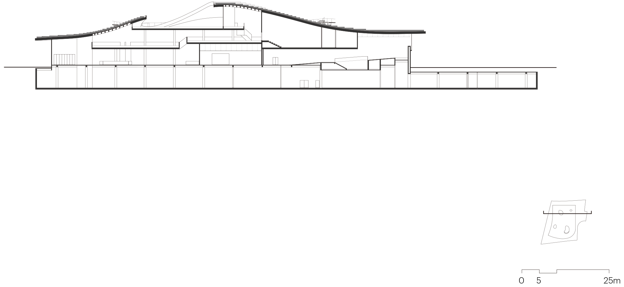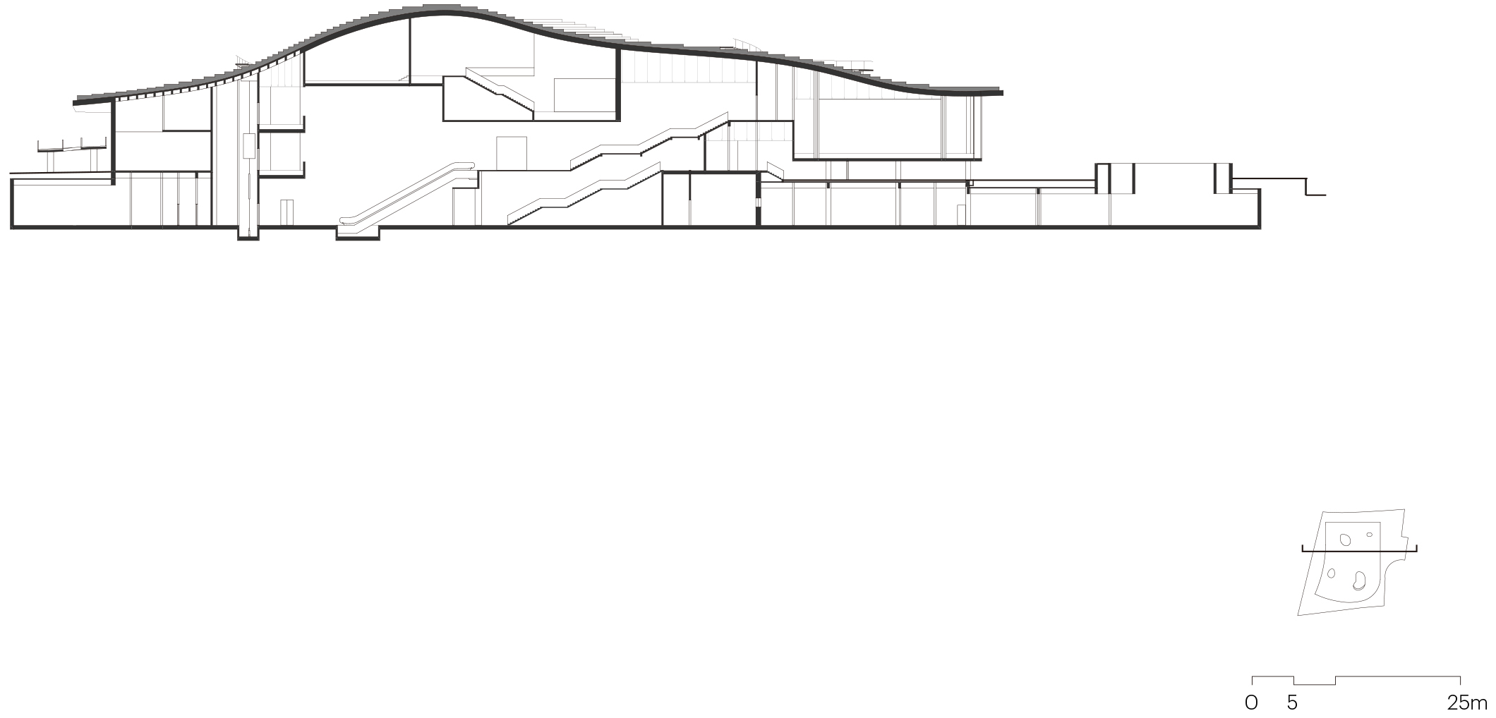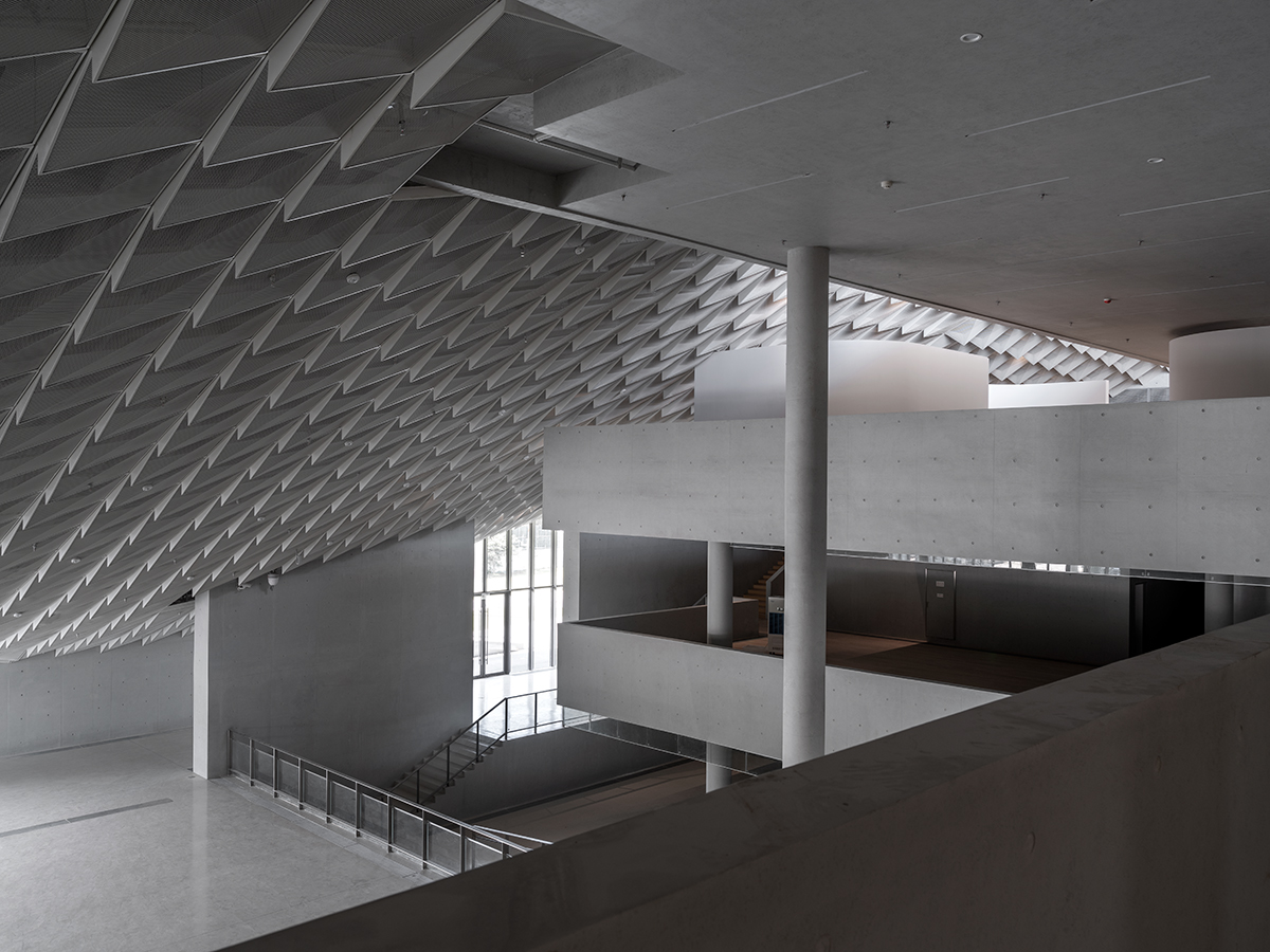 The main hall, together with the undulating roofscape, creates a unique space for exhibition. The space of the exhibition uses floating exhibition walls, and there is no longer a set circulation for visiting the exhibition. The walls are both surfaces for exhibiting, as well as the structure for the undulating roof. The exhibition spaces for contemporary art, modern art, classical art, as well as for special exhibitions, could be independently accessed, or sequentially linked, having great functional flexibility.
