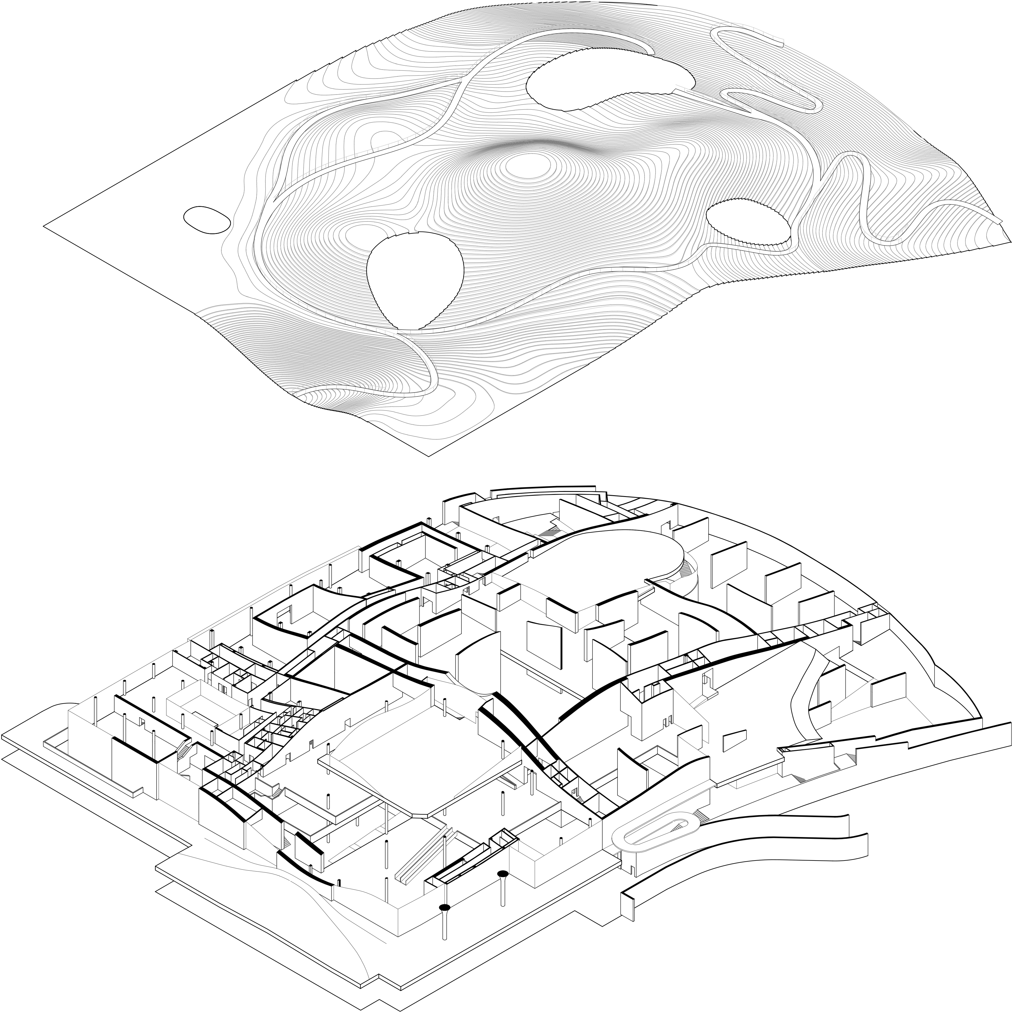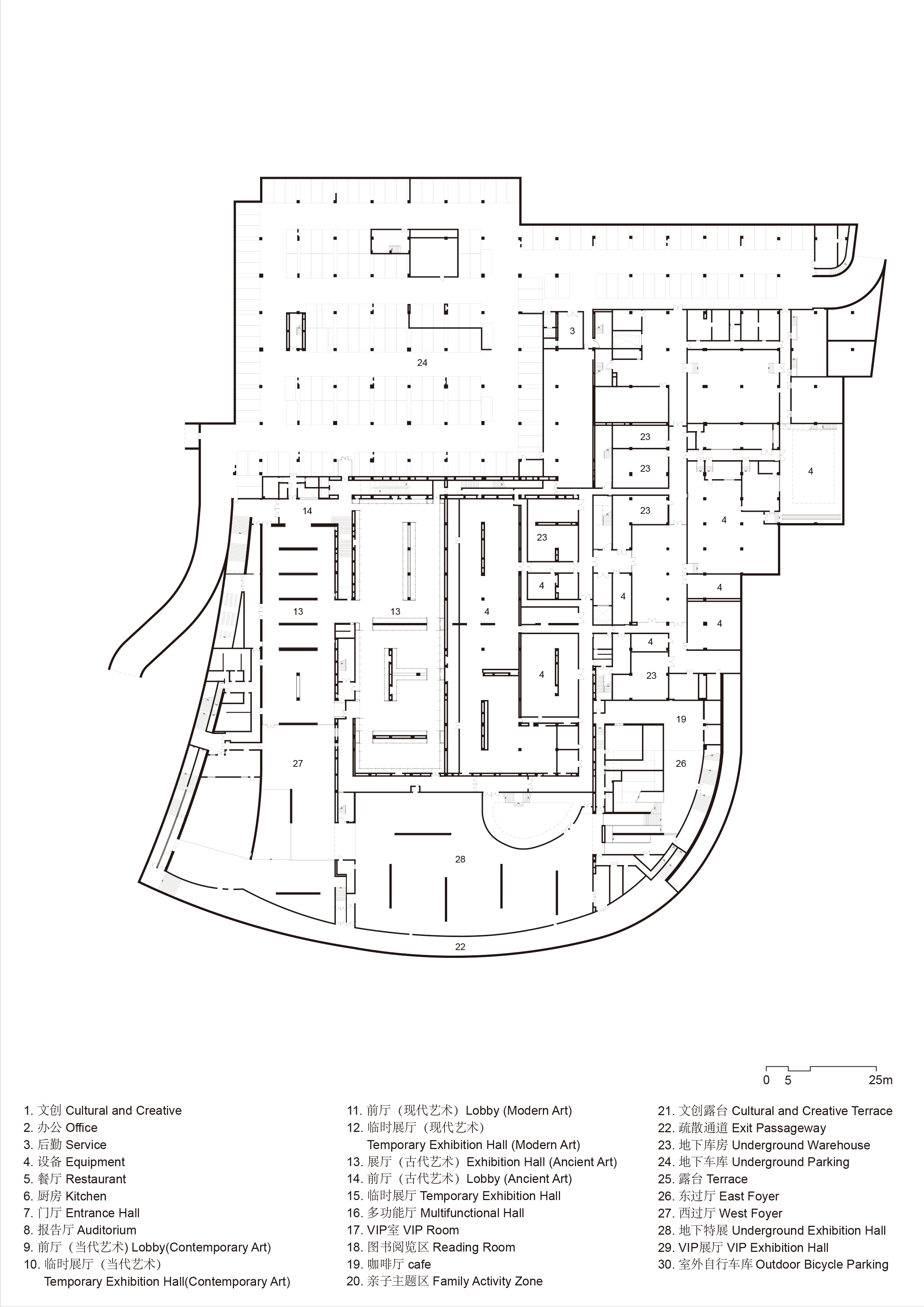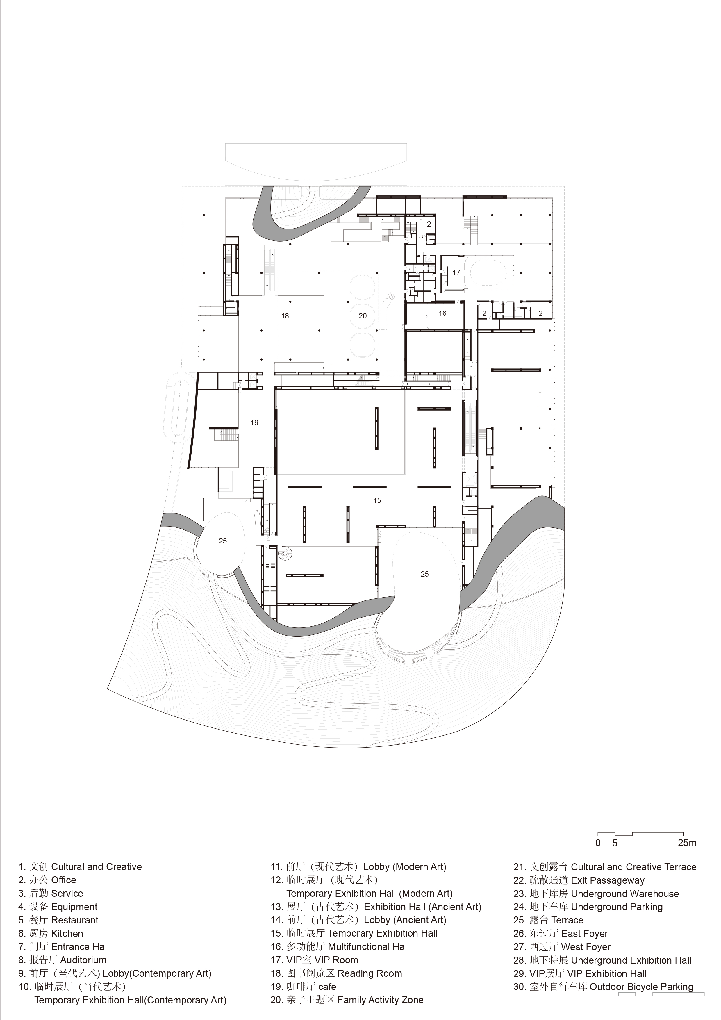 The main hall, together with the undulating roofscape, creates a unique space for exhibition. The space of the exhibition uses floating exhibition walls, and there is no longer a set circulation for visiting the exhibition. The walls are both surfaces for exhibiting, as well as the structure for the undulating roof. The exhibition spaces for contemporary art, modern art, classical art, as well as for special exhibitions, could be independently accessed, or sequentially linked, having great functional flexibility.
