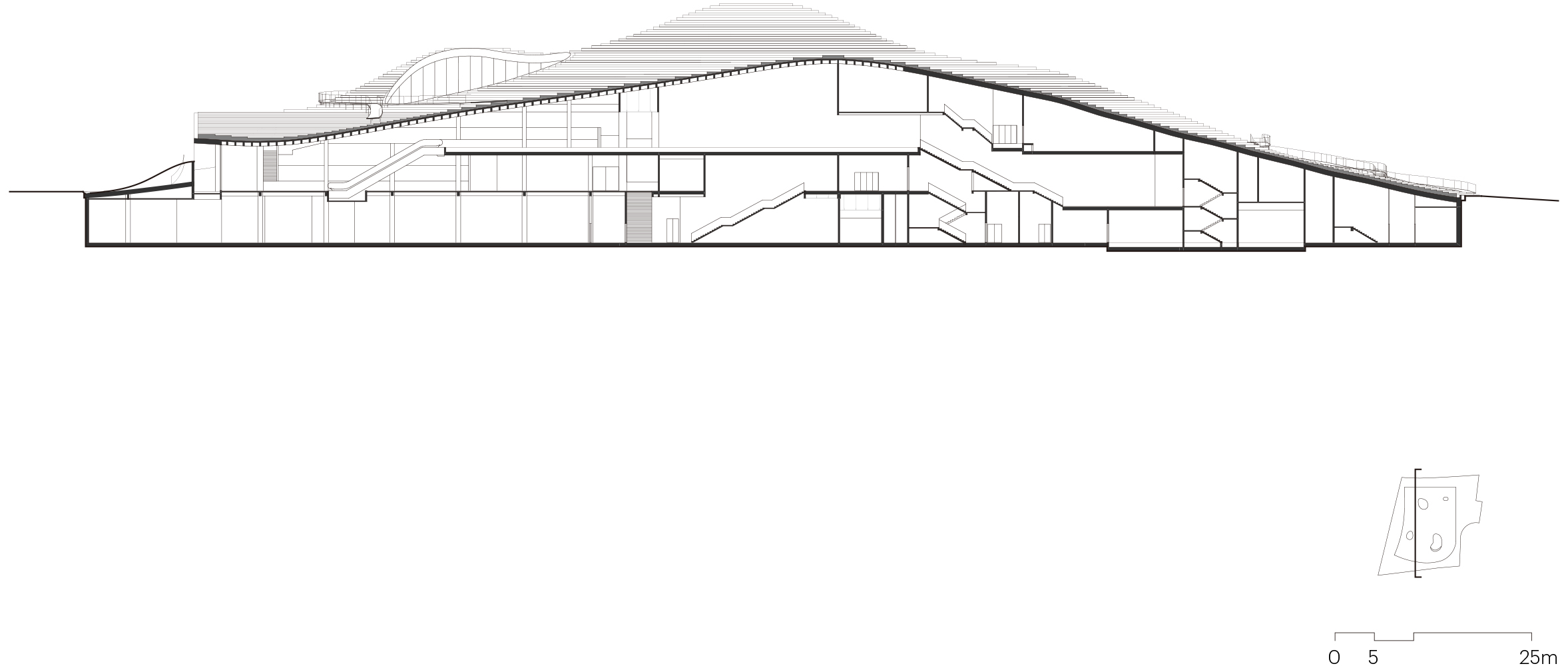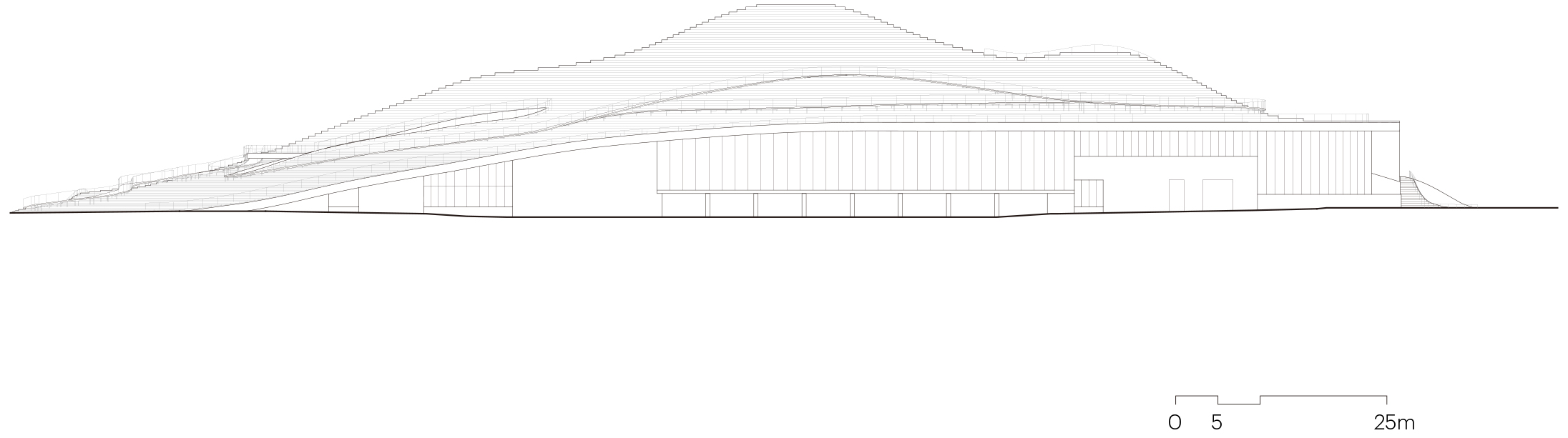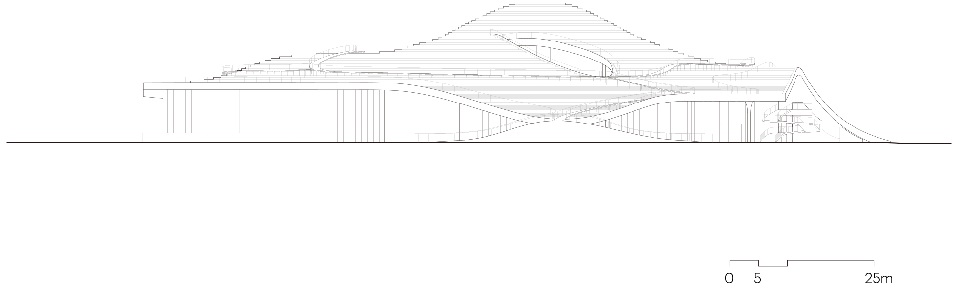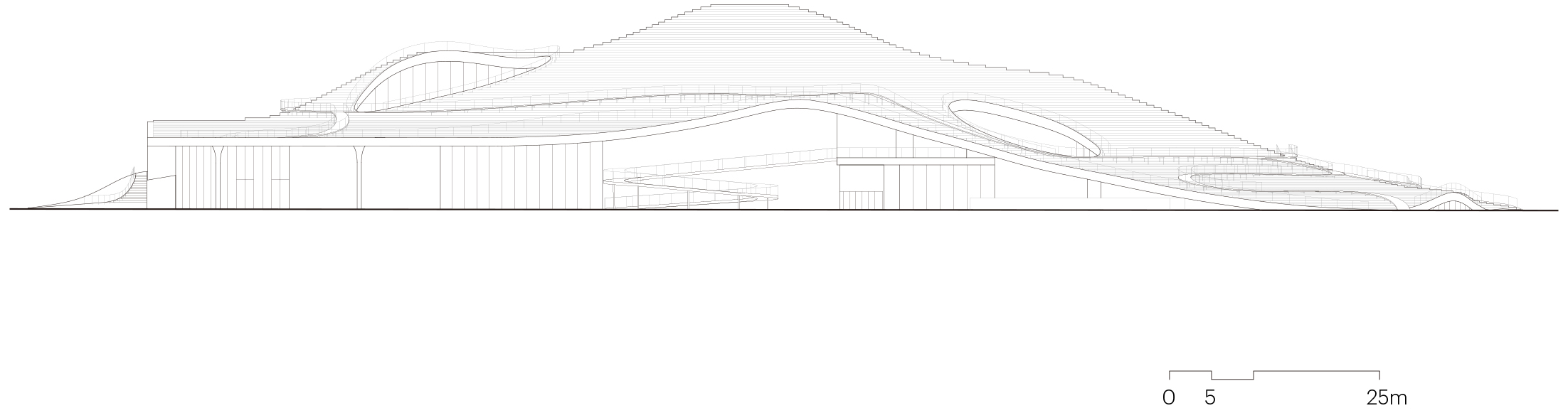 The undulating roof is formed by an abstract stepped terrace following topographic contours. The risers of the steps are lined using silver metallic surface, while the treads are covered with white stones and low vegetation, traversed by winding planked walking paths. These rooftop paths are entirely open to the public, connecting to the Moon Lake, as well as the exits of the museum exhibition spaces, the space for public education, the art shop, the café, and the other public spaces. Thus, they form a public space framework independent from the exhibition spaces of the museum. The activities of the public are part of the architectural surface.
