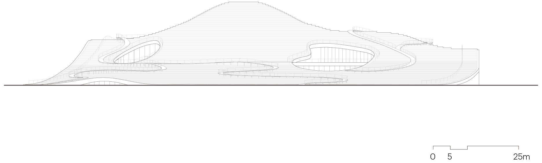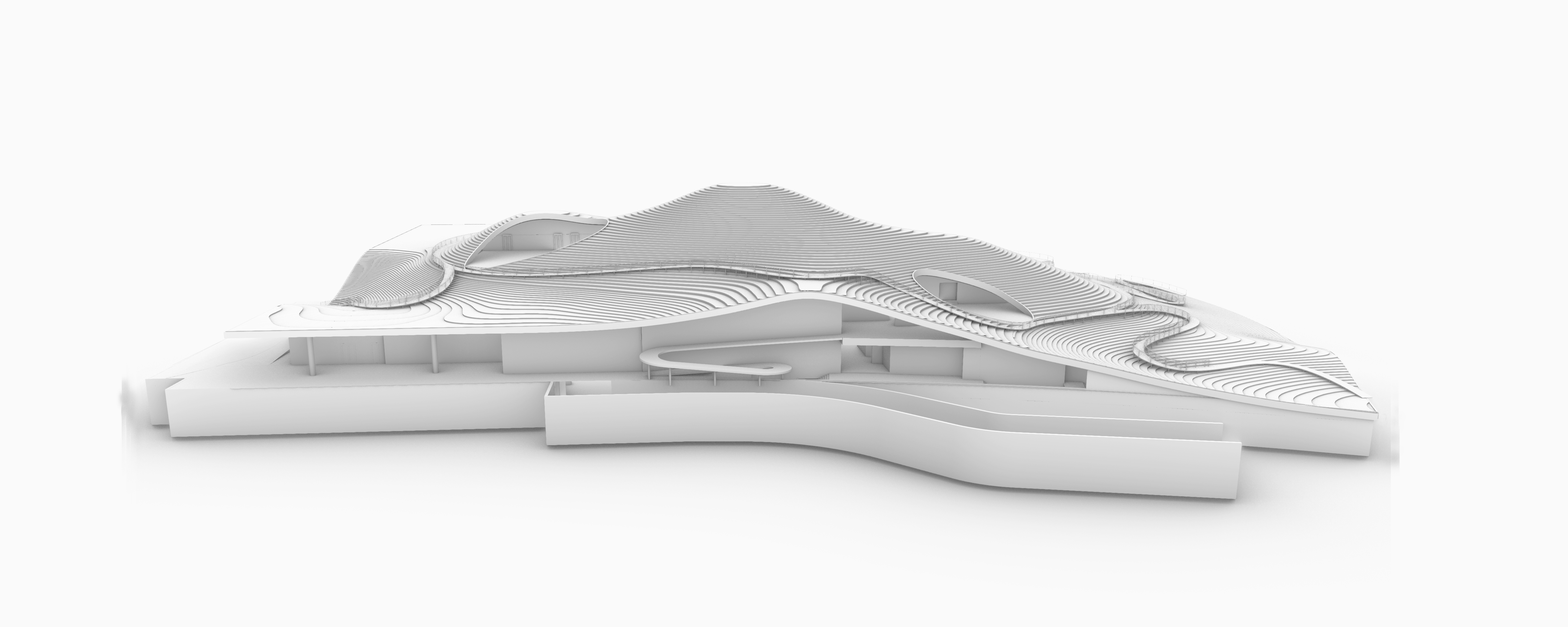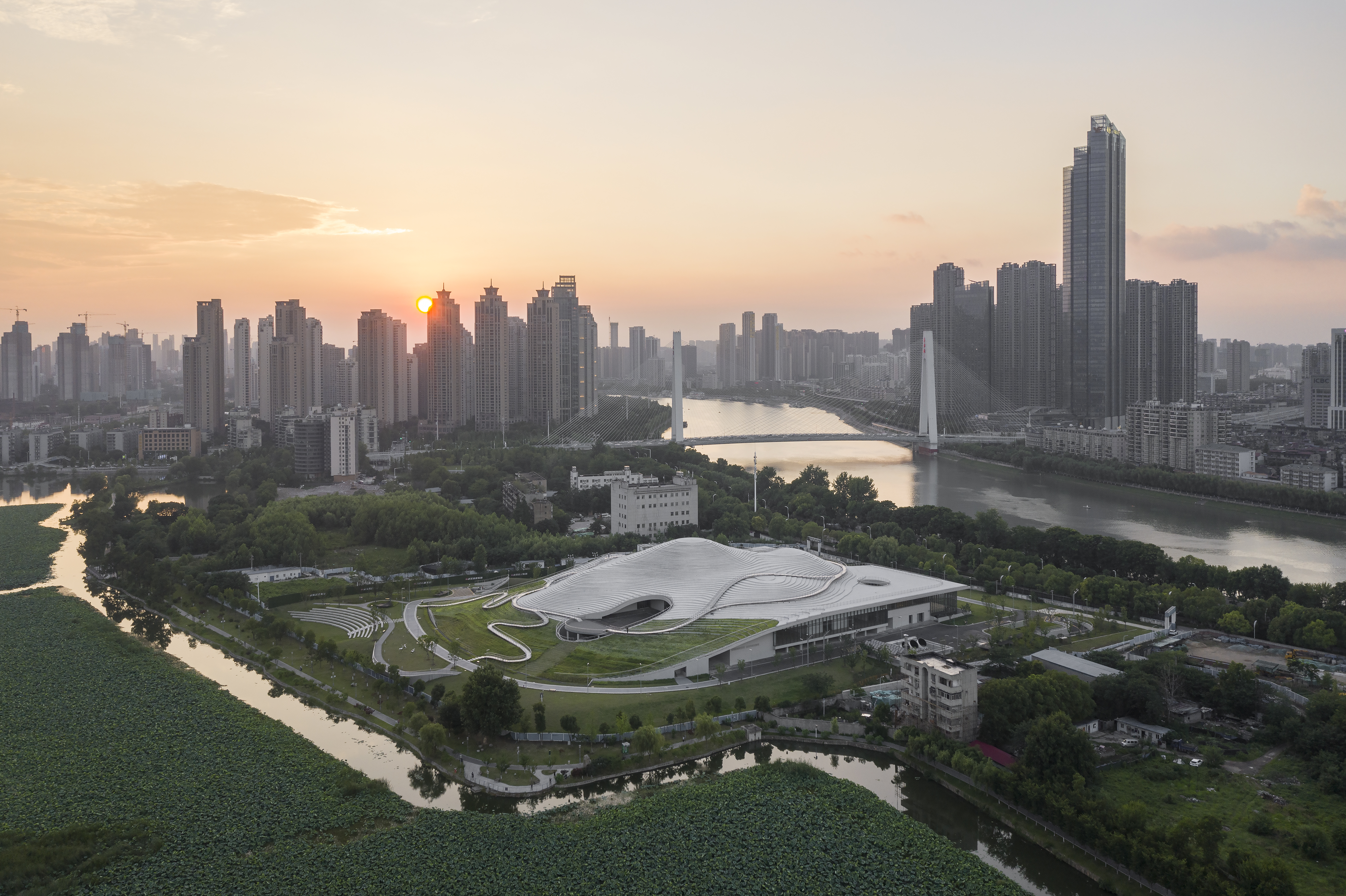 Qintai Art Museum is located on the lakeside of the Moon Lake in Wuhan’s Hanyang district, facing the Meizi Hill across the lake to the south. In order to reduce the weight of the architectural mass on the natural surface of the lake, the form of an undulating natural terrain is used in the direction of the lake, while sinking part of the exhibition spaces underground. This both uses the underground space, and also minimizes the massing on the ground. On the side facing the city road, on the other hand, a vertical facade continues to uphold architecture’s urbanity.