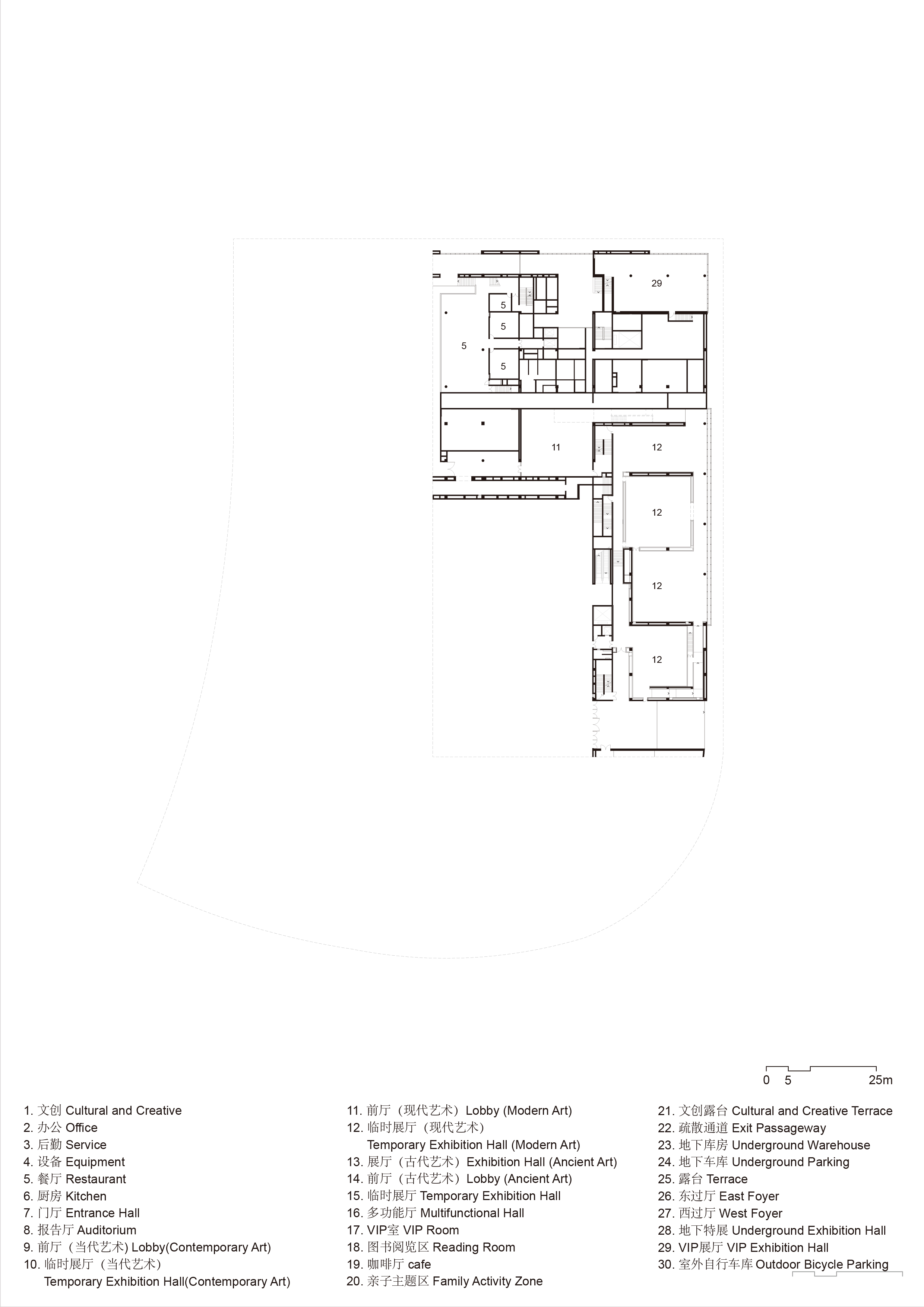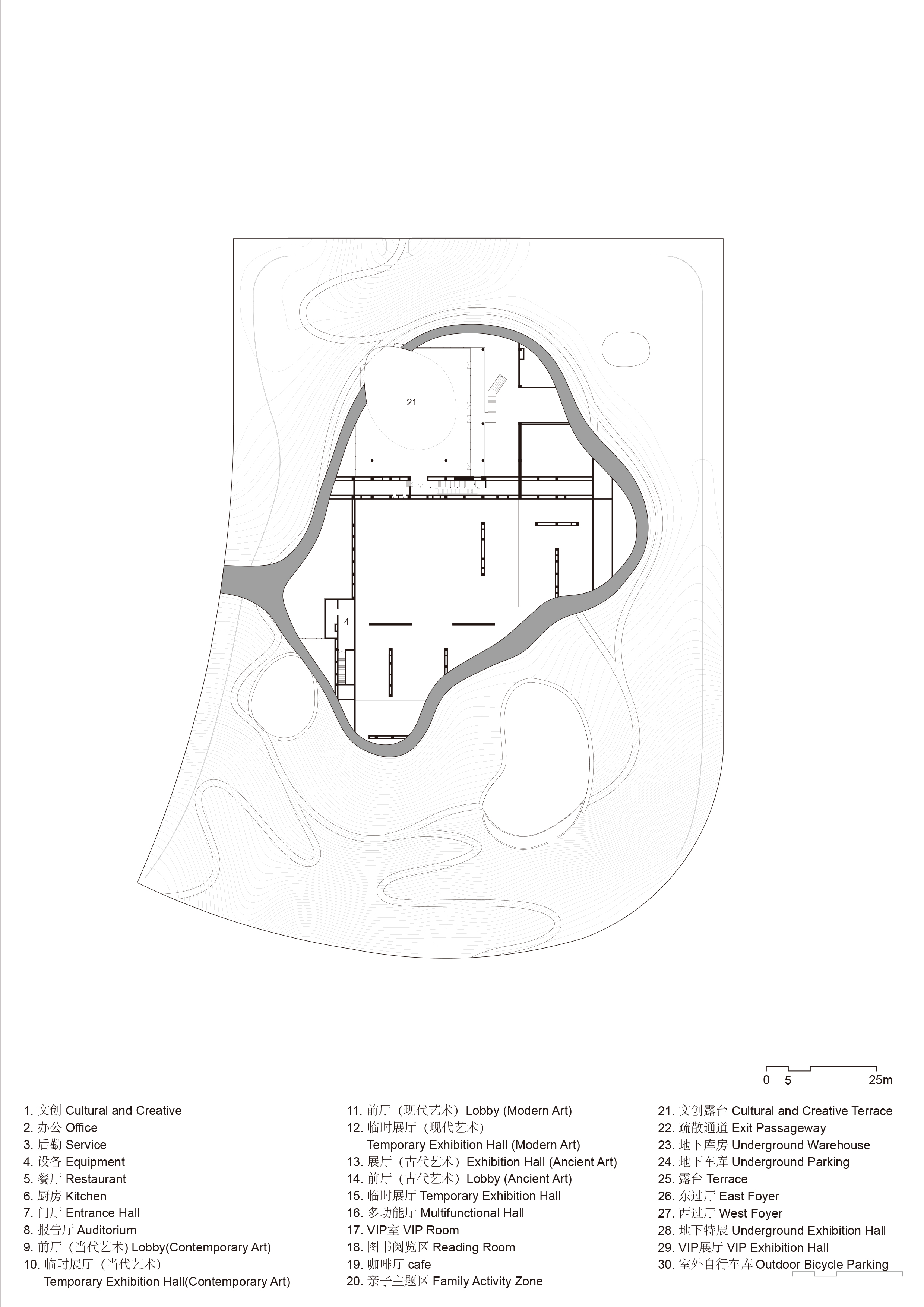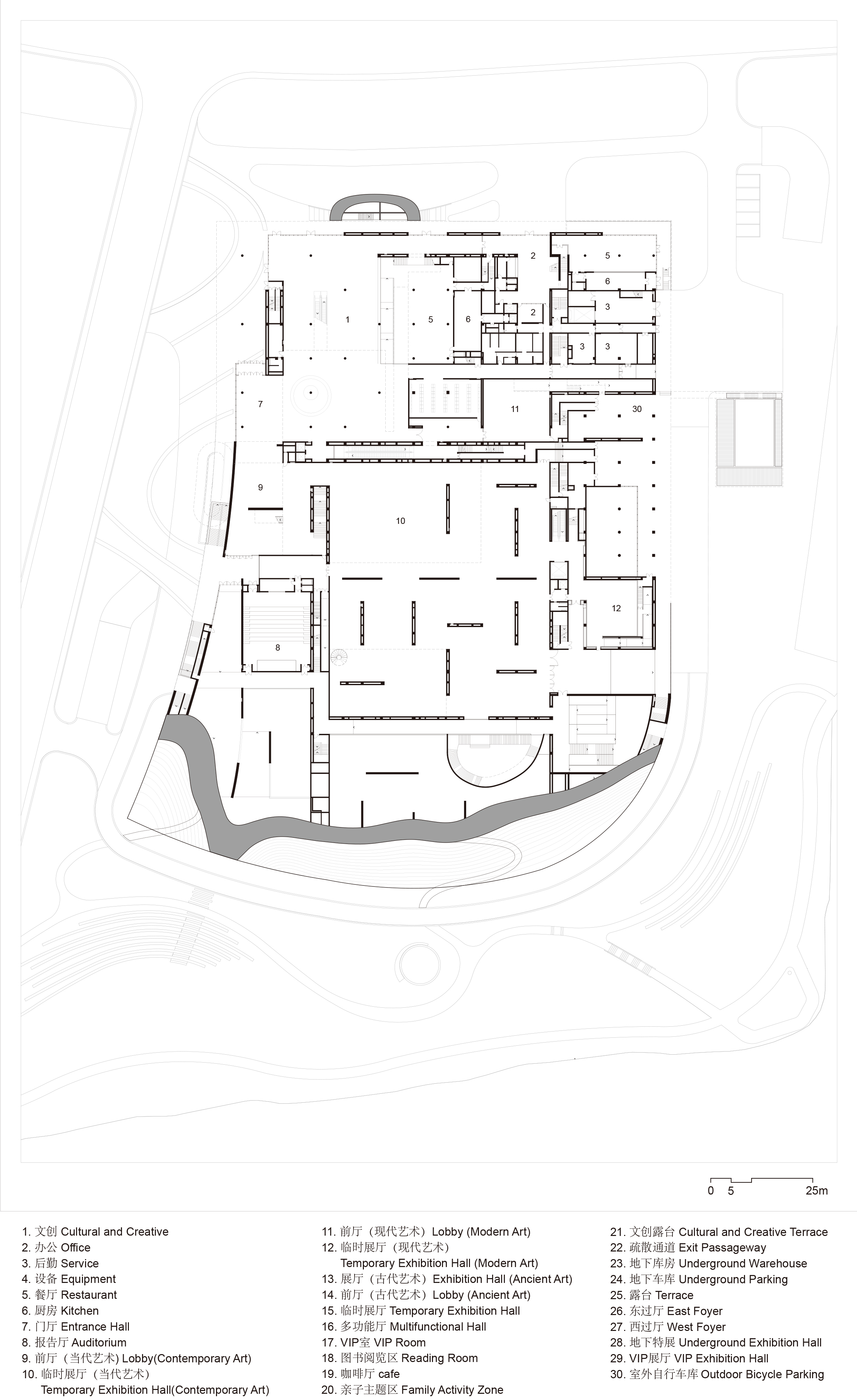 The art museum architecture as intervention has redefined the urban space on the south bank of Moon Lake. To the west of the museum the space is reserved for an urban plaza, interacting in the future with the Wuhan Library and Drama Centre under planning. The main entrance to the museum, as well as the programs with strong public tenets including the Creative Cultural Spaces, are all placed on this side, where a subtly inwardly-curved façade together with the place create a sense of enclosure. From the plaza there are ramped paths linking to the second floor café and rooftop terrace, establishing a public circulation that could still operate after the museum closes. Operationally, this strengthens the openness of the museum and the urbanity of the architecture.