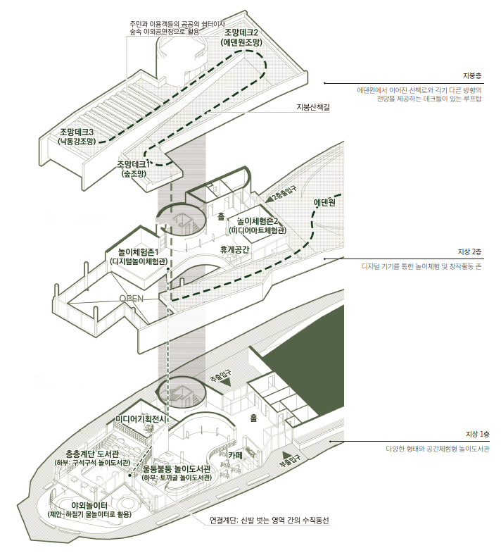소설 ‘이상한 나라의 앨리스’의 주인공인 앨리스는 몸이 커졌다가 작아지면서 각기 다른 공간을 경험한다. 이는 바꿔 말하면 공간의 형태가 달라진 것과 같은 의미를 가진다. 다른 형태의 공간에서 앨리스는 각기 다른 경험을 하고 다른 감정을 느낀다. 이처럼 다양한 공간의 형태는 아이들에게 다양한 행위와 흥미를 유발하고, 그러한 공간적 체험은 사고의 확장에 영향을 미친다. 경직된 도서관이 아닌 자유로운 형태로 독서와 놀이가 가능한 어린이 도서관은 독서에 대한 친밀도를 높이게 될 것이다. 부지가 위치한 도심 속 녹지 공간이 가지는 자연의 지형은 본 프로젝트의 공간 형태의 모티브가 되었다.