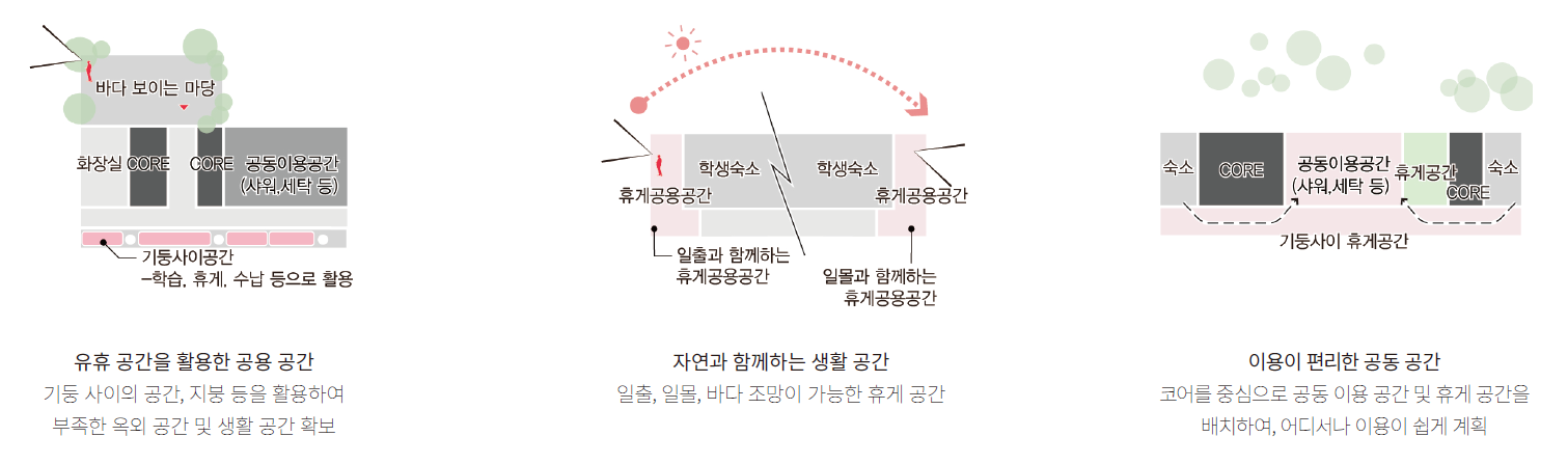 청소년들이 건축물 안에서도 풍성한 외부 공간을 최대한 교감하고 함께하기를 바라며 내외부 공간이 유기적으로 연결된 다층적 공유 공간을 계획했다. 층별로 건축물을 둘러싼 공유 공간이 있고, 공간마다 다채로운 자연환경을 즐길 수 있게 계획했다.
