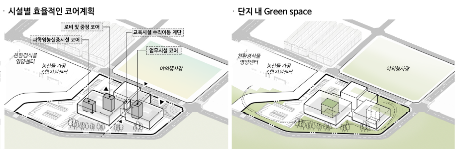 건물의 각 시설과 기존 단지의 기능별 조닝을 연장하기 위해 휴게마당, 운동마당, 진입마당, 야외행사장과 연계한 이벤트마당 등 외부공간을 계획하고 남향배치와 중정 중심의 동선계획으로 편리하고 쾌적한 배치를 통하여 신농업 혁신타운의 상징성이 부각되도록 하였다. 건물은 [업무/연구/교육]의 기능에 따라 영역을 분리하여 시설별 개별 출입구와 개별 코어가 있는 단일형 클러스터로 계획되었고, 연구의 확장과 효율성을 위해 중정을 중심으로 각 기능이 연계되도록 내부동선을 계획했다. 5미터 이상의 층고가 요구되는 실은 데크플레이트 슬라브를 적용하여 시스템 동바리 설치 없이 시공을 가능하게하고, 업무공간 및 연구공간 벽체는 가변성 있는 시스템칸막이를 적용함으로서 공사비 절감의 효과 뿐만아니라 각 분야의 연구의 연계와 업무효율 향상을 위한 공간을 계획했다.