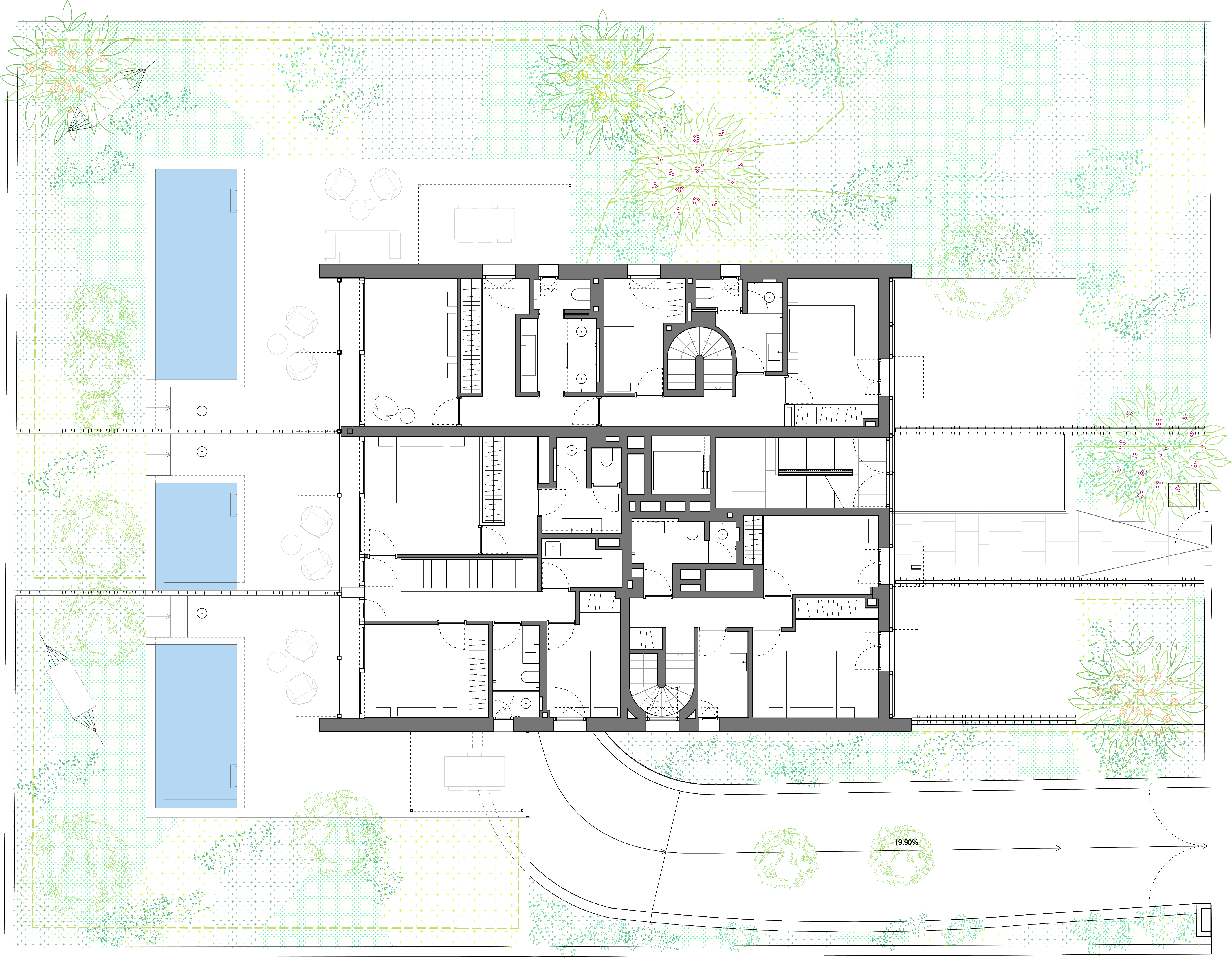 Taking full advantage of the urban planning regulations of ground floor plus three levels, the buildings have been designed so that, despite the density and limited space, each of the 12 dwellings can enjoy the suburban ideal of sustainability, energy efficiency, privacy, and even small private gardens and pools. The duplex dwellings are divided into 6 units on the ground floor with garden and pool, and 6 penthouses with rooftop pool that offer panoramic views towards Palma Bay, as well as Cala Mayor and Illetas.