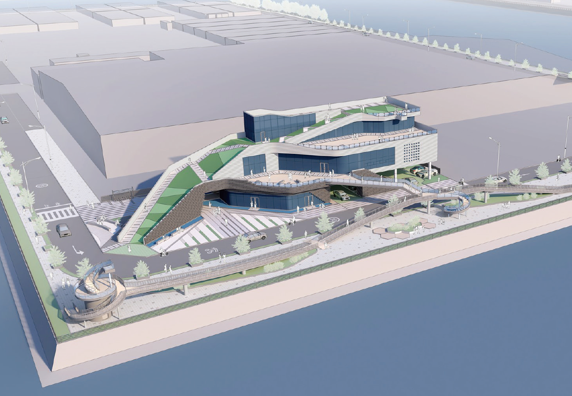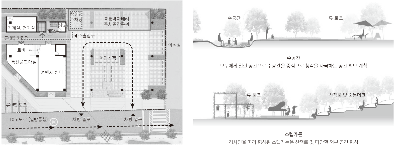 전시장, 카페, 관광 콘텐츠 등의 기능을 가지고 사람들을 맞이하게 될 이 건물은 랜드마크 역할을 지닌 보통의 건축물처럼 우뚝 솟거나, 큰 볼륨을 가지고 있지 않다. 대지 주변 해안을 따라 조성된 만석 · 화수 해안산책로의 흐름에 따라 건물을 배치하고, 그 흐름에서 파생된 다양한 동선을 제공함으로써 언제, 어디서든 바다를 조망할 수 있는 휴식처를 제공하고자 하였다.