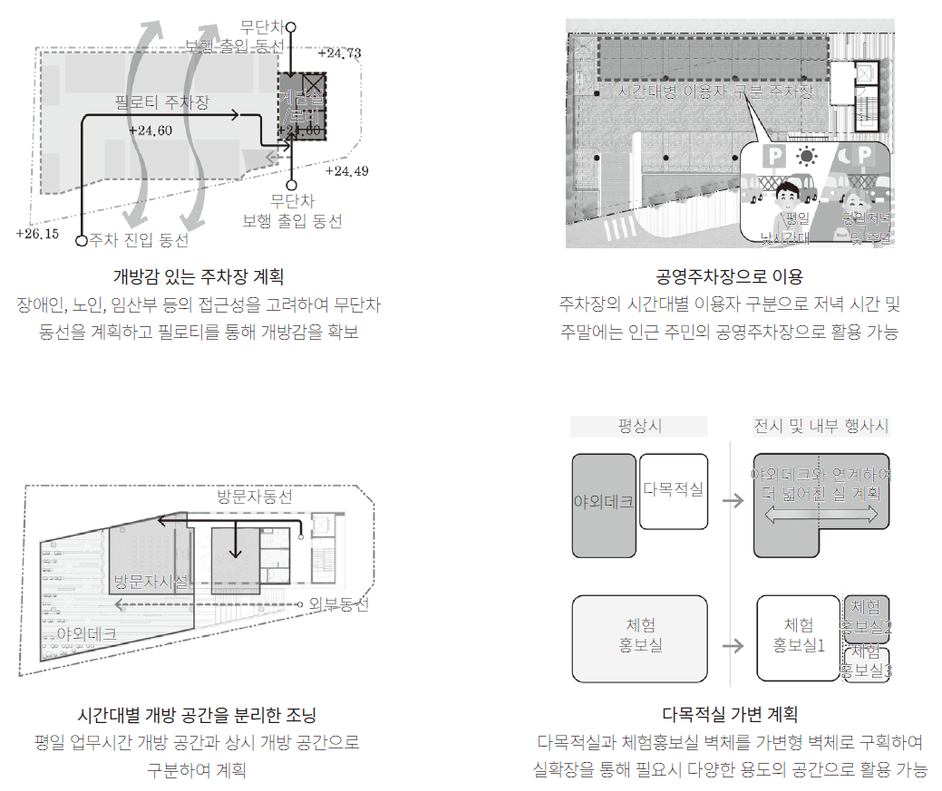 대상지는 인접한 주택가로 둘러싸여 다소 협소한 사다리꼴 형태의 대지와 1.5m의 레벨차를 가지고 있어, 건축 계획에서의 대상지의 특성을 고려할 필요가 있었다. 서측의 인접한 주택가에 주거 간섭이 우려되는 부분은 지역 주민의 주거환경을 보존하기 위해 매스를 덜어내어 최대한 이격하였다. 동측 20m 도로변으로는 보행과 차량의 진출입을 각각 분리하여 필로티를 이용한 주차 공간과 보행환경의 안전을 확보하였다. 보행 진출입구에서 지상 2층의 주민 개방 공간으로 직접 연결되는