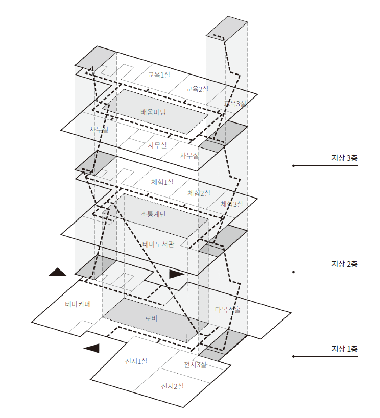 전시 · 체험 · 교육의 시작과 마무리가 중앙 소통계단에서 이루어질 수 있도록 계획하였으며, 1층 테마카페와 함께 각 층별 공용 공간에 다양한 내외부 휴게 · 소통공간을 계획했다. 공감이라는 키워드에 맞게 충청권 통일플러스센터가 지역민의 평화 통일 공감대를 확산하고, 지역 주민의 기대에 따라 흔들림 없이 평화 통일 광역 거점으로서 역할을 수행할 수 있도록 구현하고자 한다.