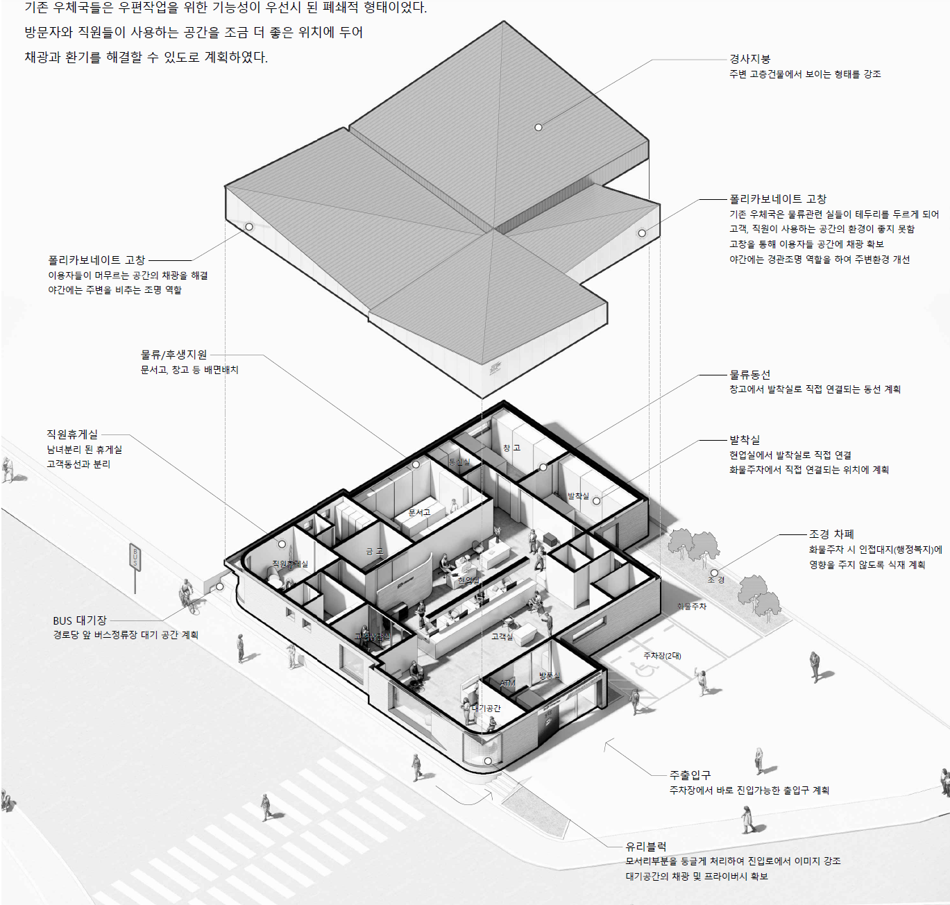 본 대지는 아파트 단지로 진입 할 때 처음으로 마주하게 되는 위치에 있다. 좌측 경로당과 우측 행정복지센터, 두 시설간 연결되는 동선을 위하여 모서리를 둥글게 처리했다. 주변 건물들에 비해 규모는 작지만, 경사지붕의 형태를 활용하여 조형성을 강조했다. 외장재료는 주민센터와의 조화를 위해 벽돌을 선택하고, 상부에는 반투명의 재질로 야간에 주변을 밝히는 조명 역할을 할 수 있도록 했다.